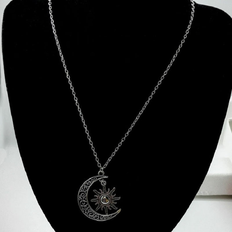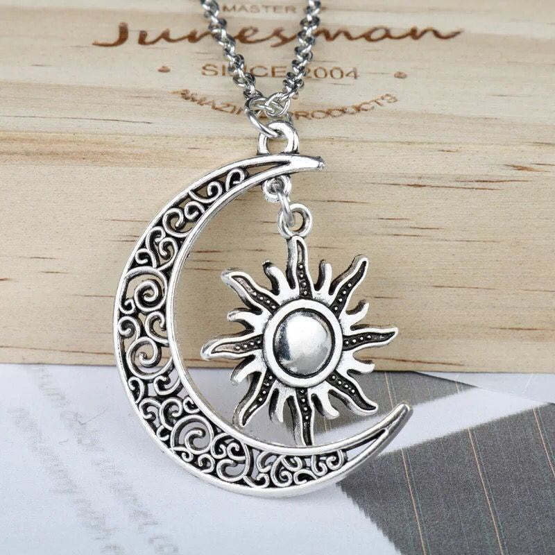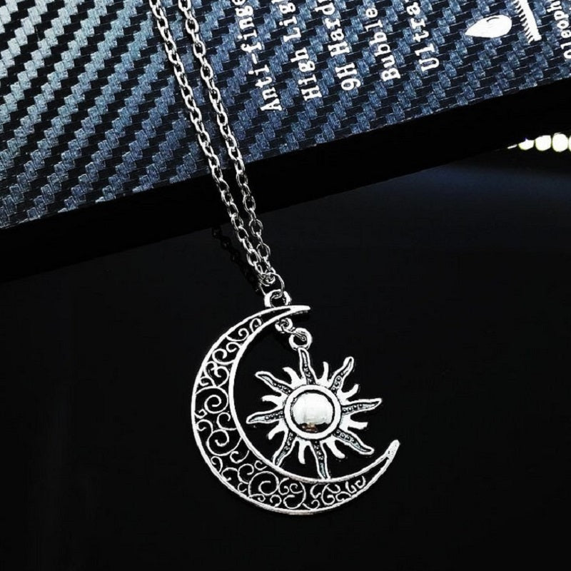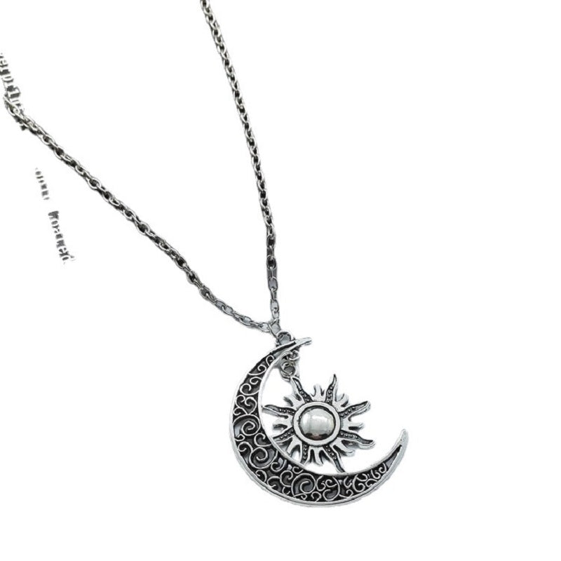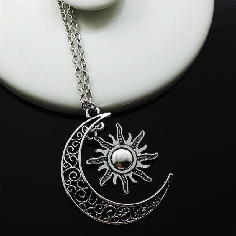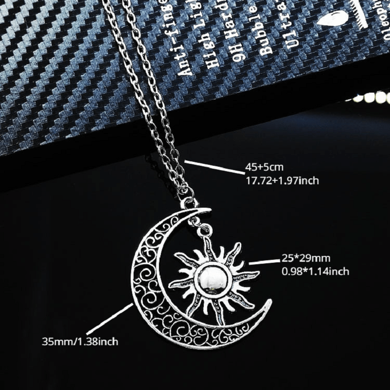 Elegant silver pendant necklace with sun and moon shapes, perfect for women and girls. Made of high-quality alloy, this necklace is a great gift idea.