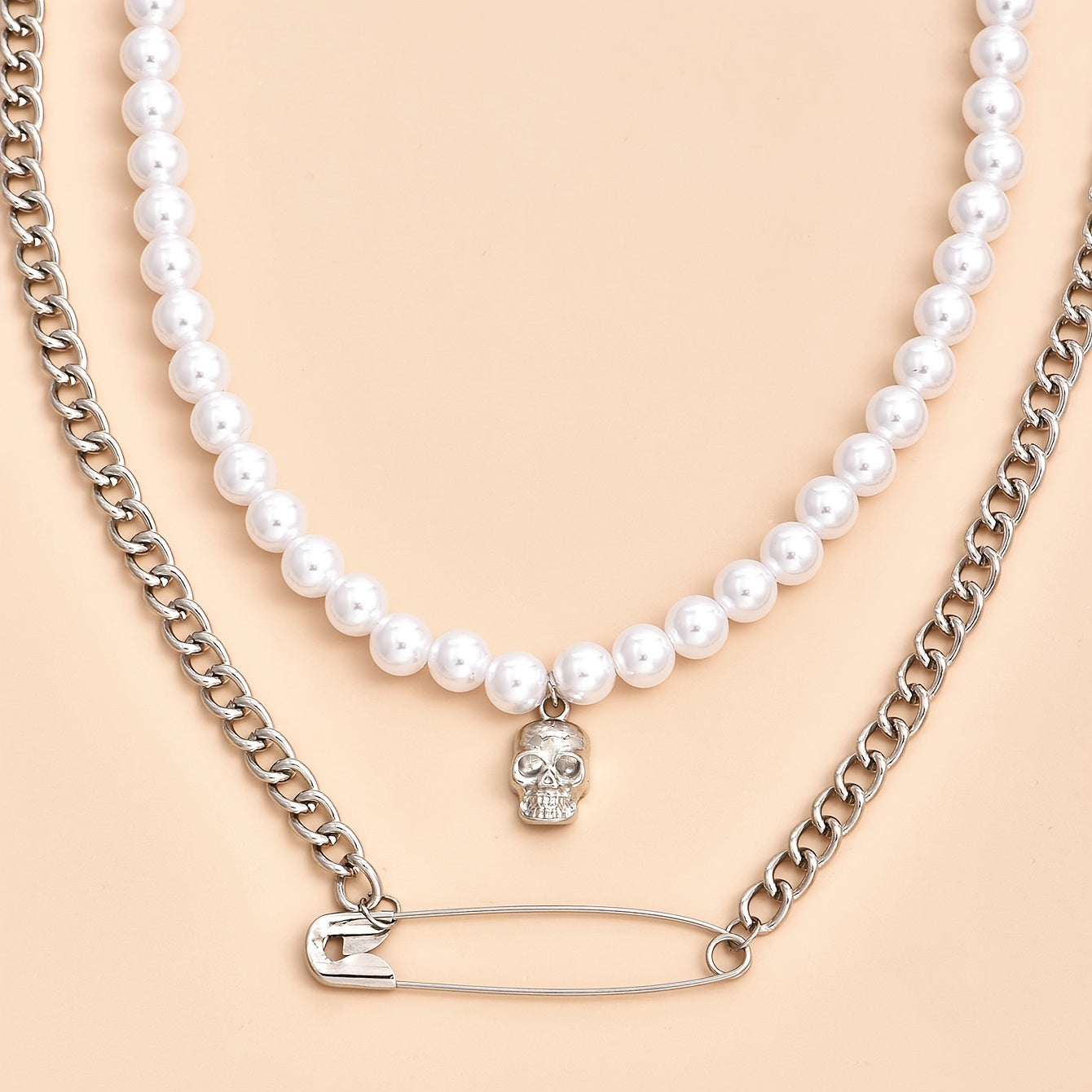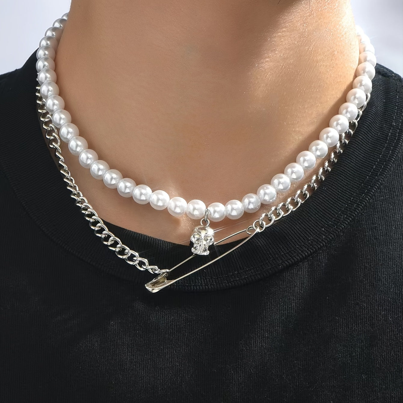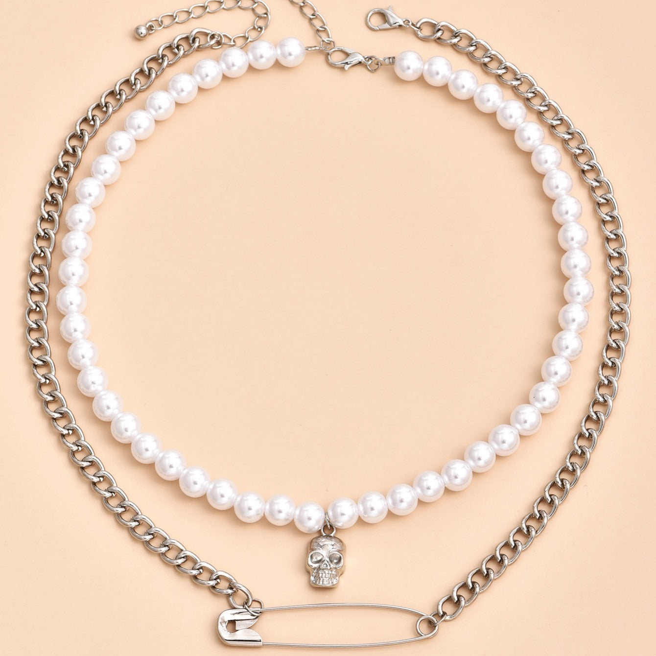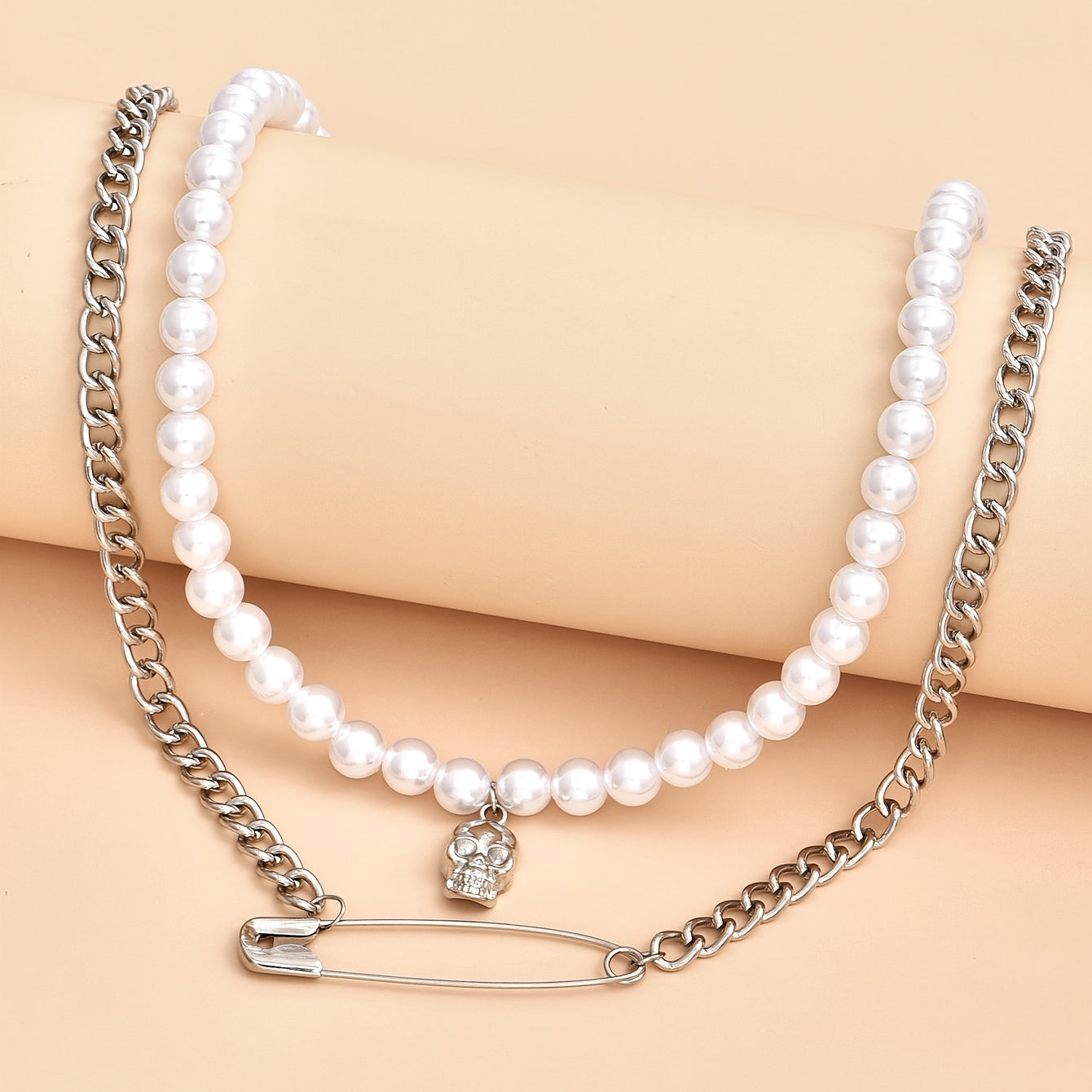 Trendy necklace features faux pearl skull charm on a beaded chain. Perfect hip hop style with paperclip charm chain. Ideal gift for fashion lovers.