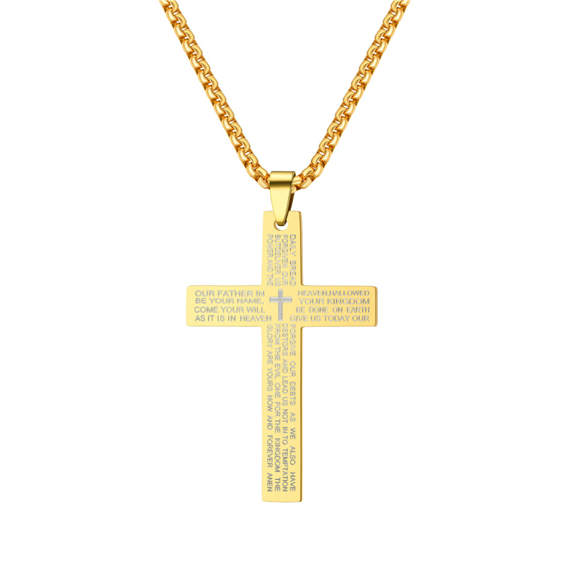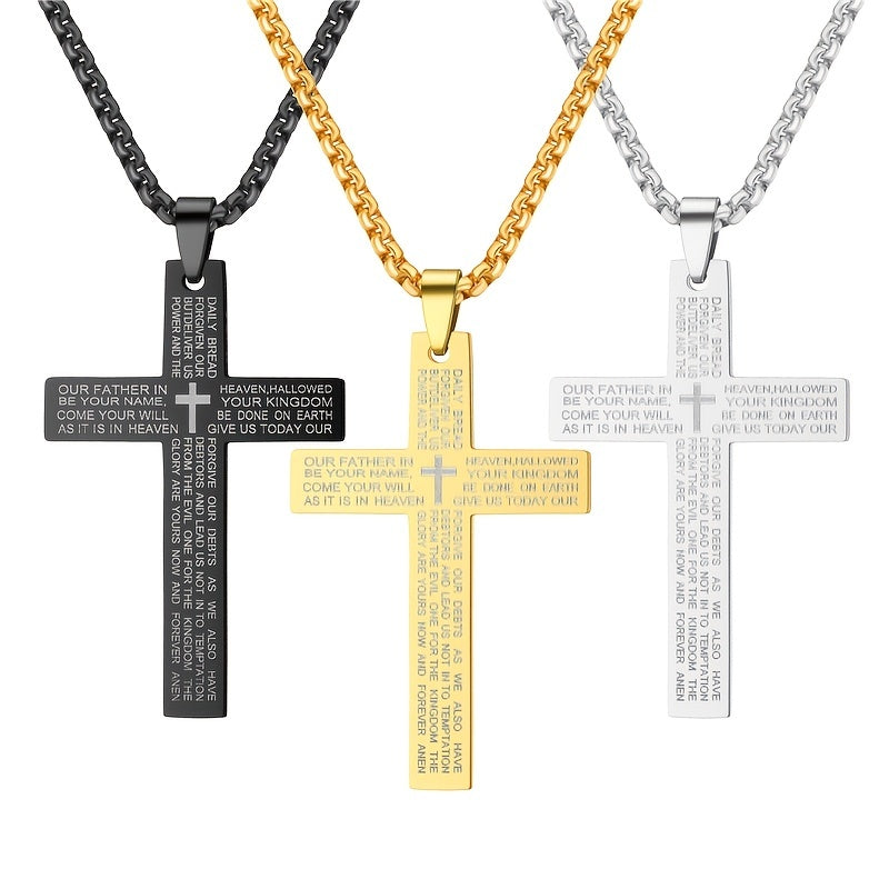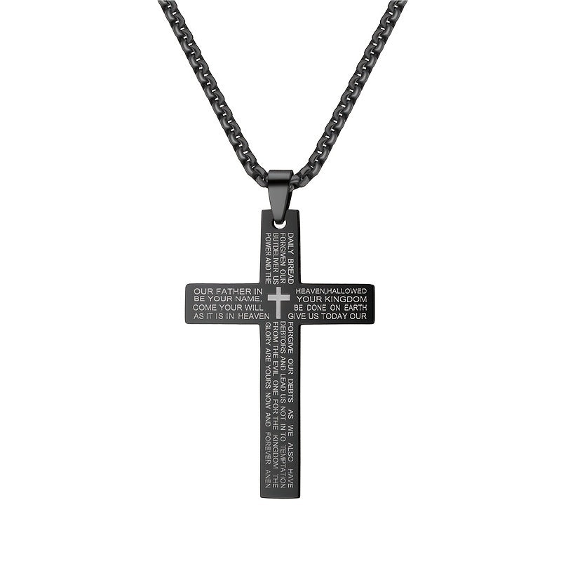 This stainless steel necklace features a Christian cross pendant with a Bible verse prayer statement. It is a religious and meaningful piece of jewelry.