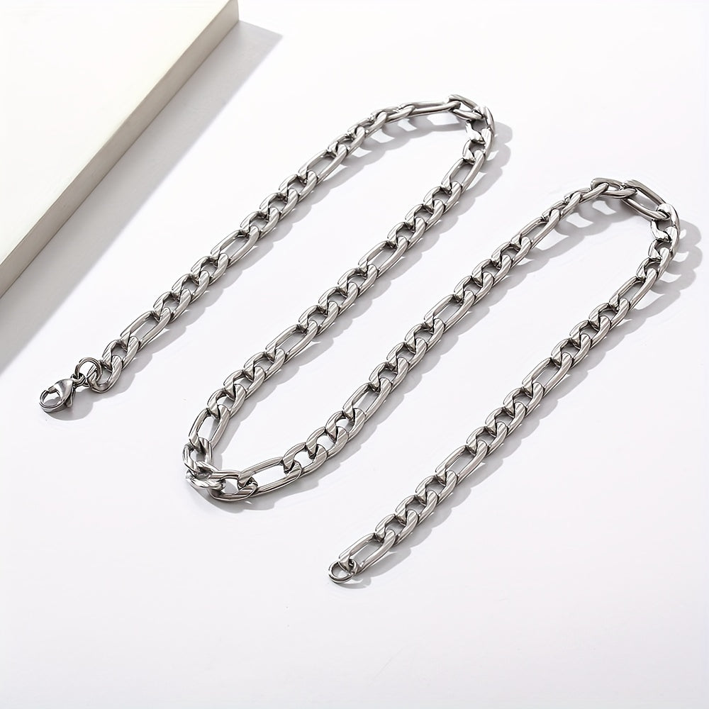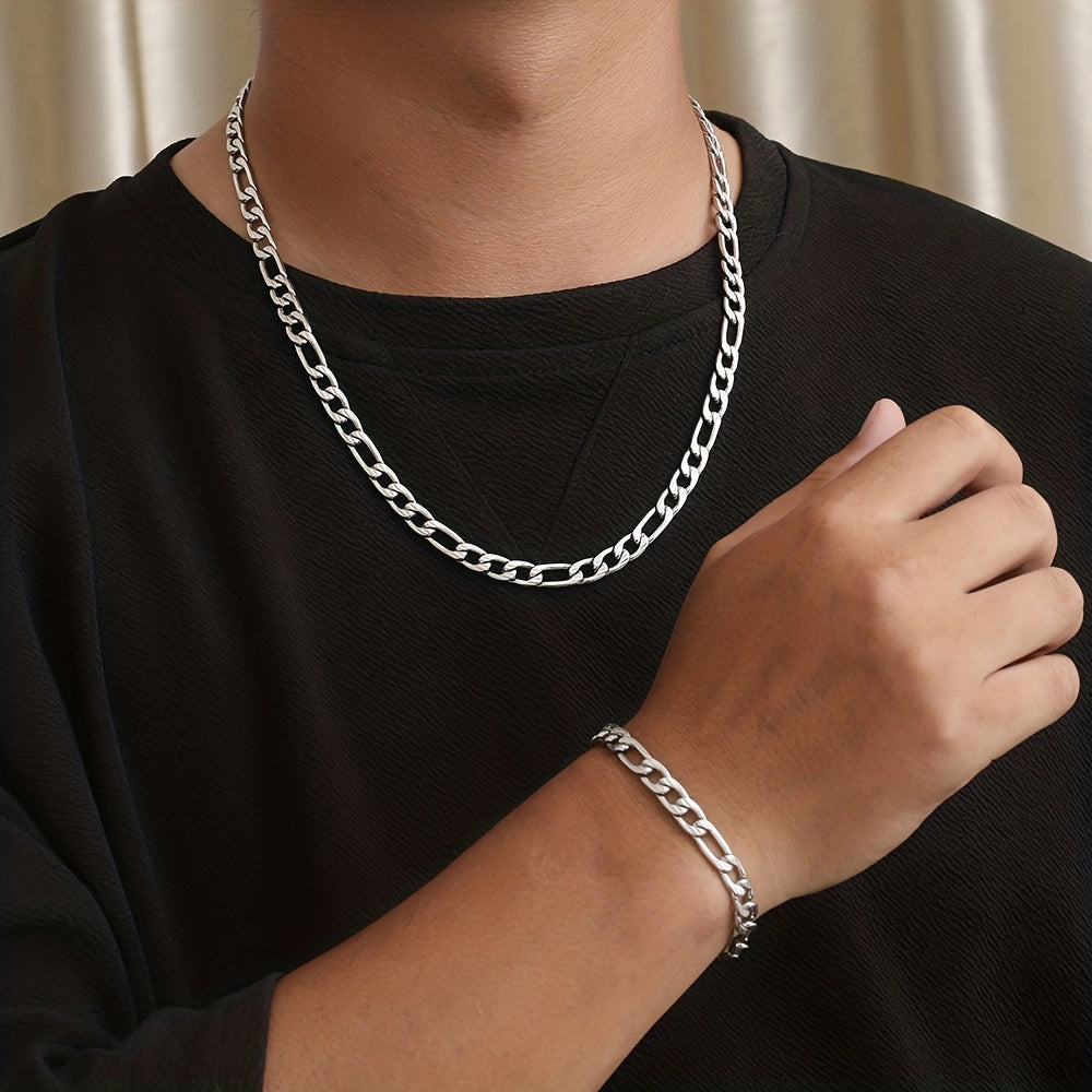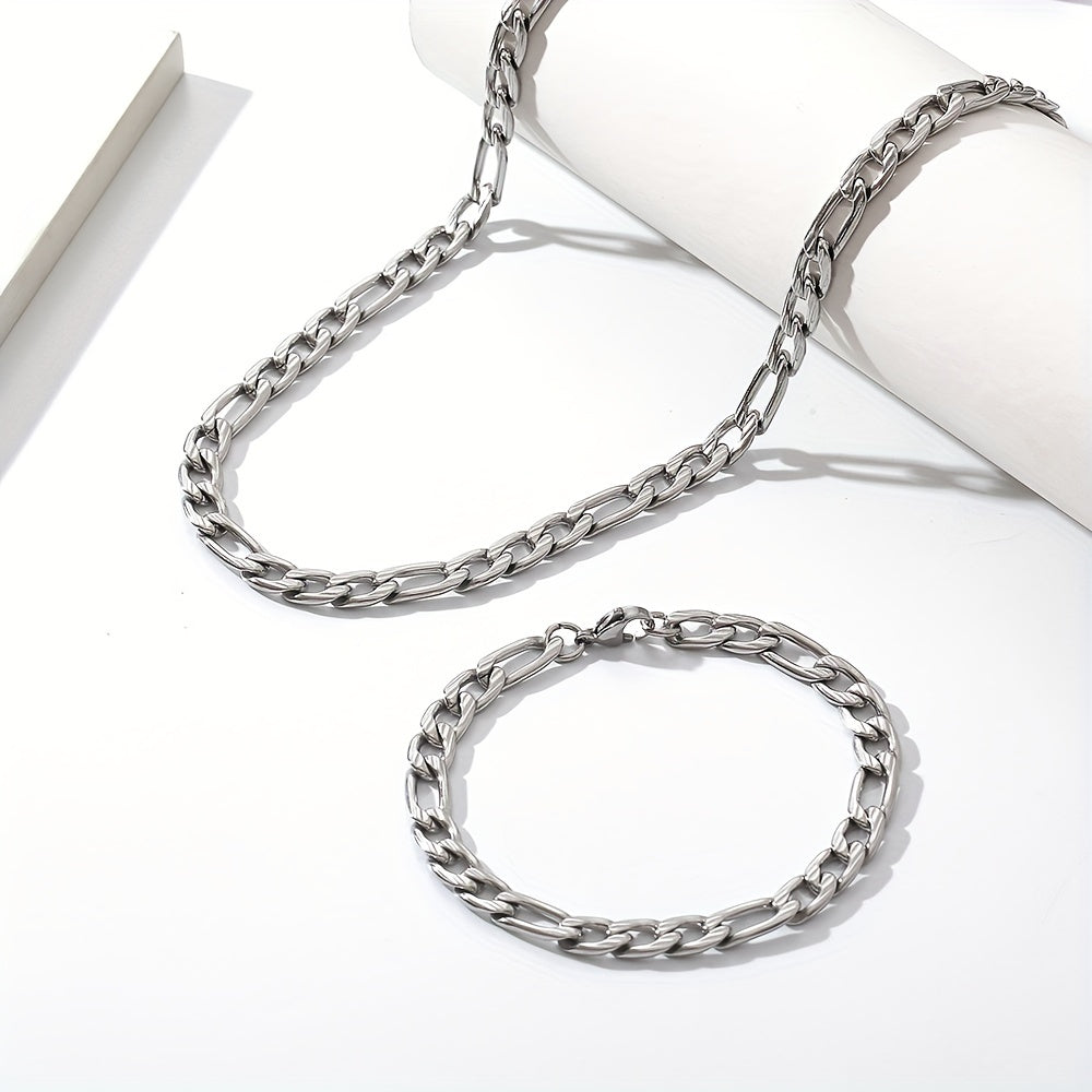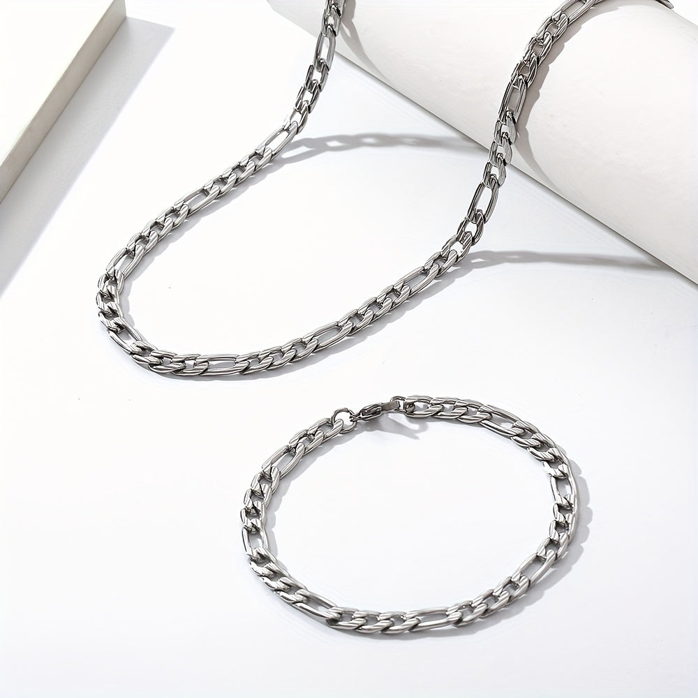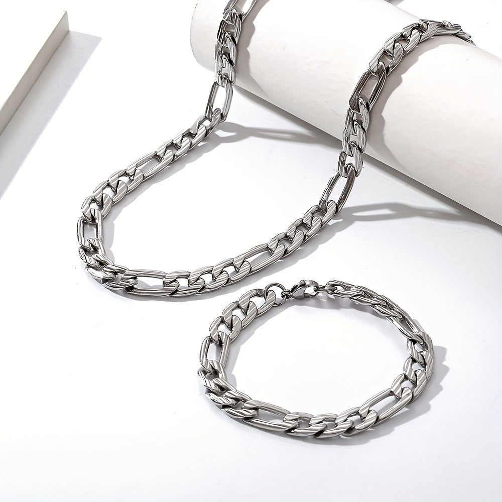 This set includes a sleek stainless steel bracelet and necklace for a stylish hip hop look.