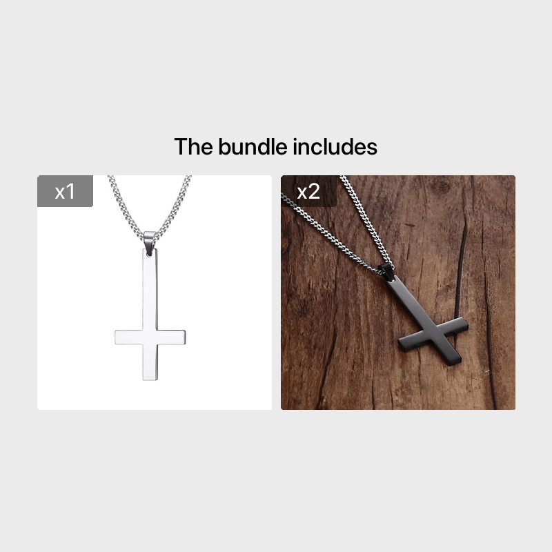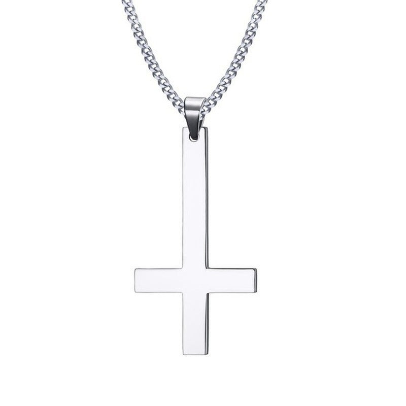 This pendant necklace features a stainless steel plated inverted cross design, making it a bold and stylish accessory for men.