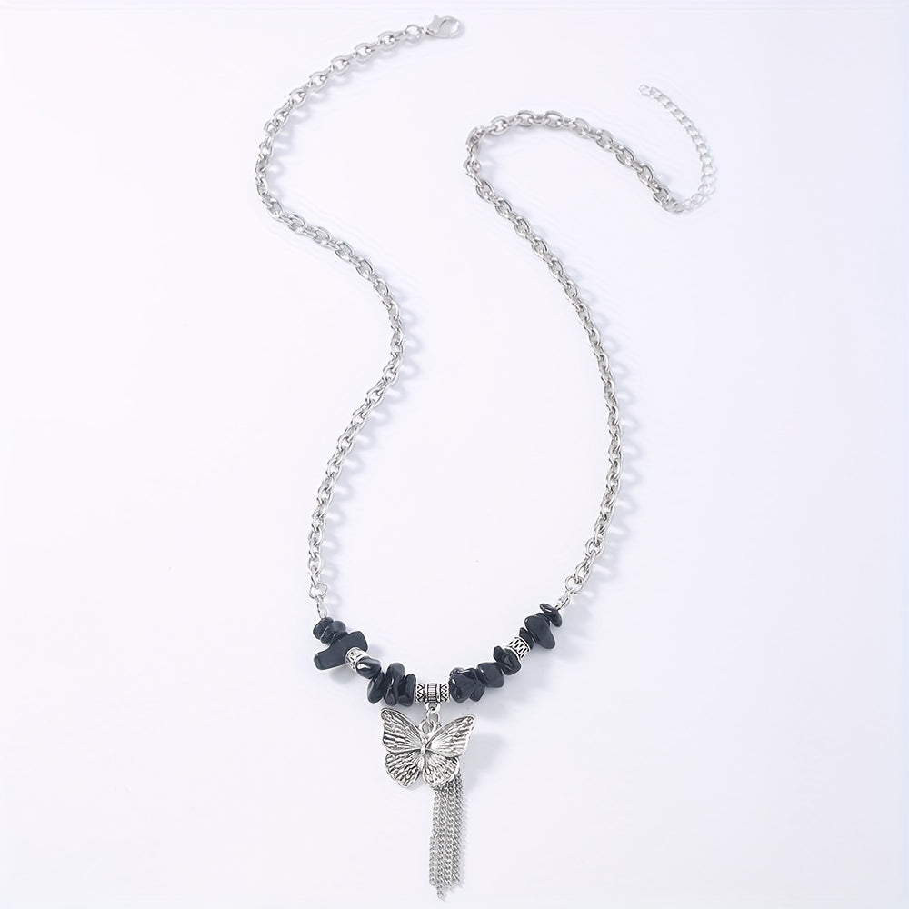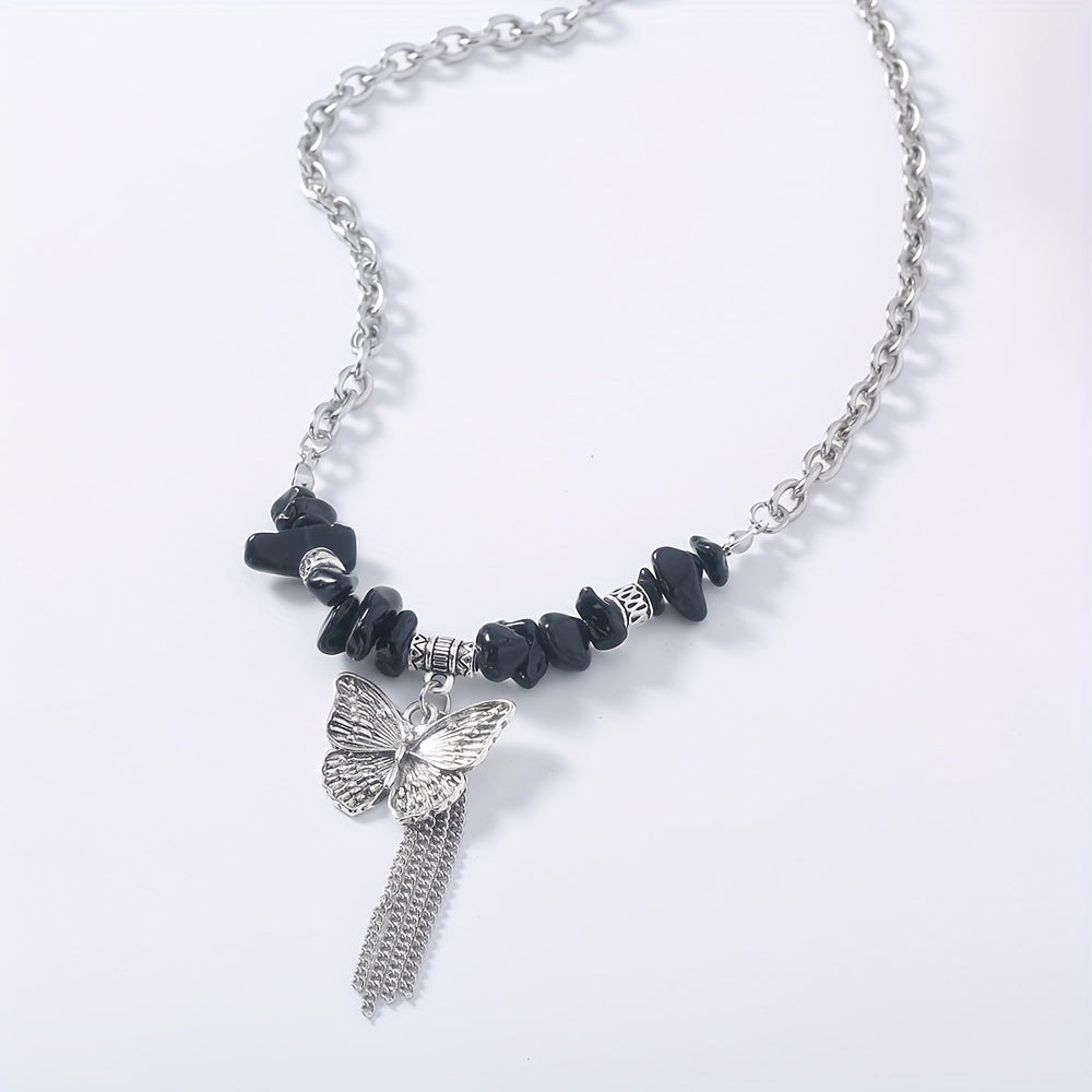 This elegant necklace features a combination of stainless steel chain with a natural stone pendant and a tassel butterfly design. It makes a perfect gift for women and girls.