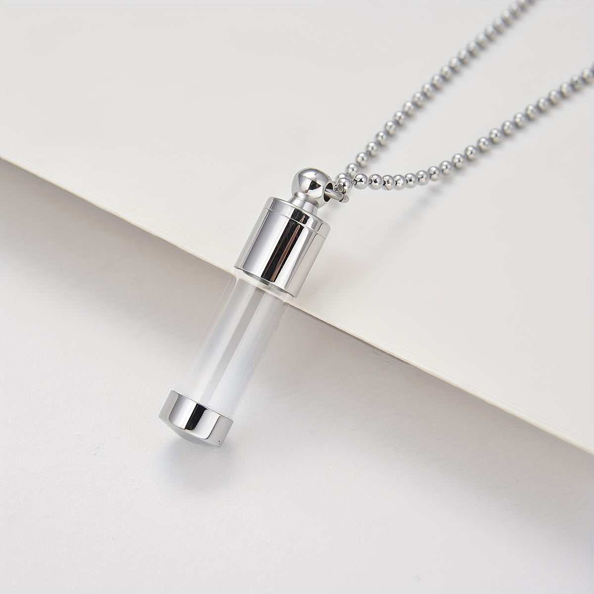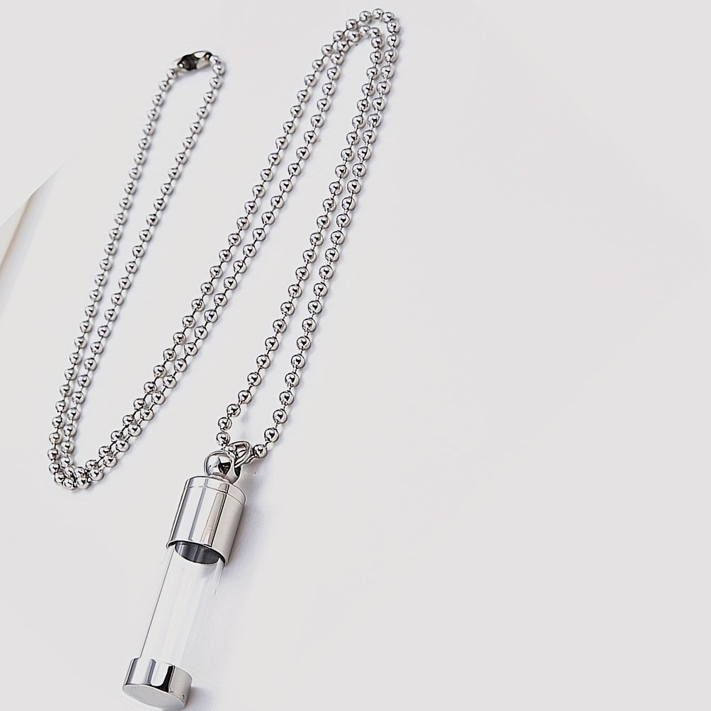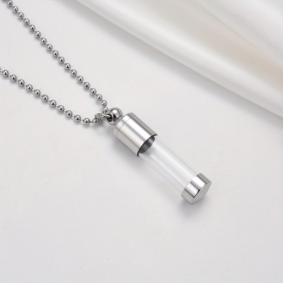 This stainless steel necklace is designed as an openable container tube urn to hold cremation ashes. It serves as a beautiful memorial jewelry piece for both men and women.