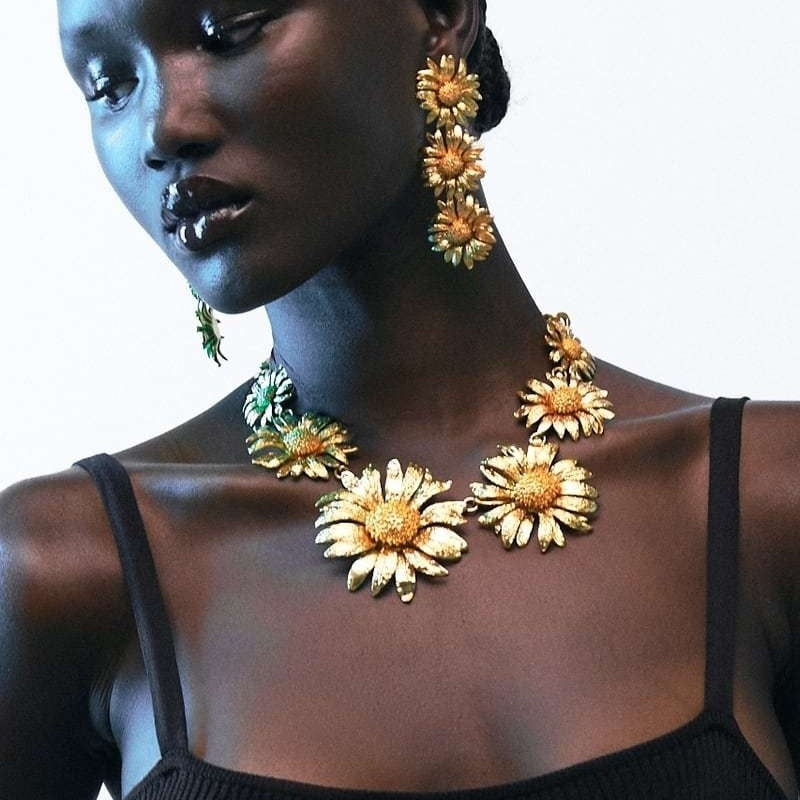 Make a statement with this sunflower jewelry set. Perfect for parties and special occasions, this set features an exaggerated sunflower design in a trendy hip hop style.