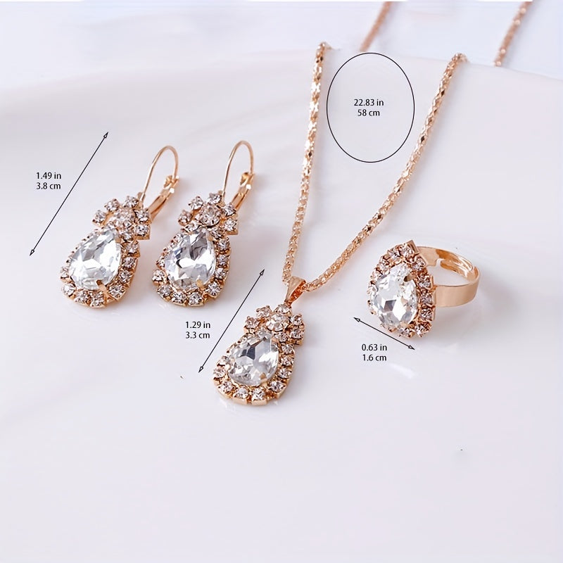 Complete your bridal dress look with this elegant jewelry set featuring a pendant necklace, drop earrings, and an adjustable ring. Perfect accessories for your special day.