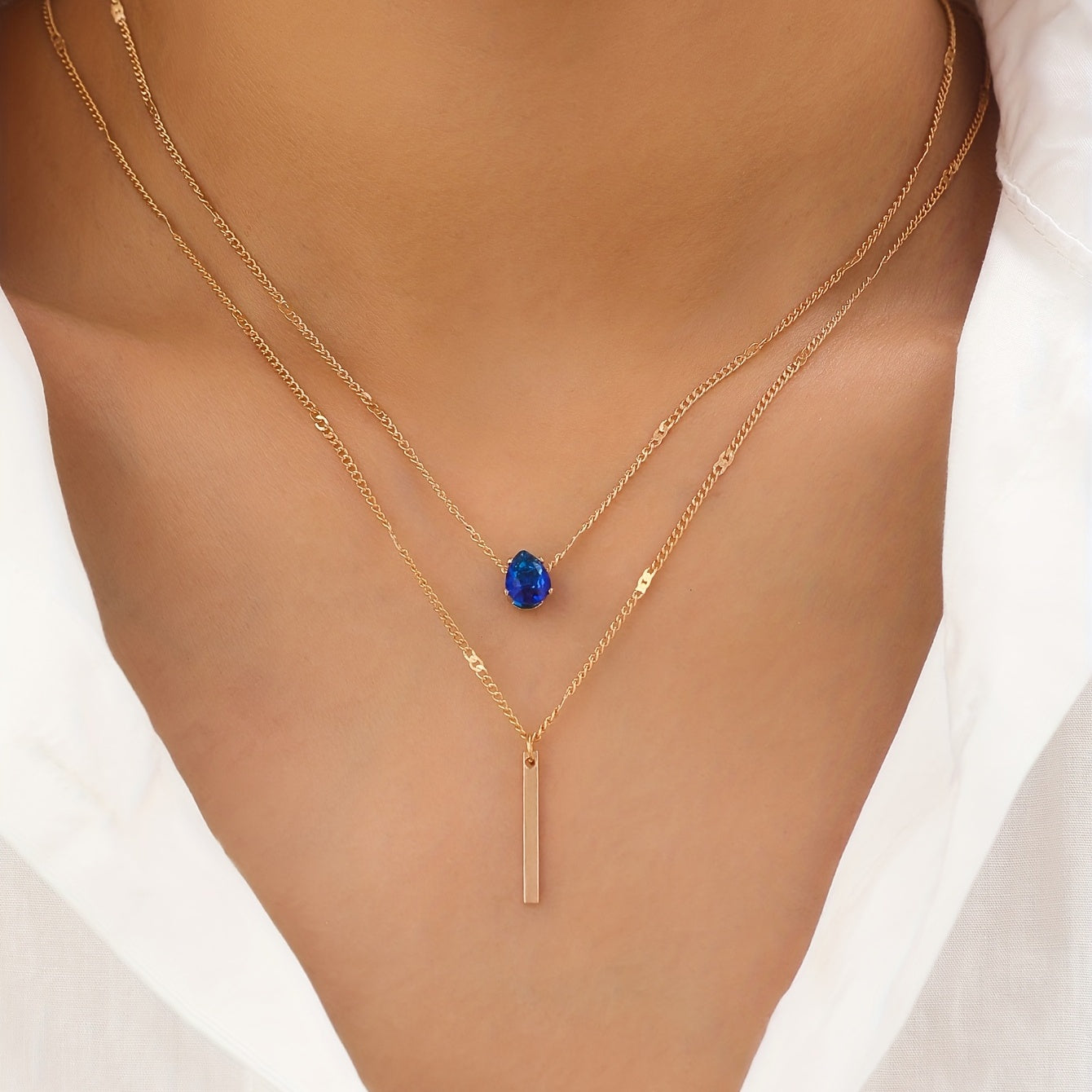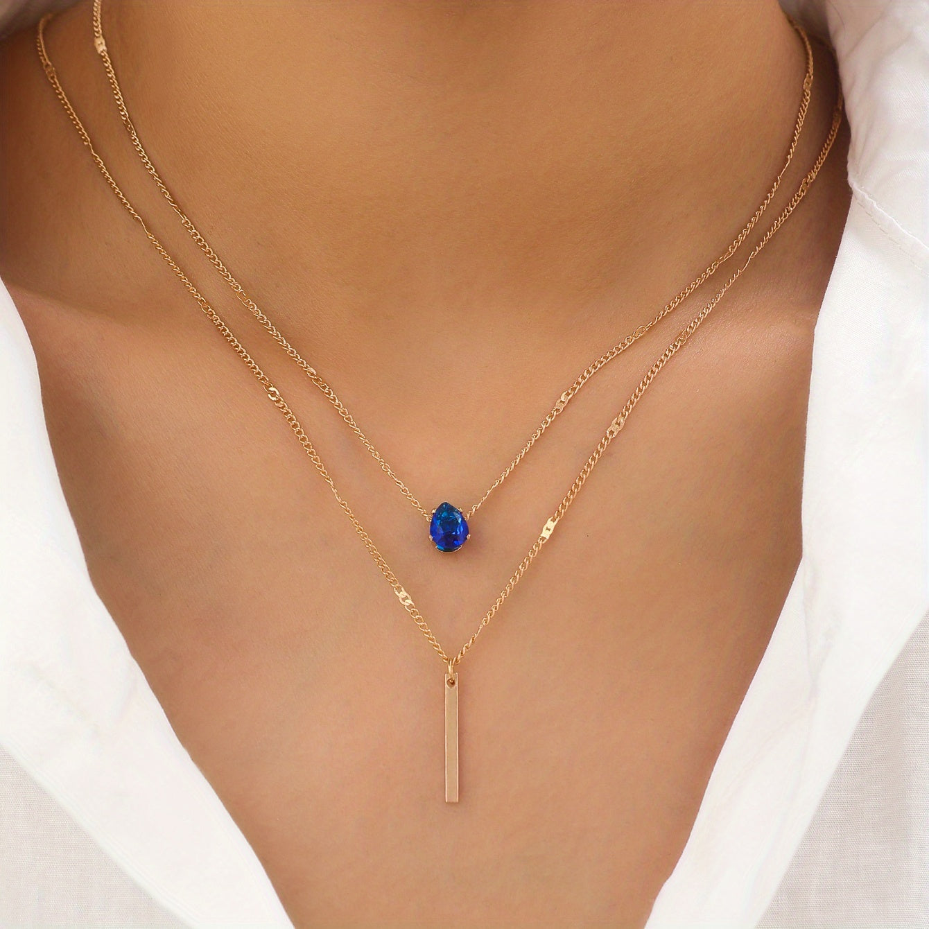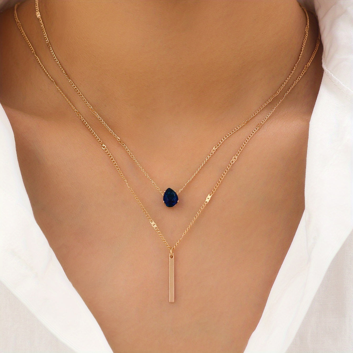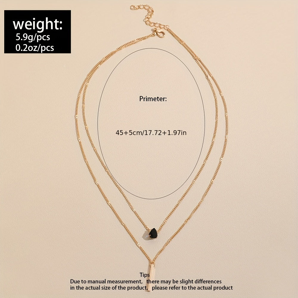 Elegant and stylish teardrop shape zircon long rod pendant necklace with double layer chain, ideal for women and girls.