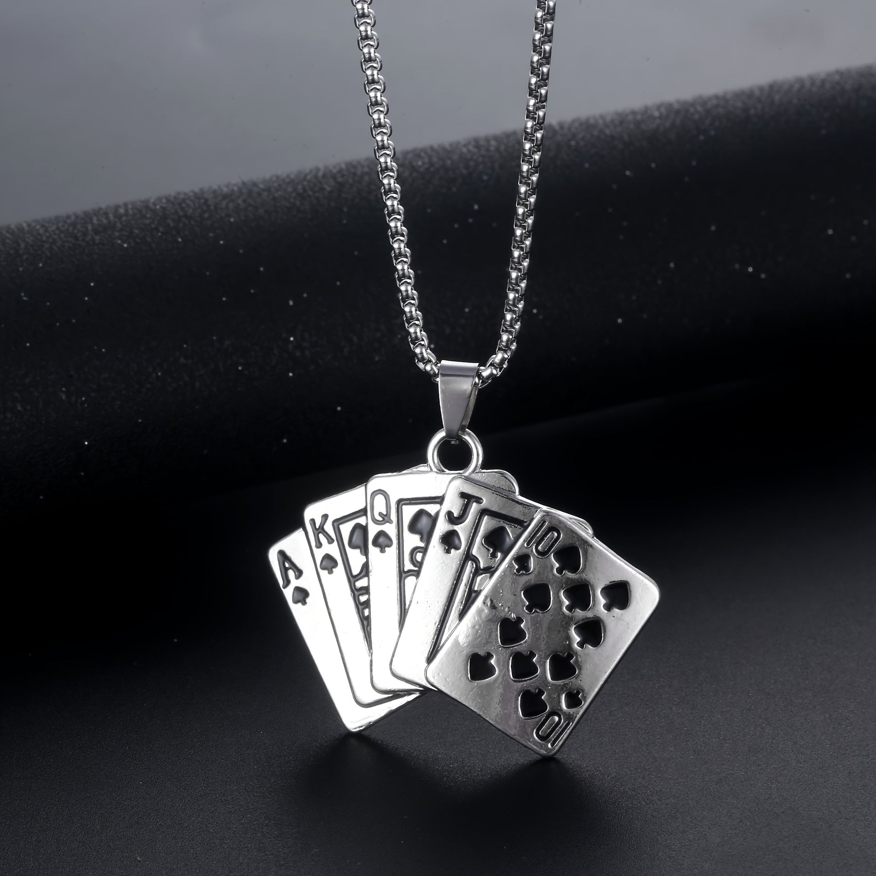 This pendant necklace features a stylish playing cards design, perfect for hip-hop fashion. Made of durable titanium steel, it's a great addition to any men's jewelry collection.
