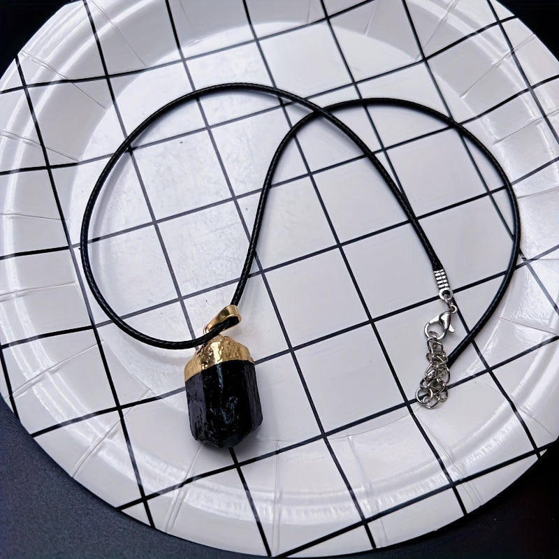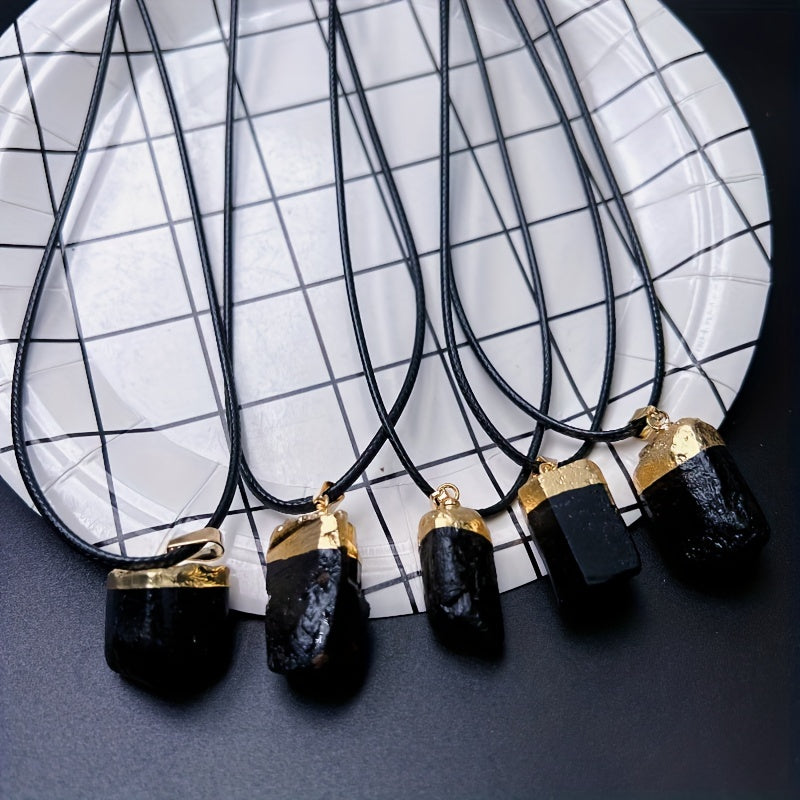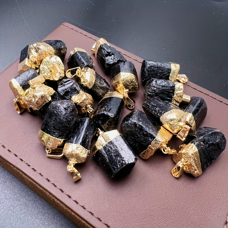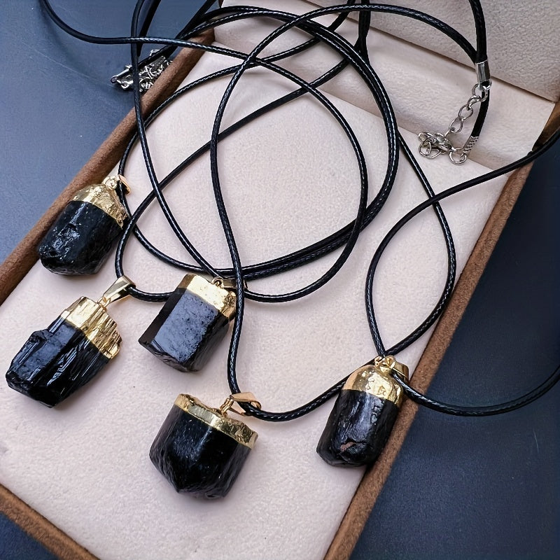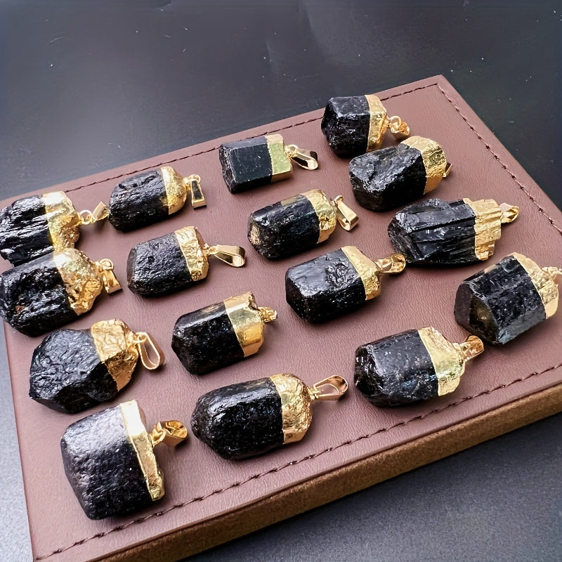 Embrace the healing powers of raw tourmaline crystal with this golden alloy plated pendant necklace. The necklace provides protection against negative energy and promotes emotional balance.