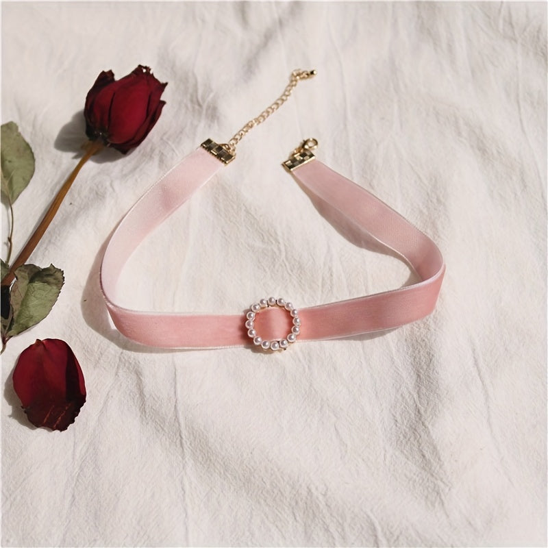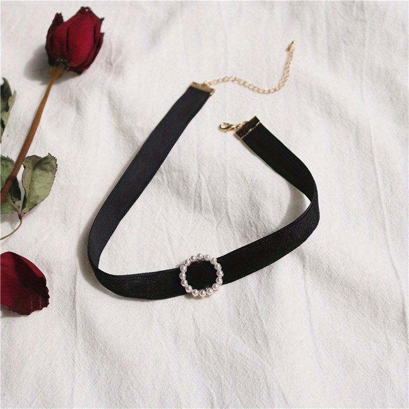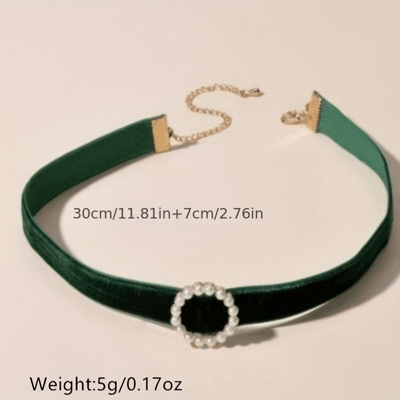 This elegant velvet choker necklace features a faux pearl charm, perfect for adding a touch of sophistication to any outfit.