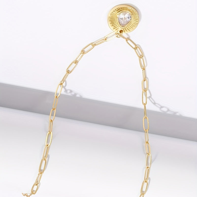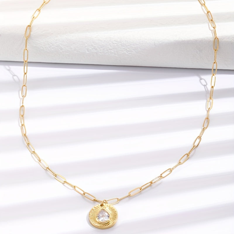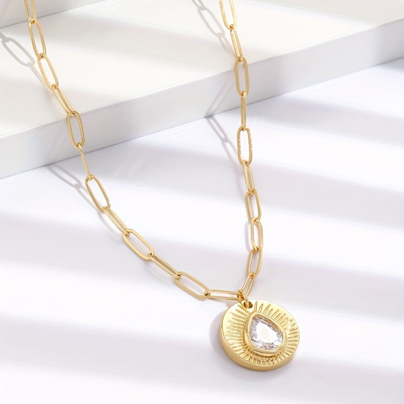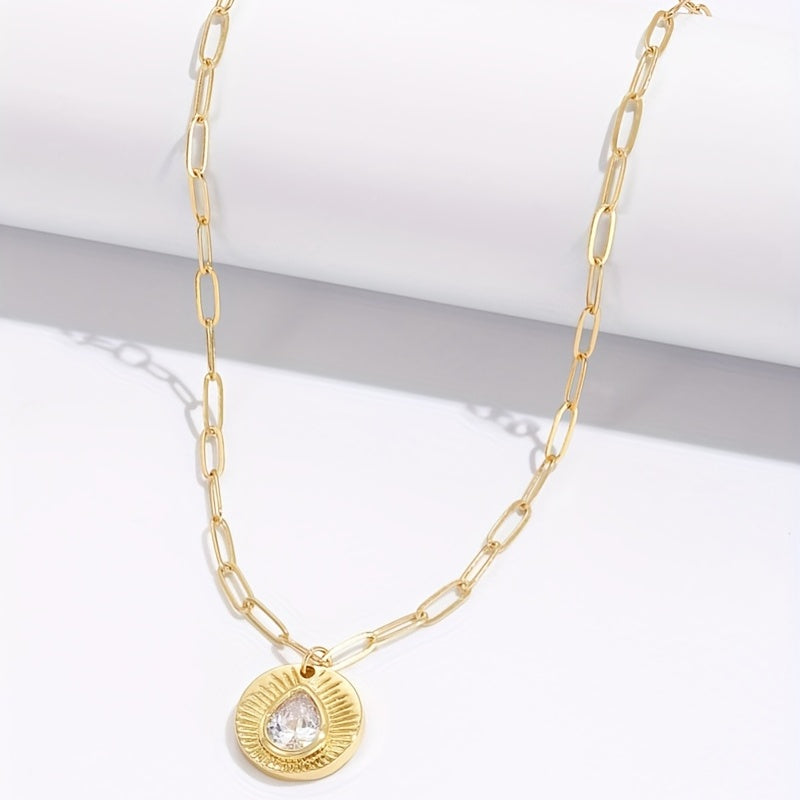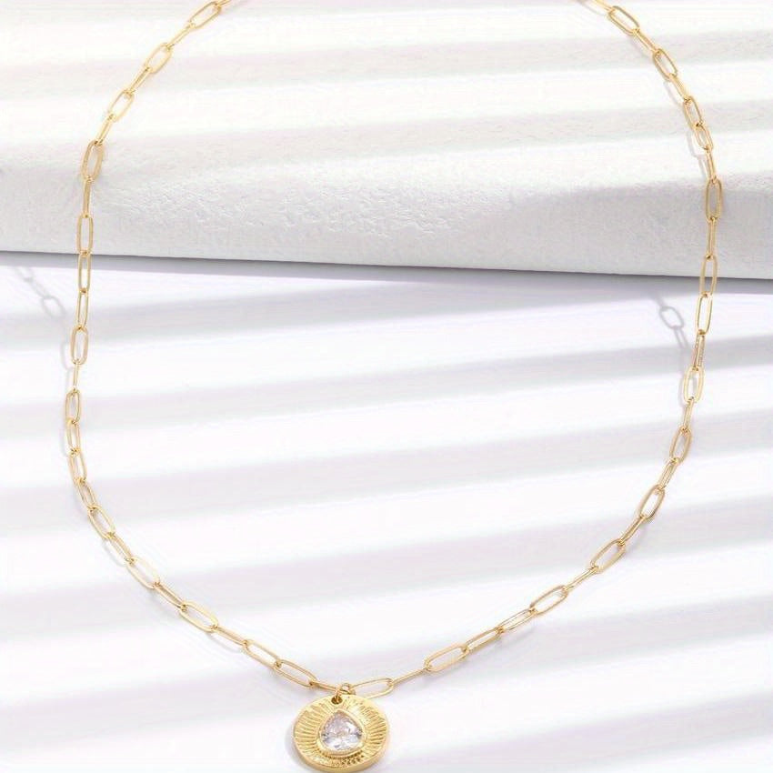 Elegant necklace featuring an inlaid water drop rhinestone round pendant on a paperclip chain.