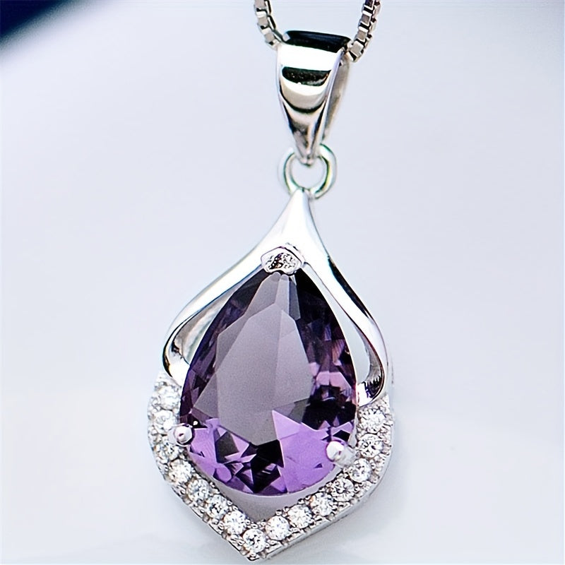 This stunning water drop shape pendant necklace features a purple artificial diamond, making it a perfect accessory for men and women. Ideal for anniversary gifts.