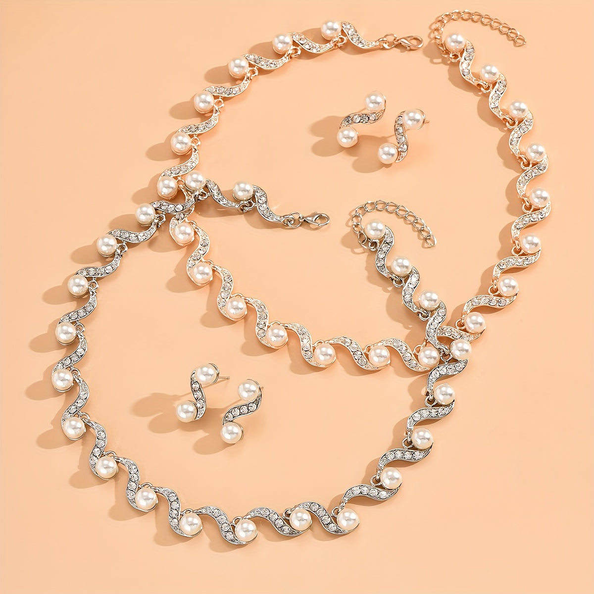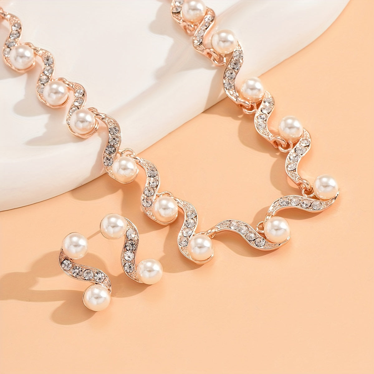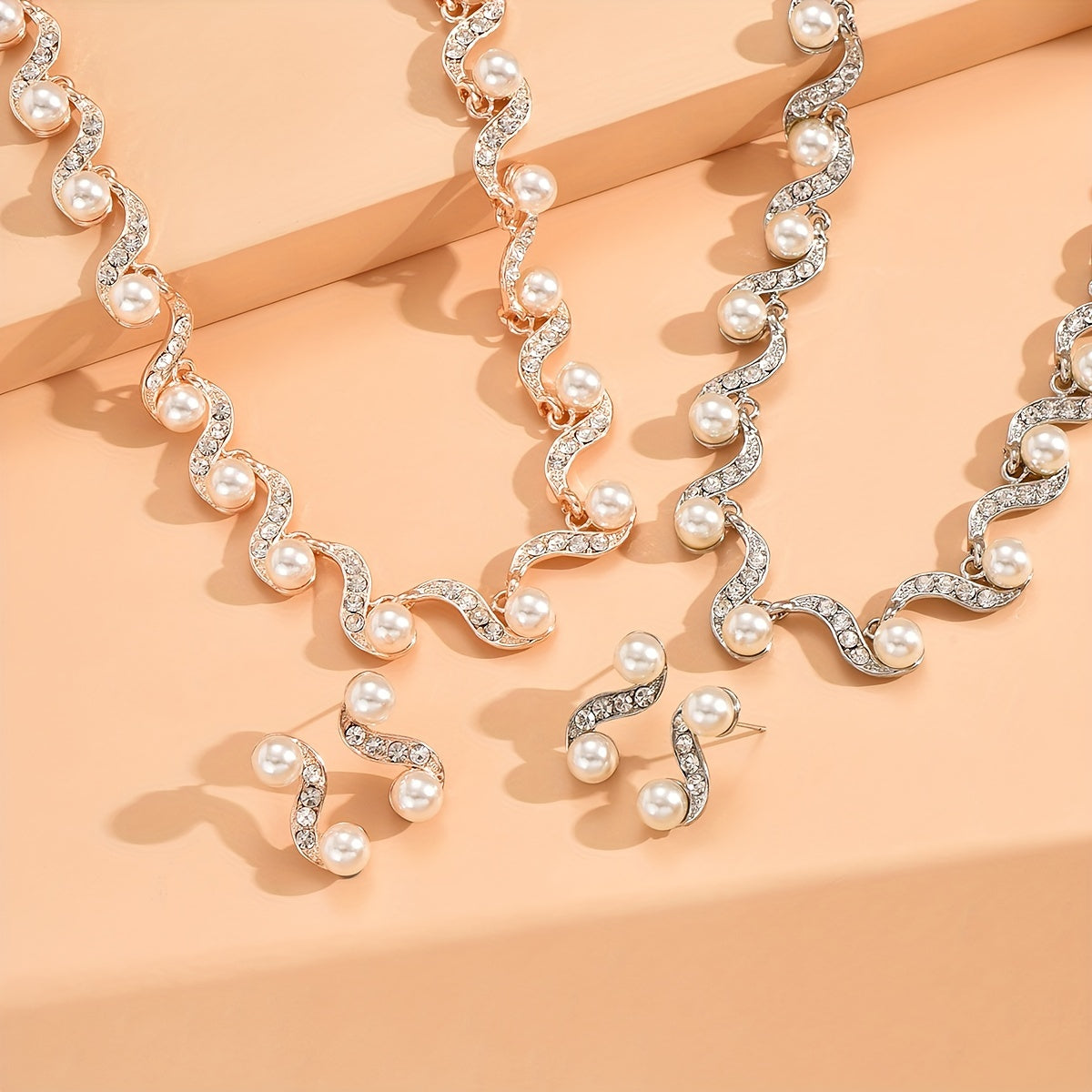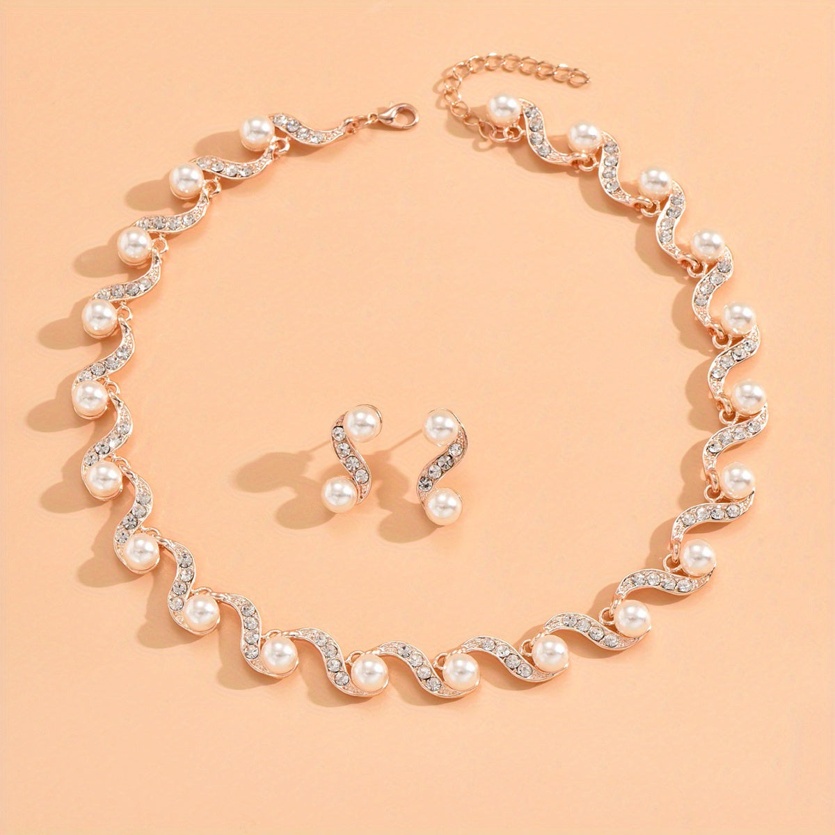 Enhance your prom party look with this elegant jewelry set featuring a statement wave shape choker necklace and drop earrings adorned with inlaid faux pearls.