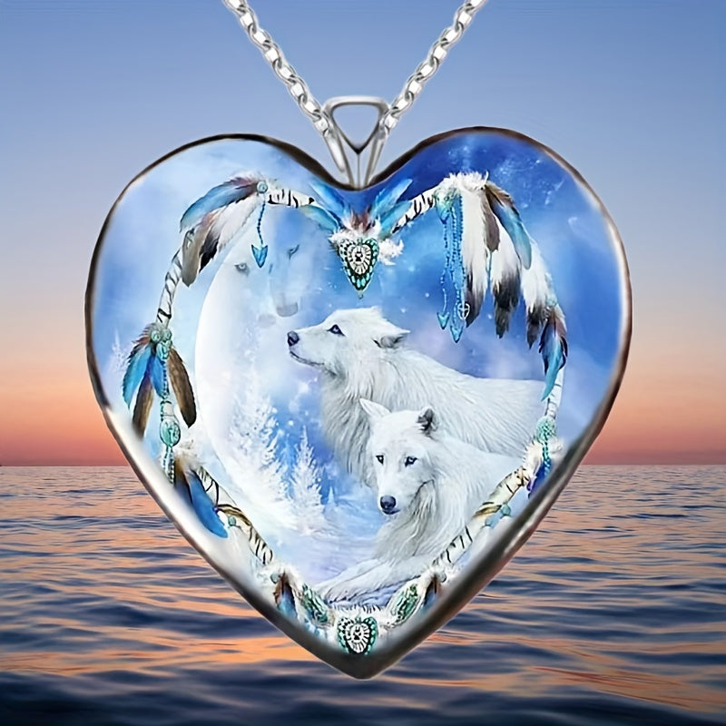 This unique necklace features a zinc alloy pendant in the shape of a heart with a snow mountain and wolf design. Perfect gift for men or women on Thanksgiving, Christmas, or birthdays.