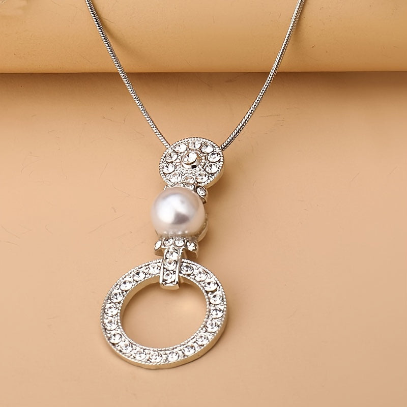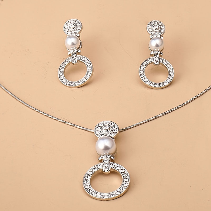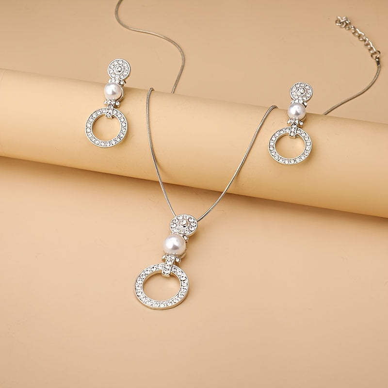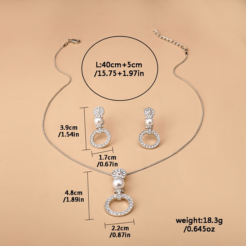 Complete your look with this fine jewelry set featuring pearl and rhinestone details. Perfect for birthdays and night parties.