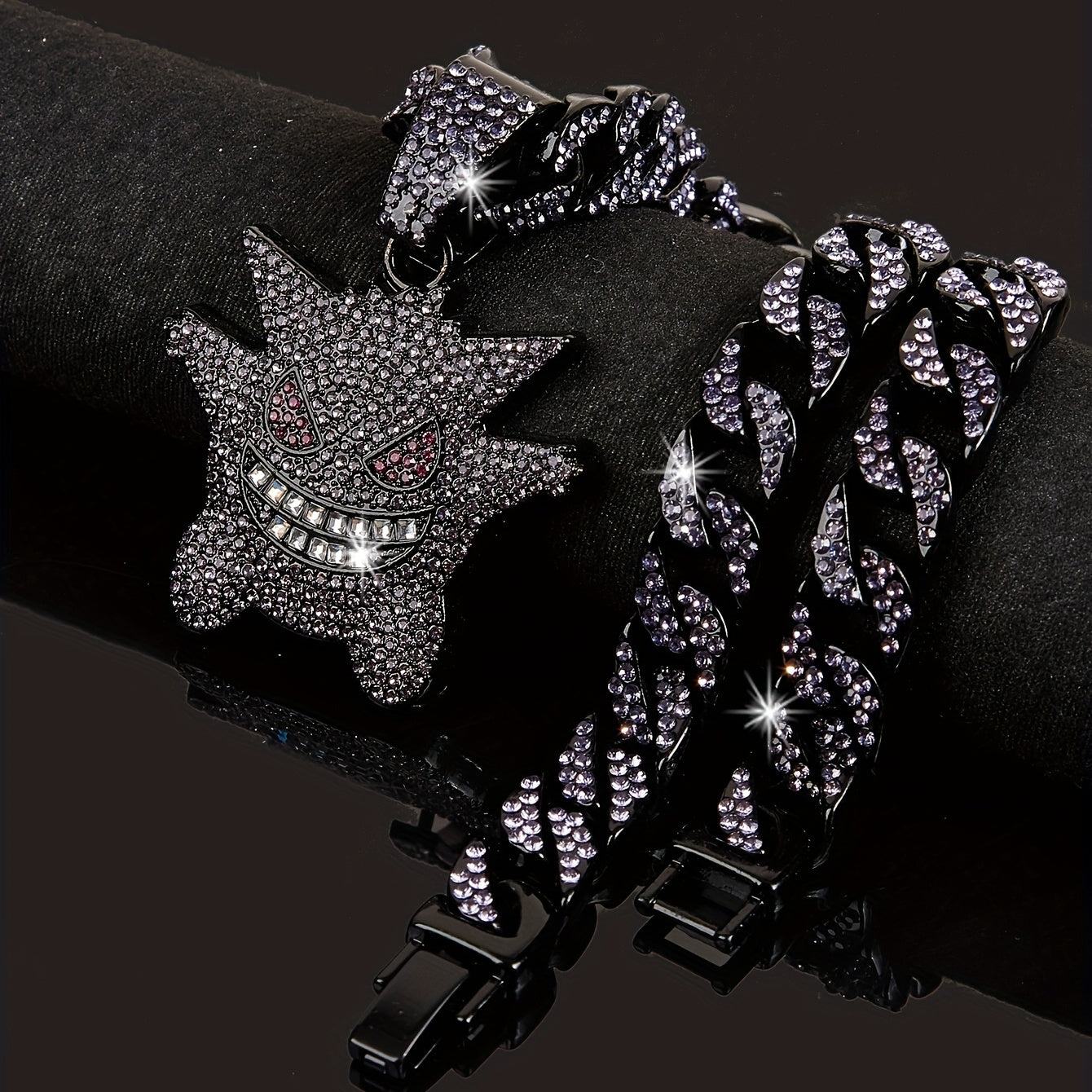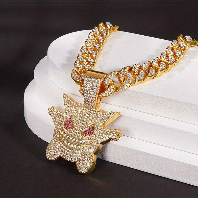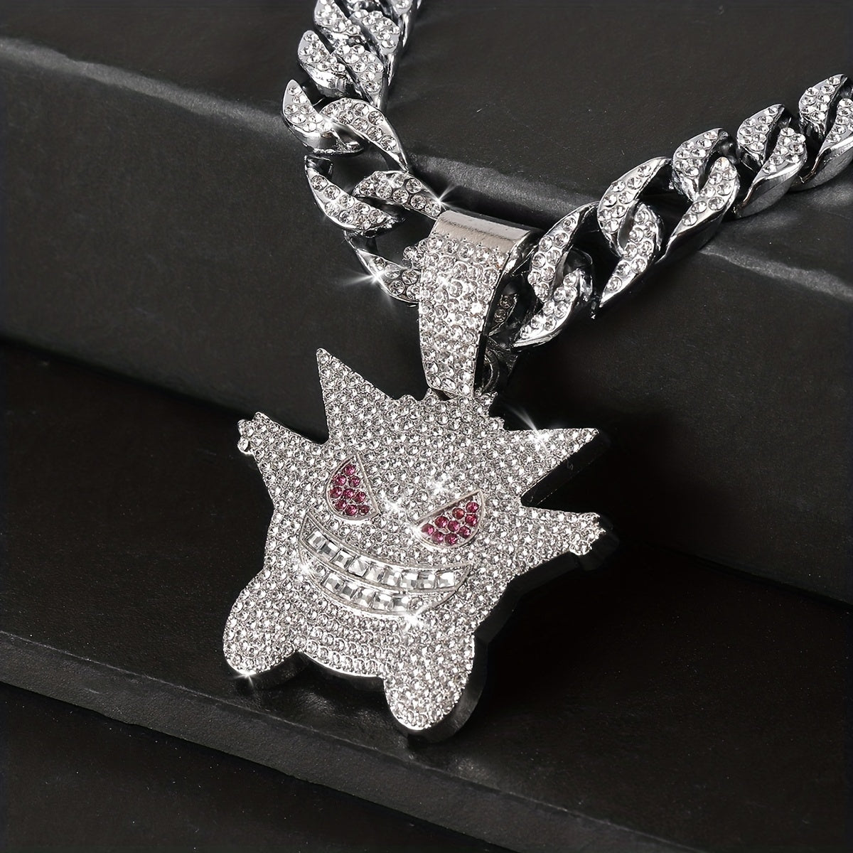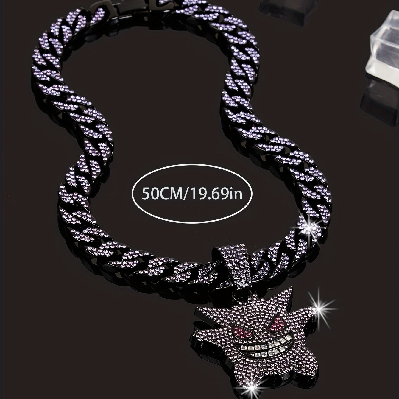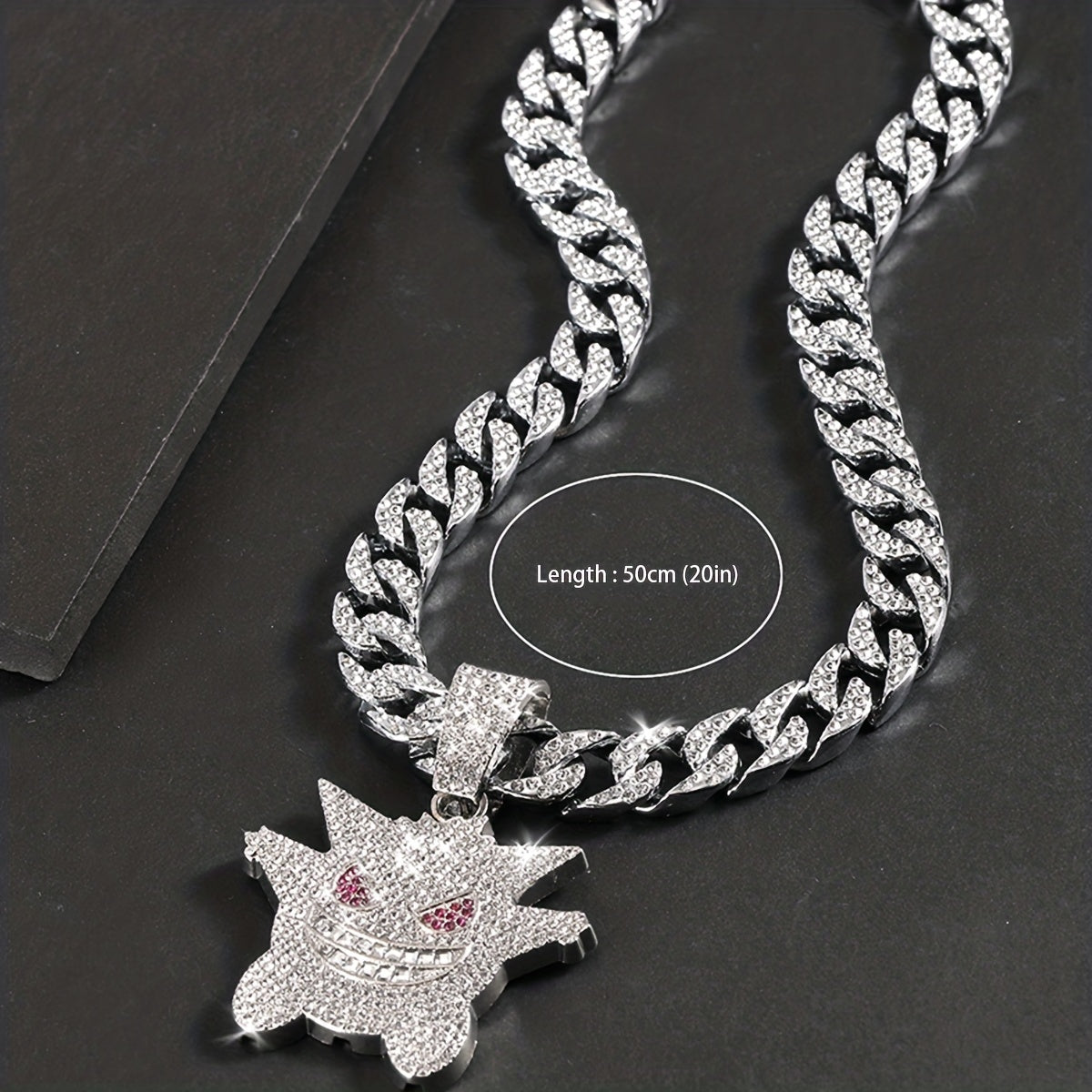 Make a bold statement with this hip hop punk ghost pendant necklace featuring inlaid rhinestones and glitter on a stylish cuban chain. Perfect for adding a touch of edgy style to your outfit.