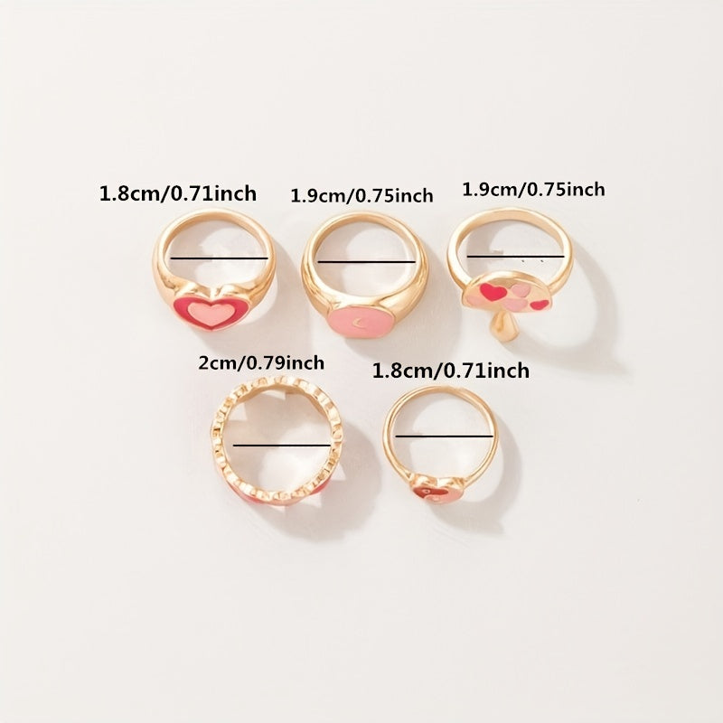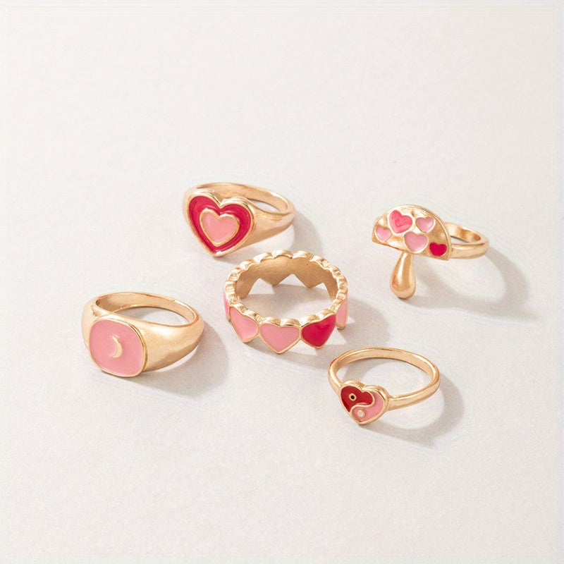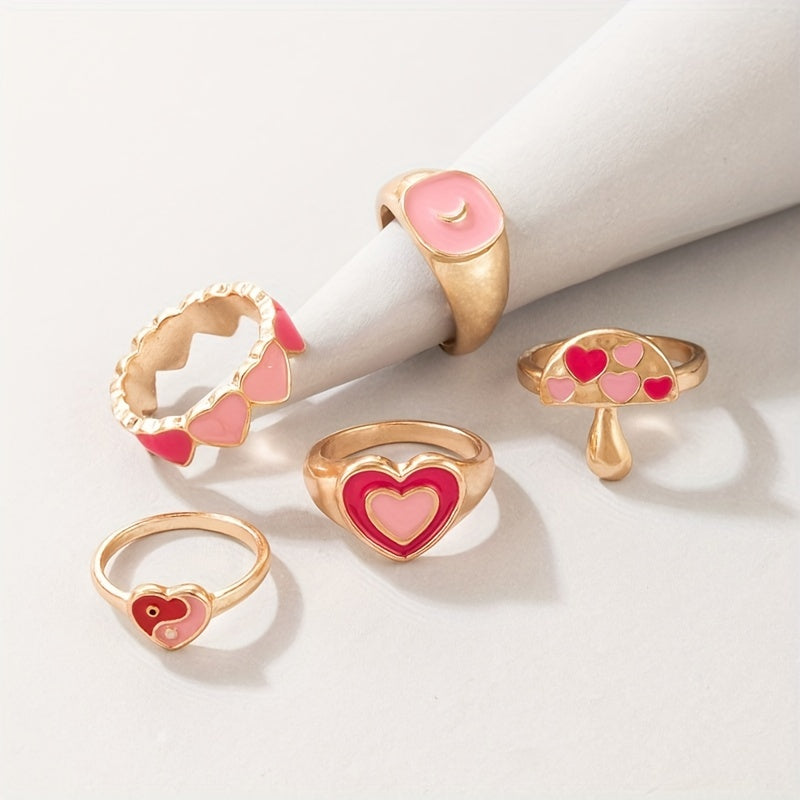 Elevate your daily outfit with this set of 5 stacking rings featuring mushroom, heart, and Tai Chi patterns. Mix and match to create unique looks.