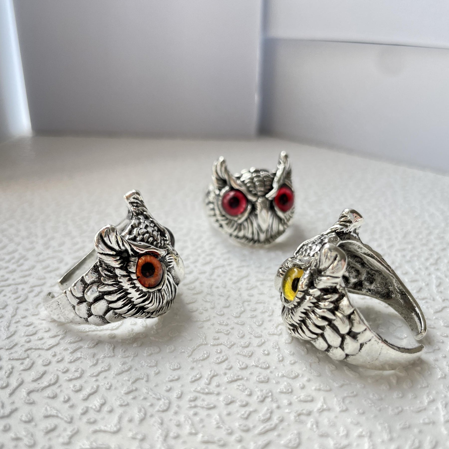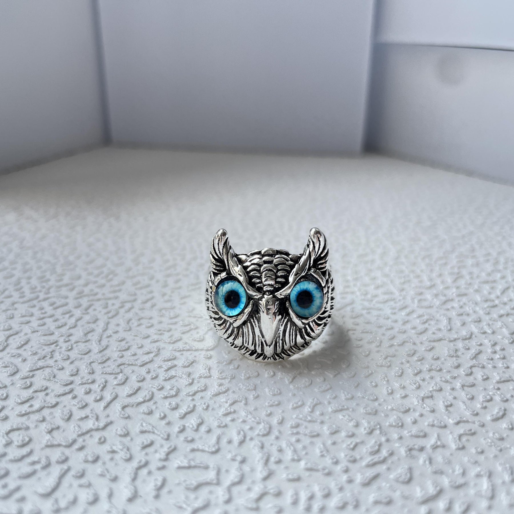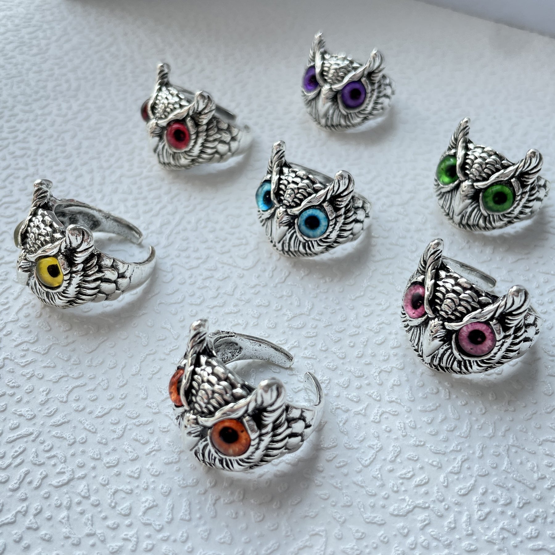 This unique owl ring features a devil's eye design, suitable for both men and women. The opening is adjustable to fit different finger sizes.