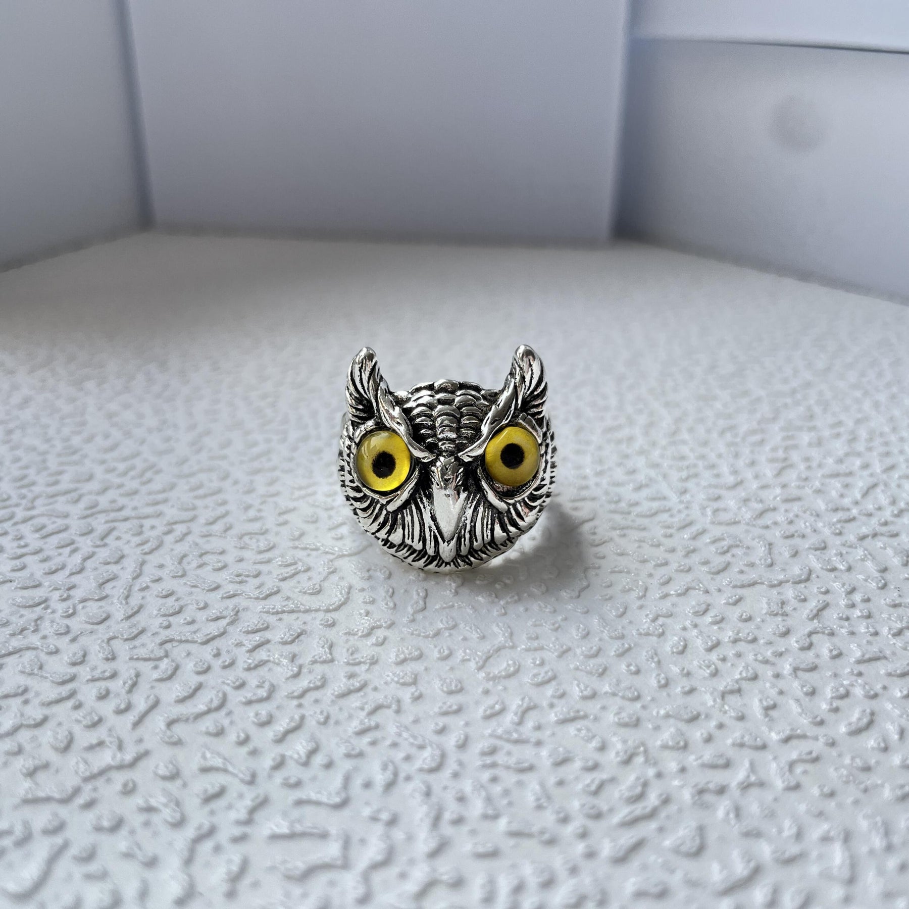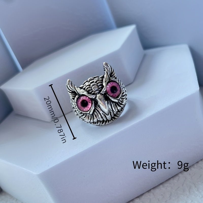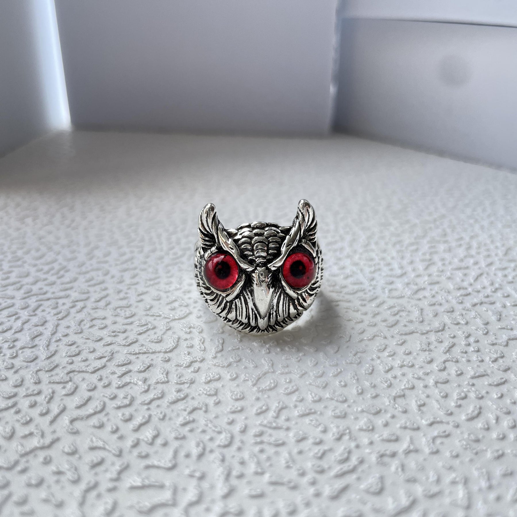 This unique owl ring features a devil's eye design, suitable for both men and women. The opening is adjustable to fit different finger sizes.