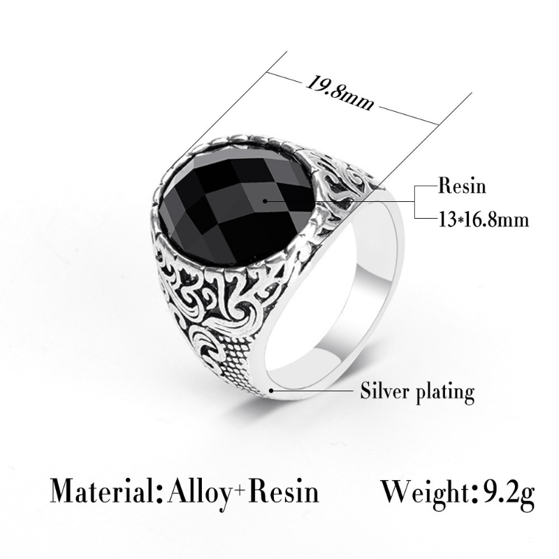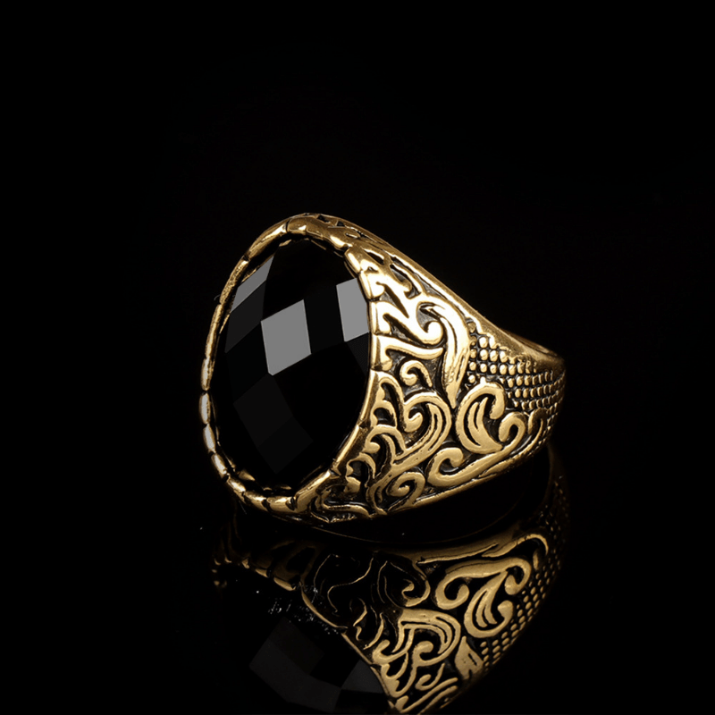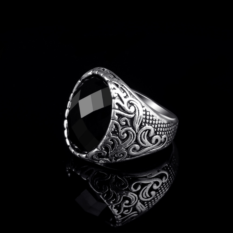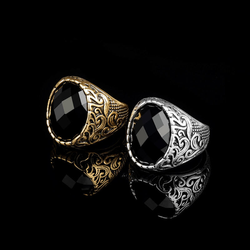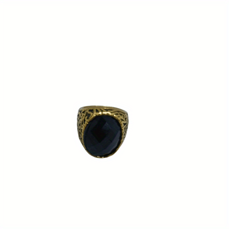This men's ring features a striking gemstone decor with detailed totem carving, exuding a domineering vibe.