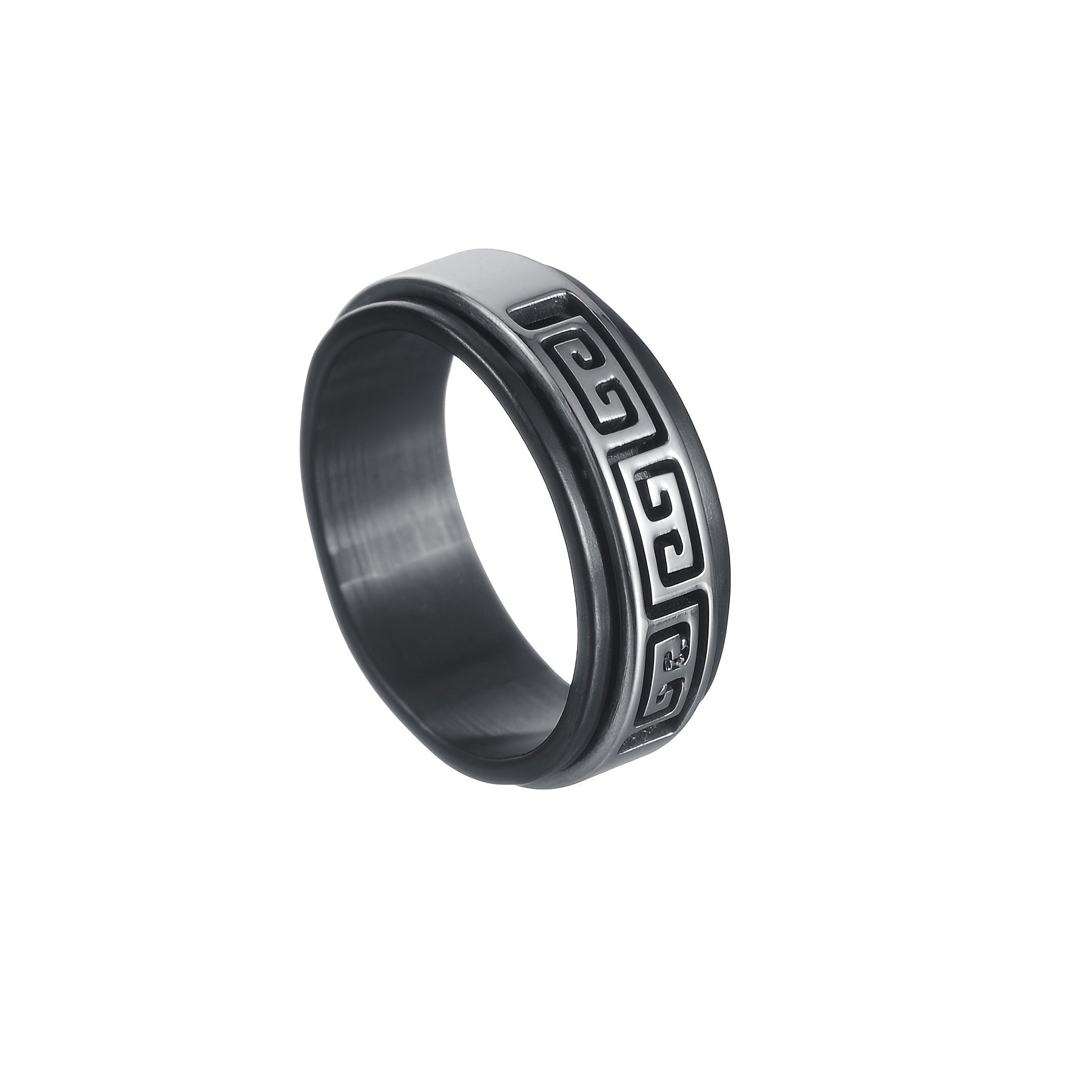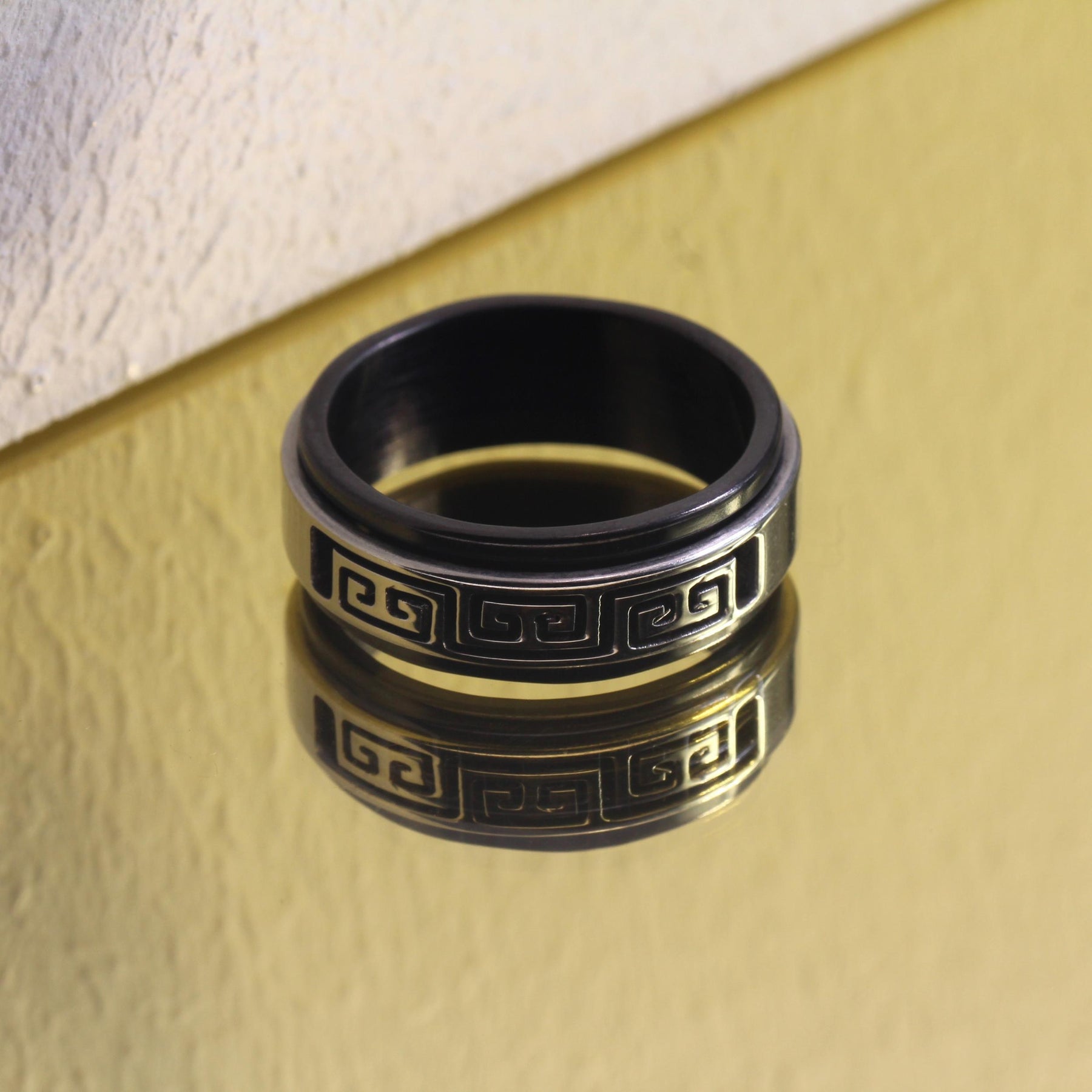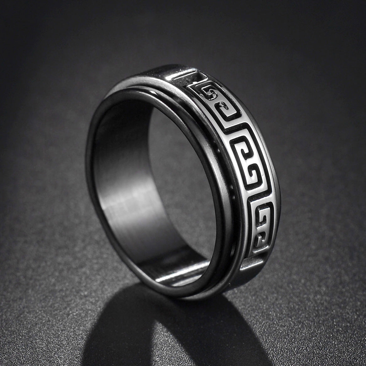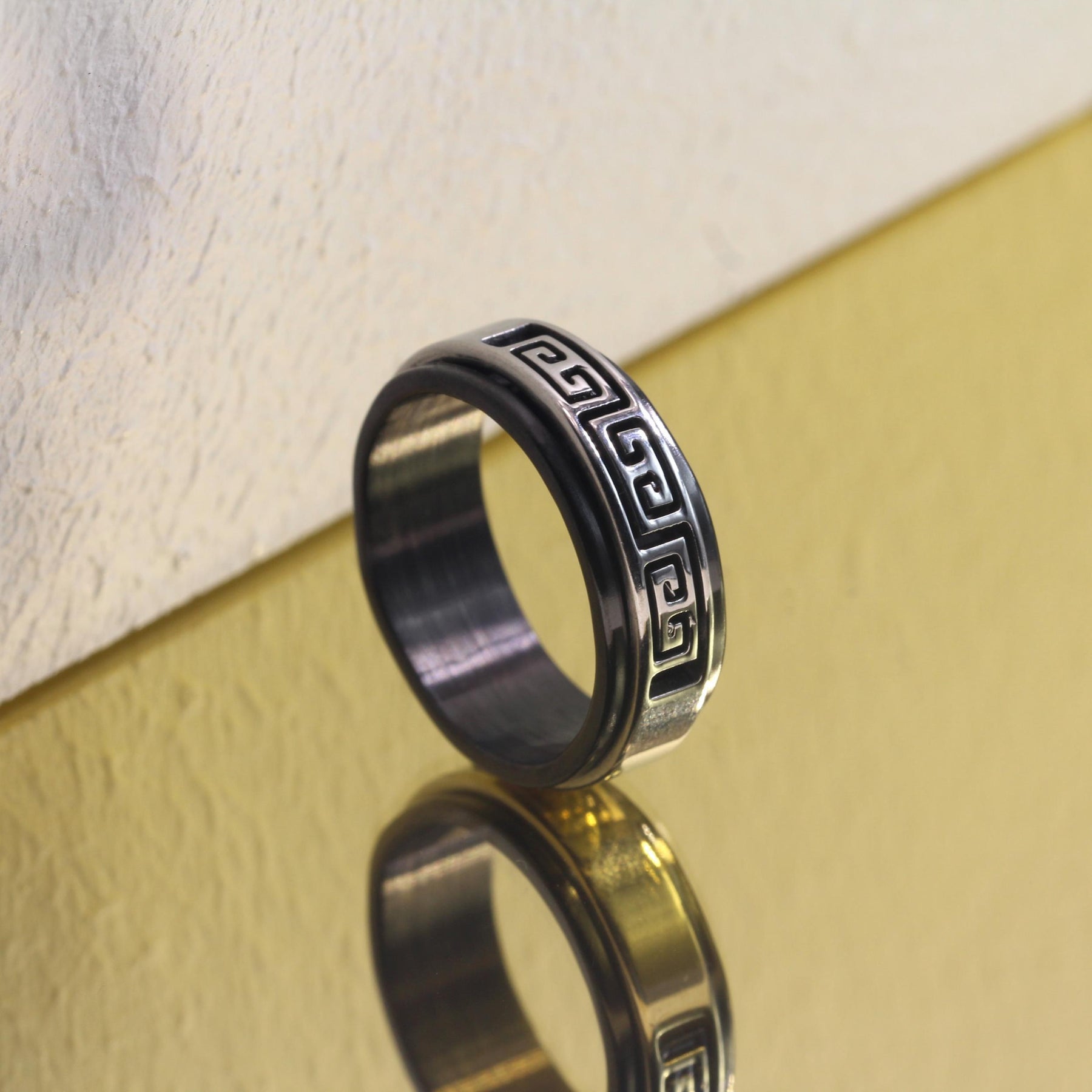 This stainless steel spinner ring features a silver pattern design. Great for keeping your hands busy and reducing anxiety.