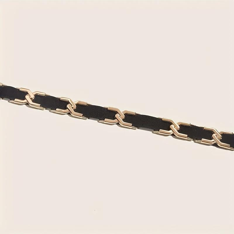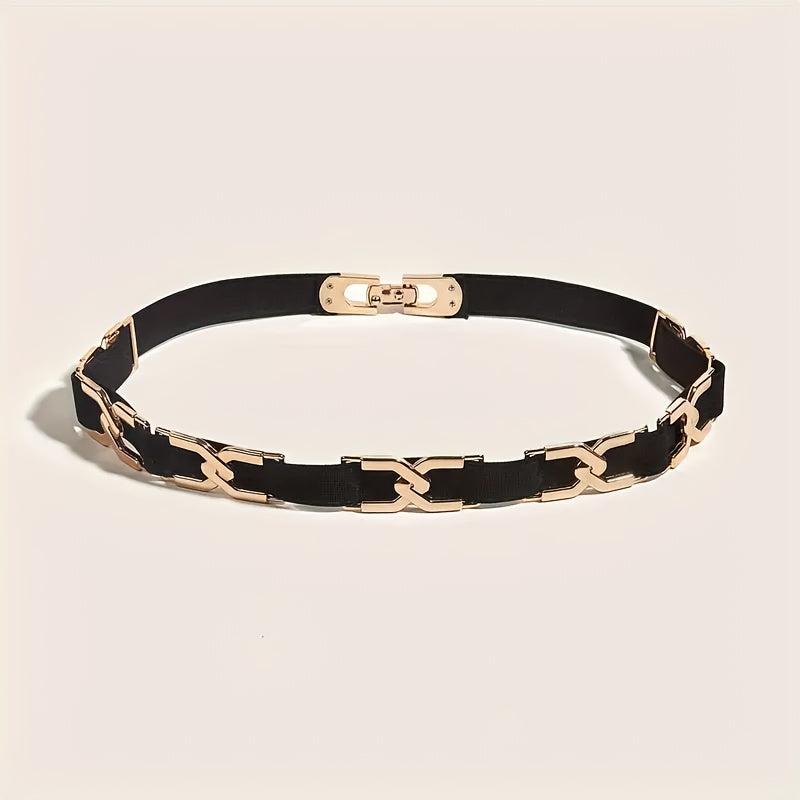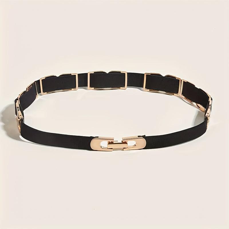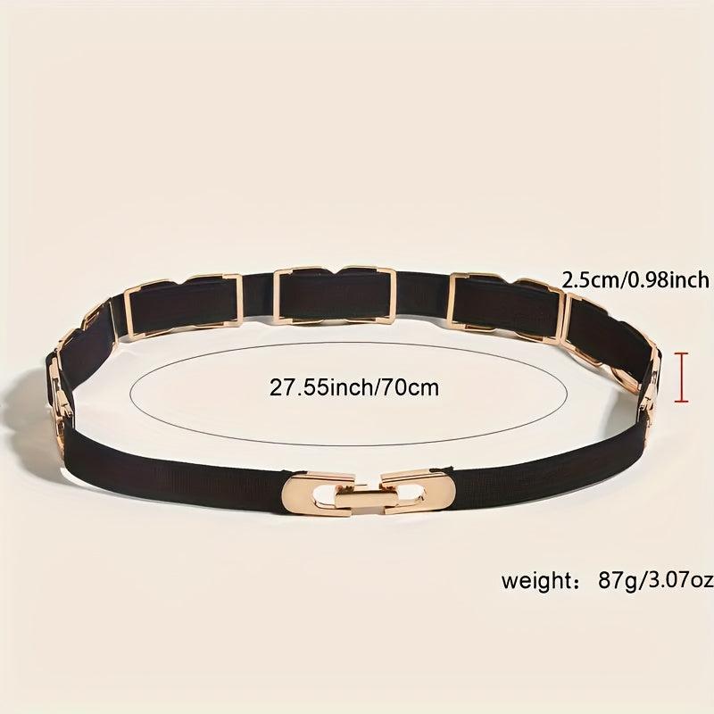 This stylish elastic waist belt features golden toned metal accents that add a touch of elegance to your outfits. Perfect for casual outfits, dresses, and more, this versatile accessory is a must-have for any fashion-forward woman.