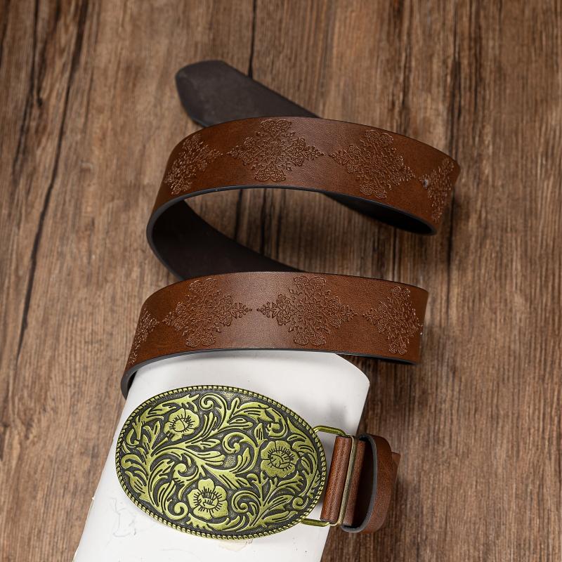 Elegant and versatile women's belt with a large oval floral design, green leaves, and a snowflake embossed textured border.