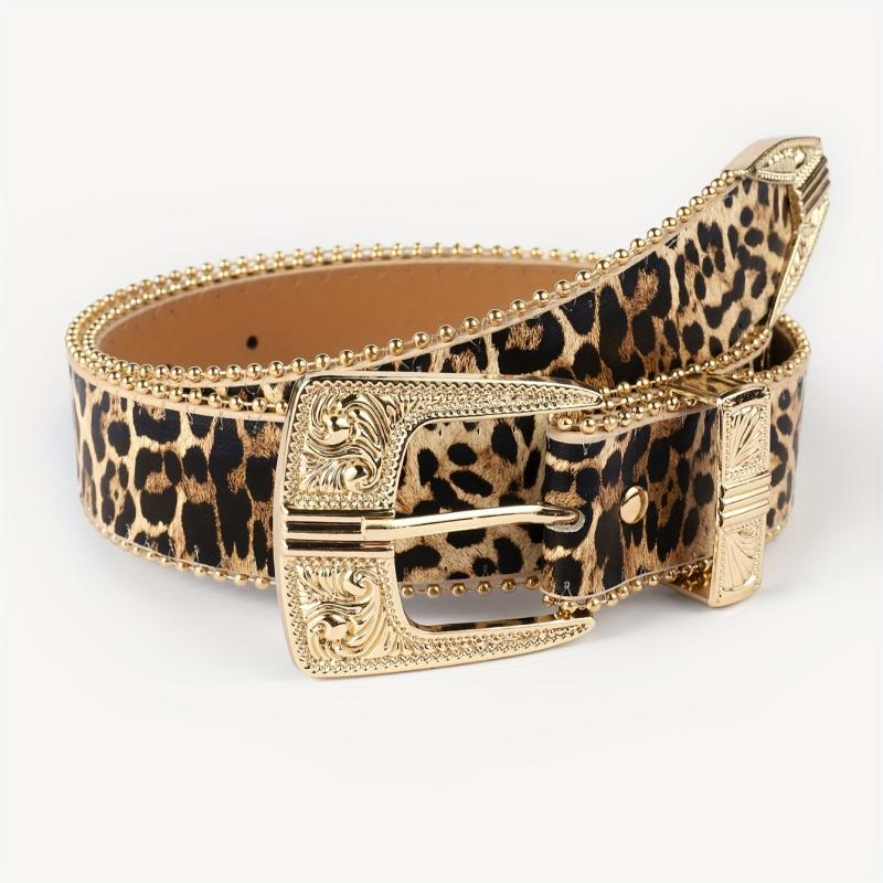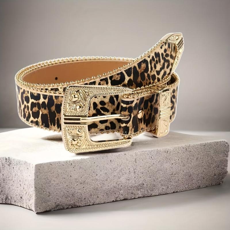 Add a touch of wild style to your outfits with this leopard print faux leather belt. The golden tone buckle and beaded edging add a touch of sophistication, making it perfect for evening dates or a day at the beach.