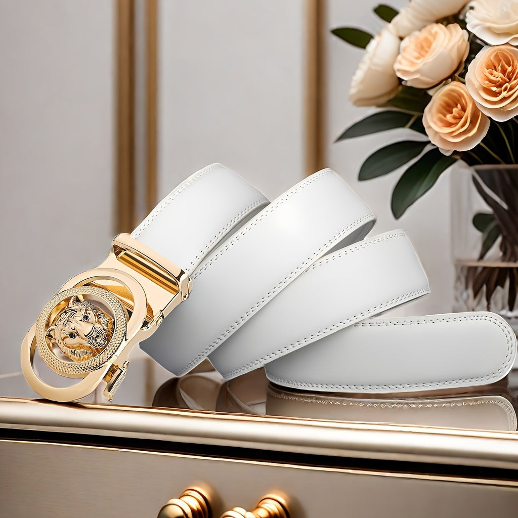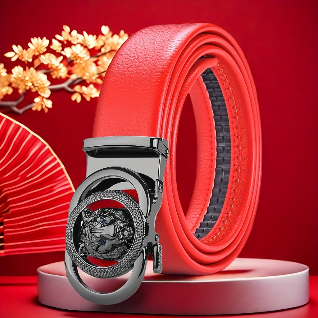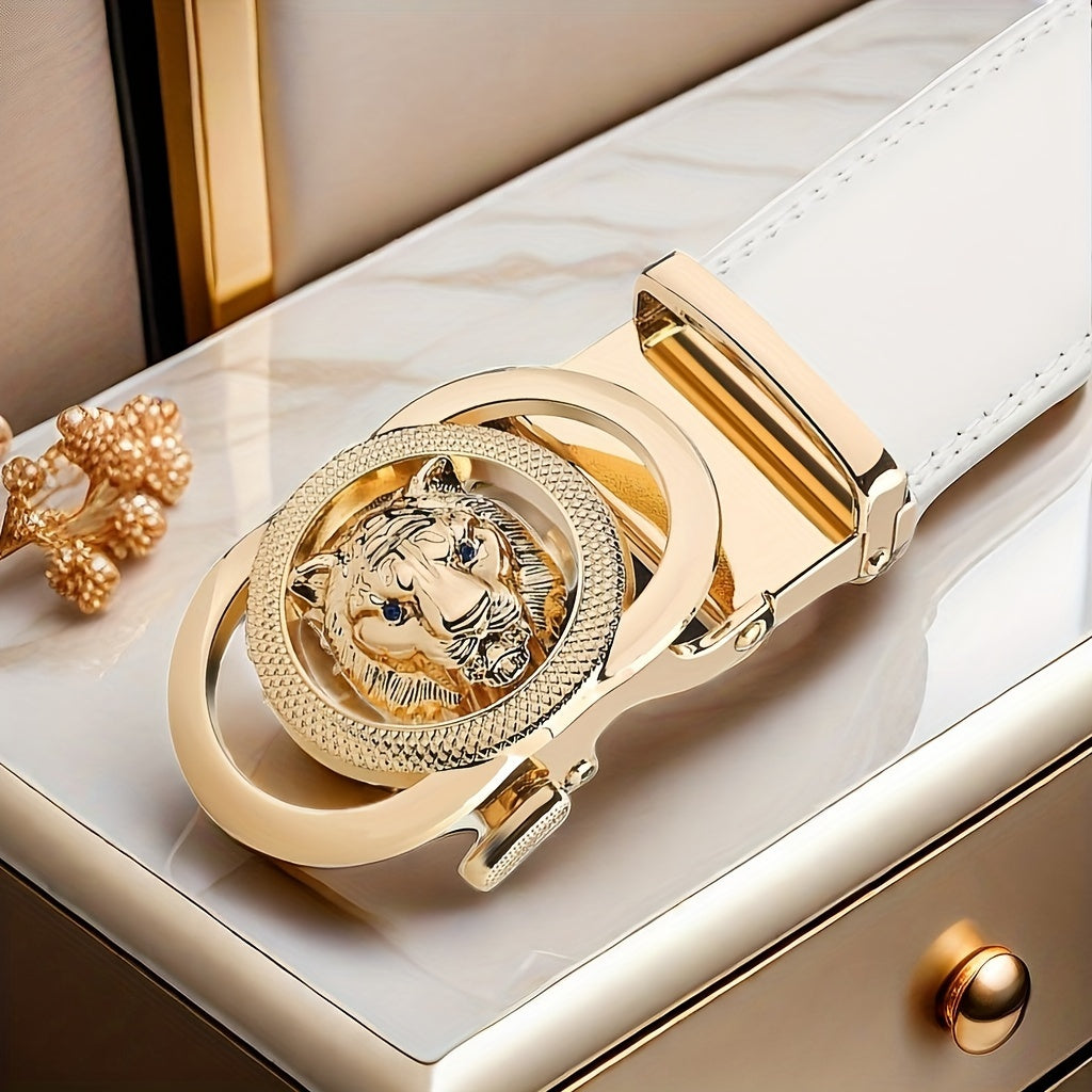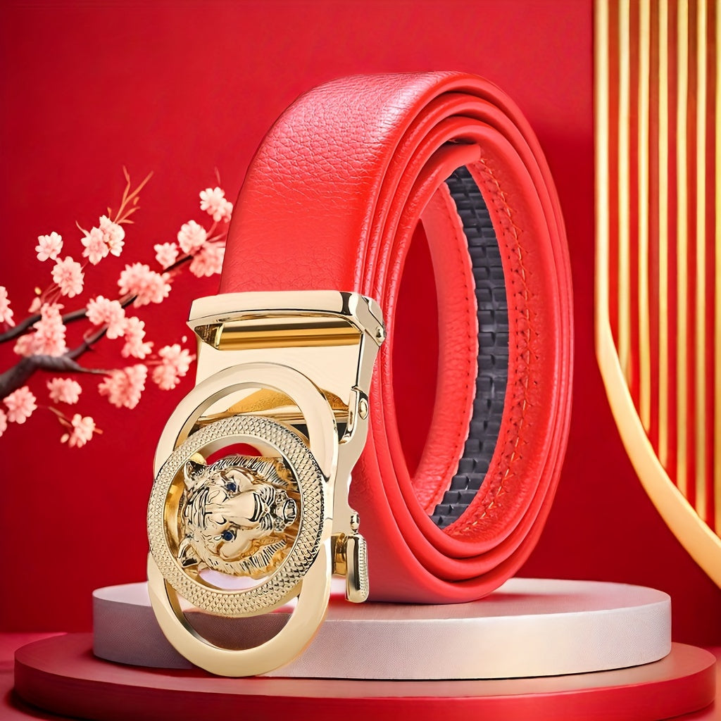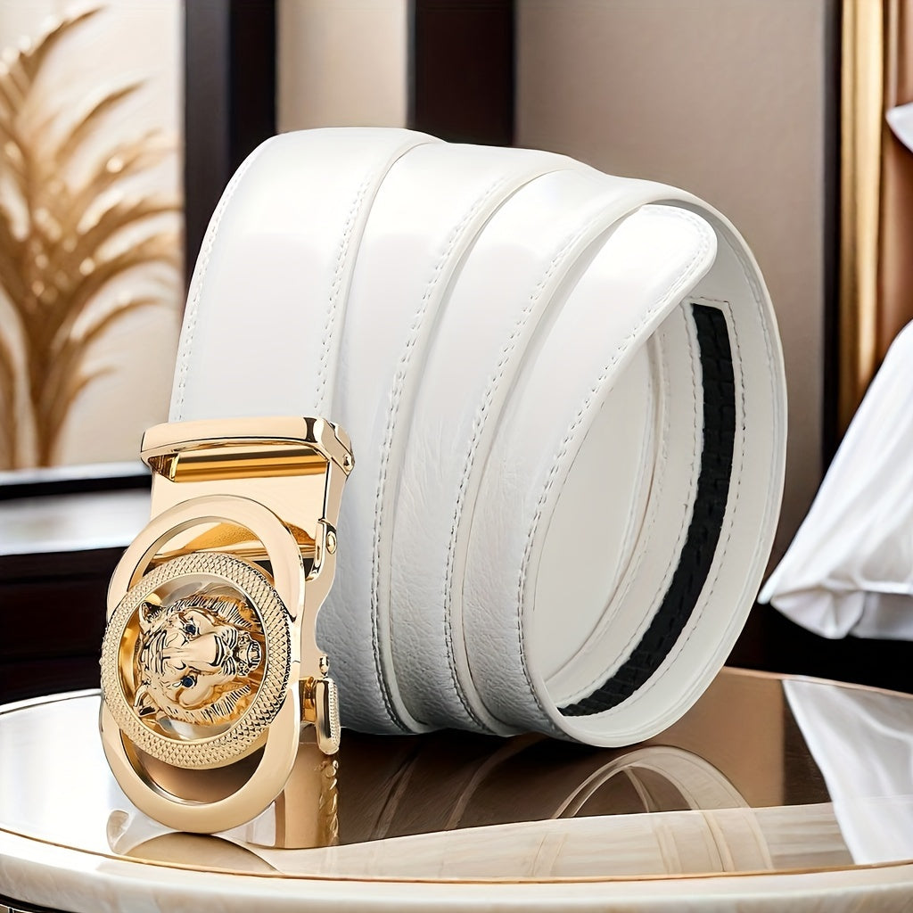 This men's leather belt features a stylish golden tone automatic buckle, making it perfect for business, casual, or wedding attire. It's a great gift for husbands and fathers.