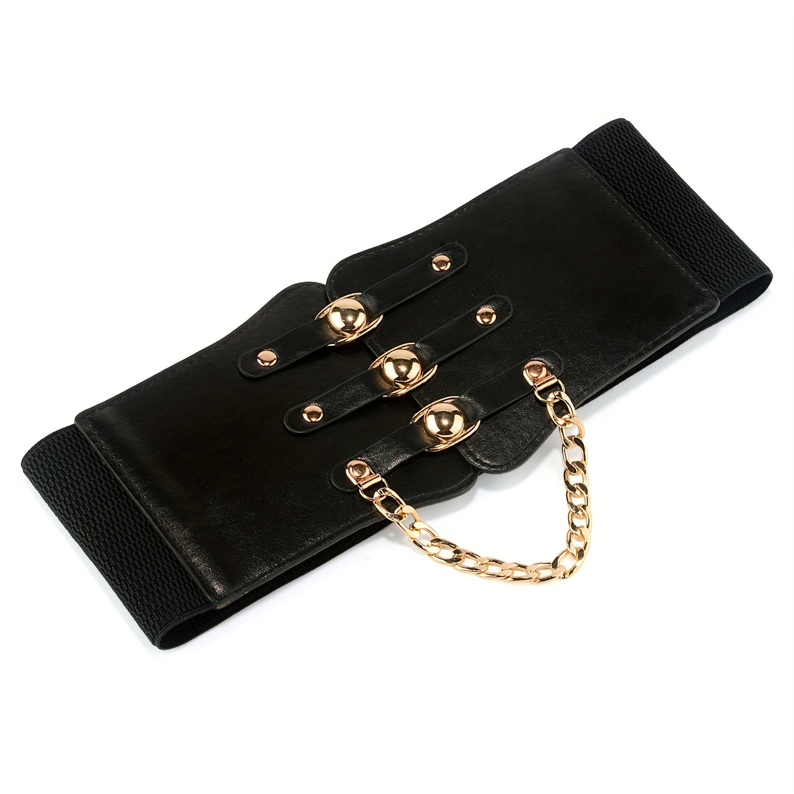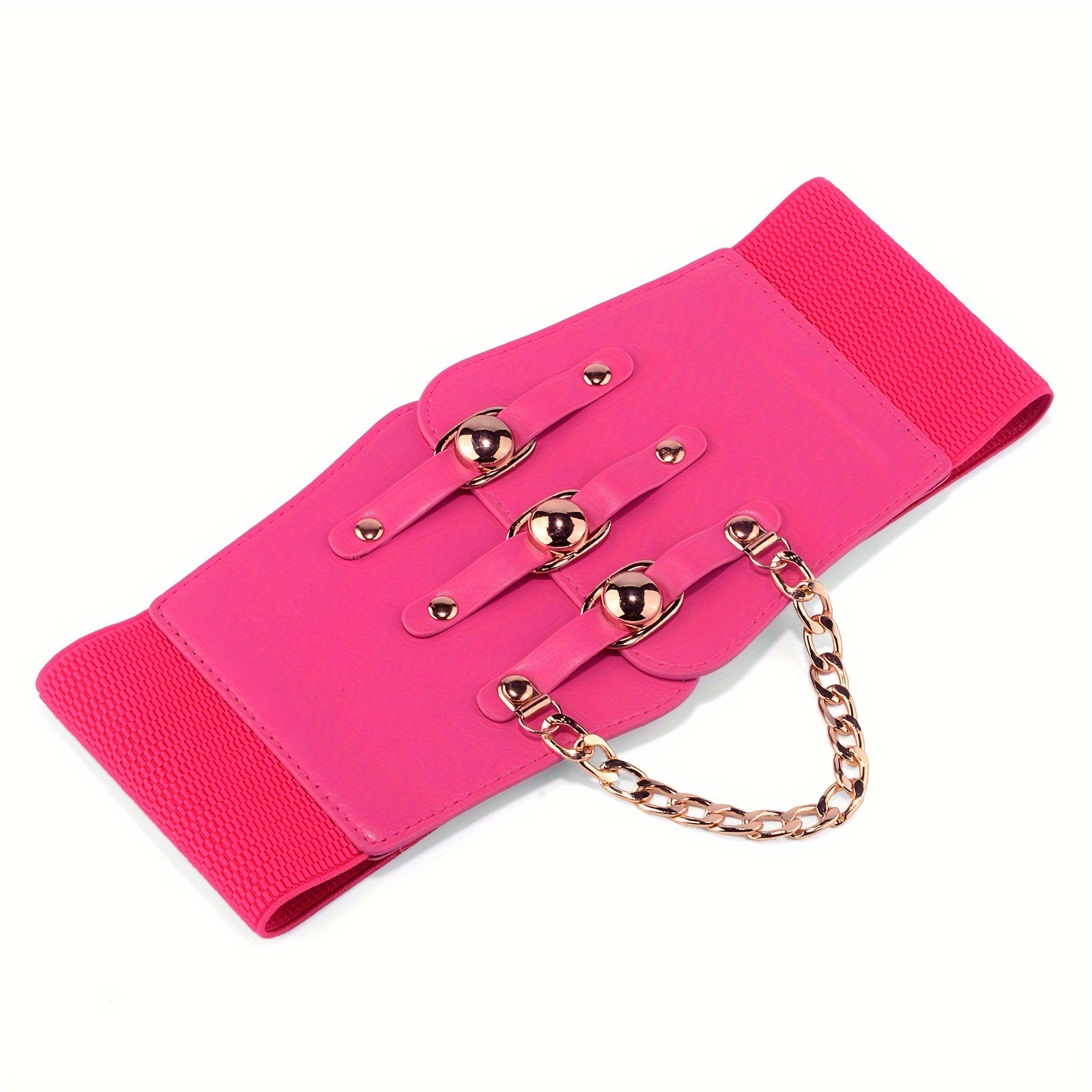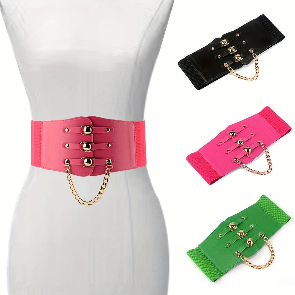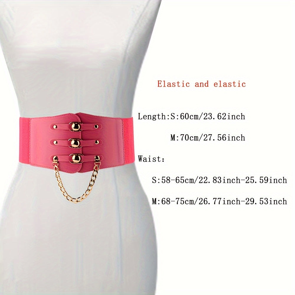 Add a touch of style to your outfits with this versatile wide belt featuring metal chain decoration. The elastic PU material provides a comfortable fit.
