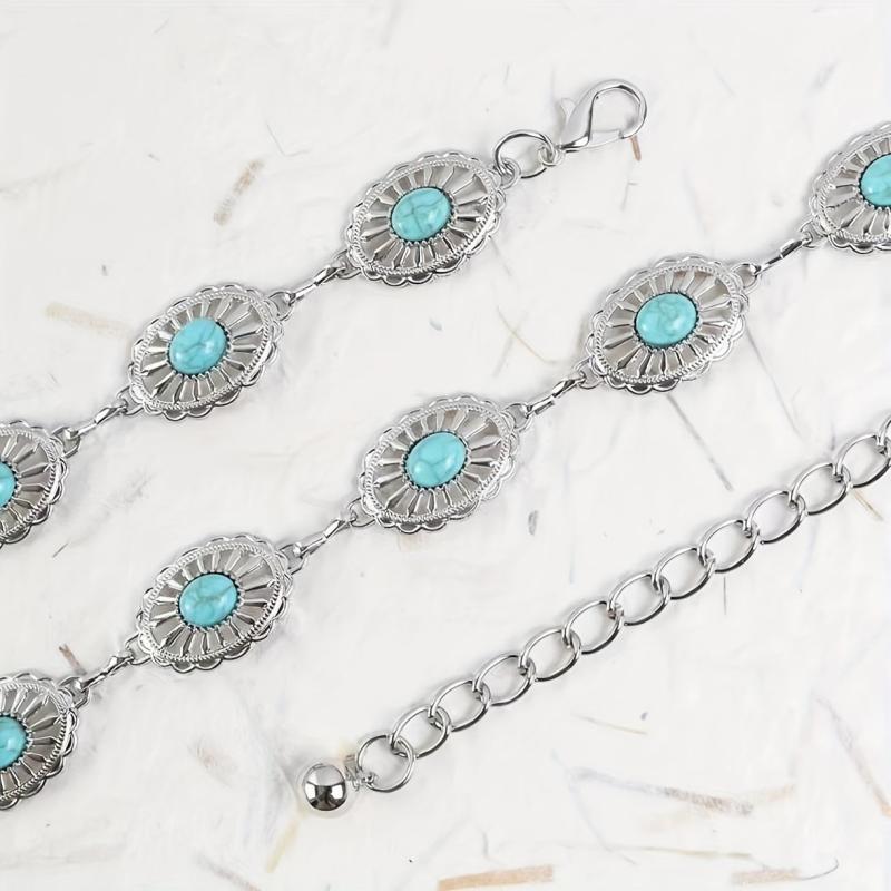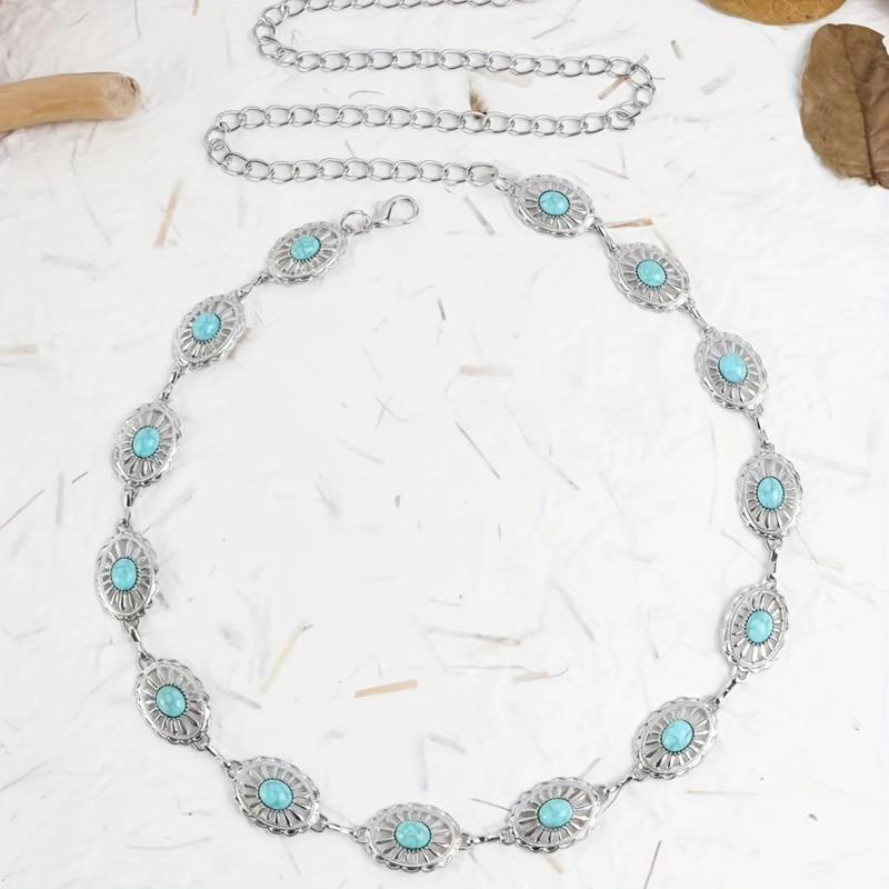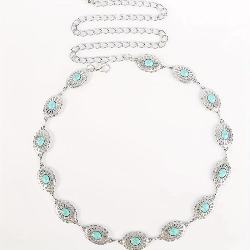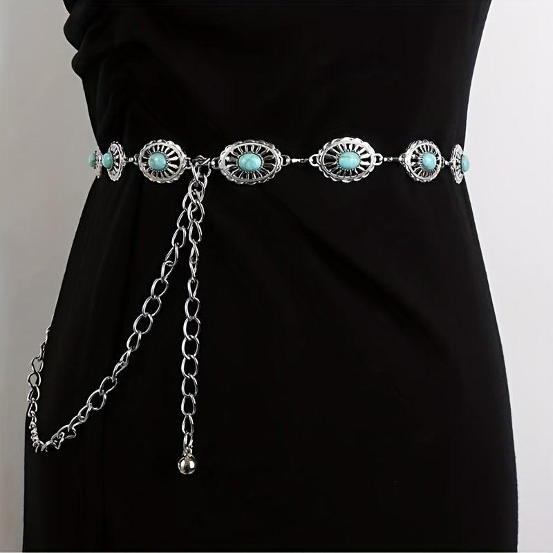 Elevate your outfit with this vintage-inspired silvery waist belt featuring ancient accessories.
