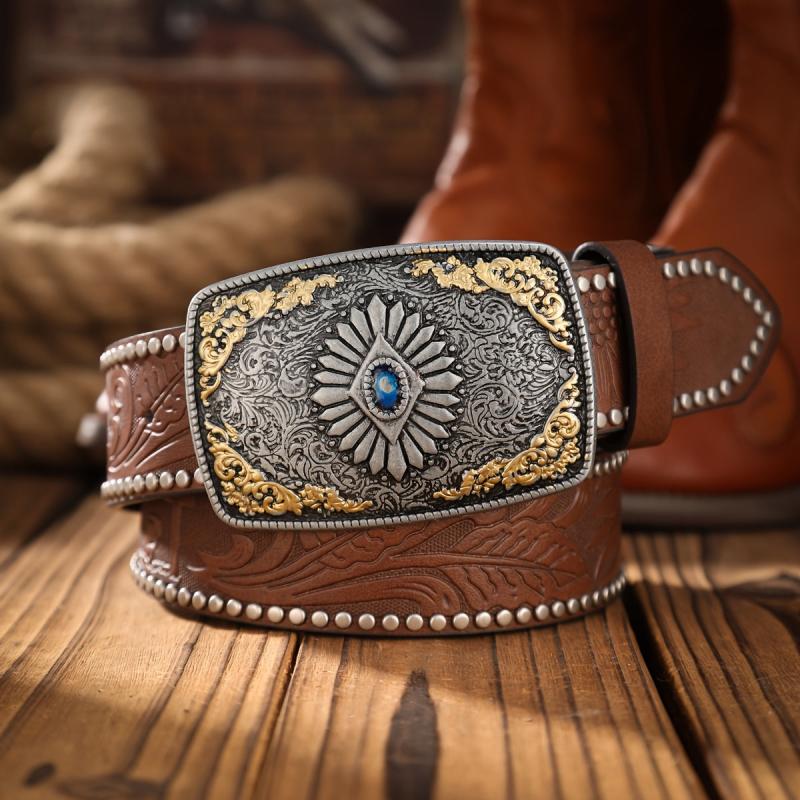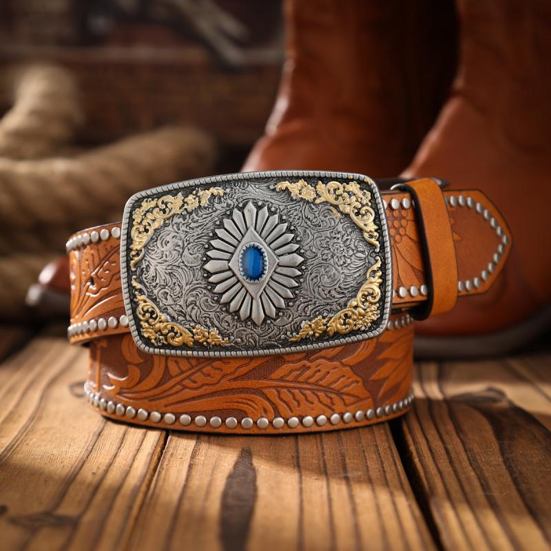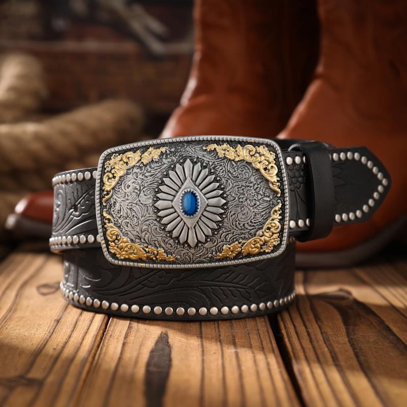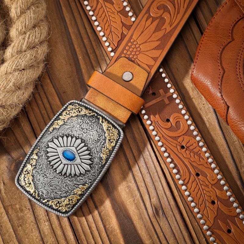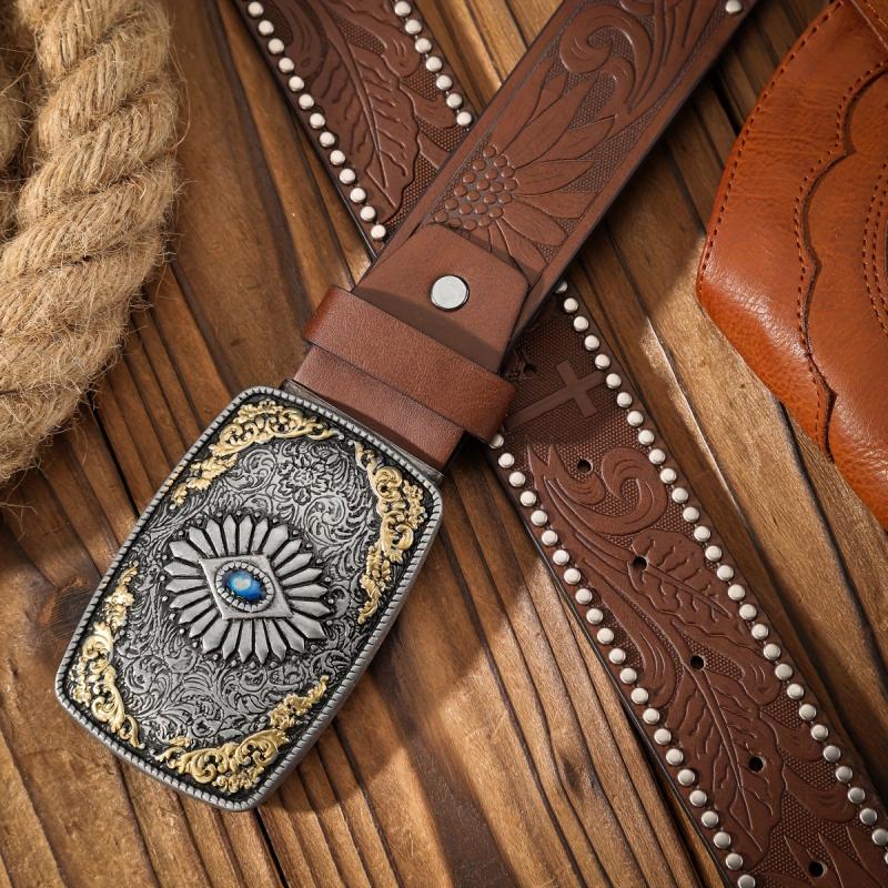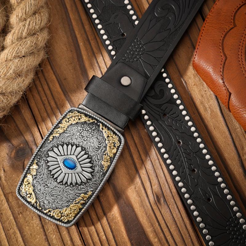 This fashionable belt features a retro western style metal buckle with PU print design. It is suitable for men, women, and teens who want to add a touch of vintage charm to their outfit.