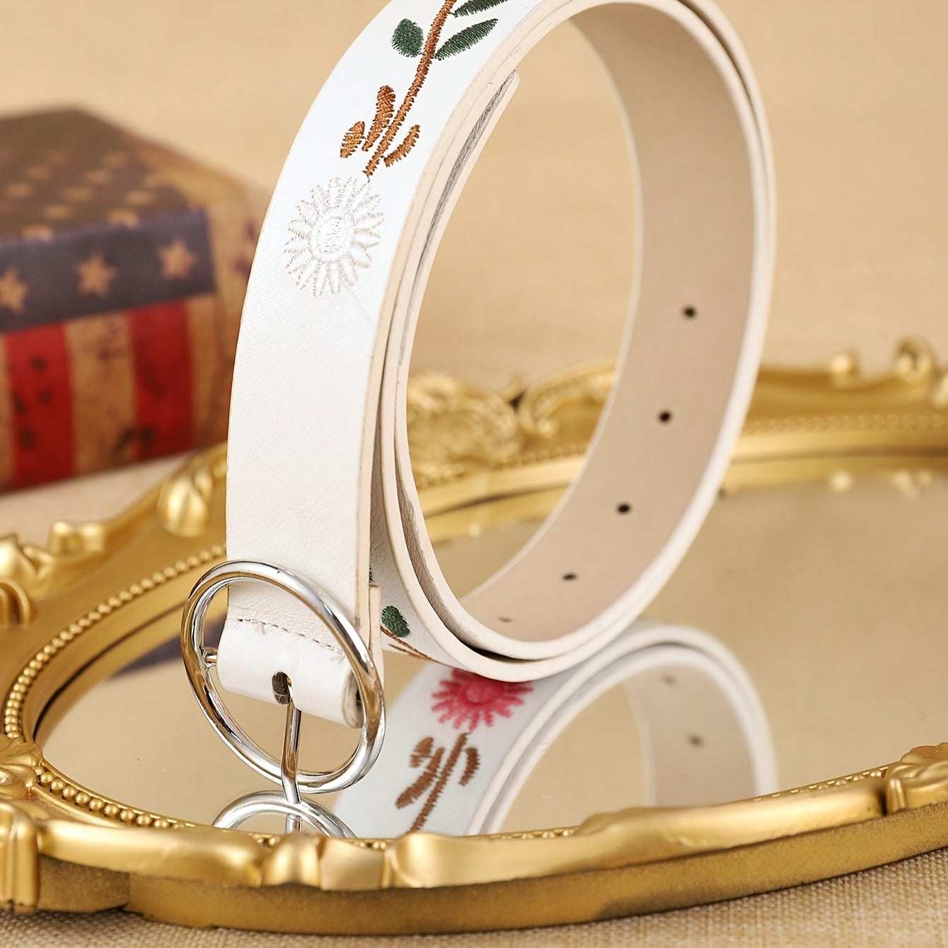 Elevate your outfit with this trendy PU belt featuring beautiful embroidered flowers. Perfect for evening dates or casual outings.