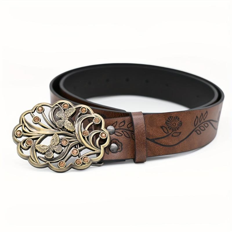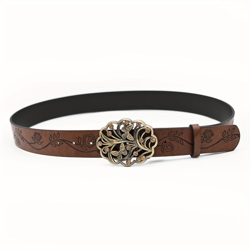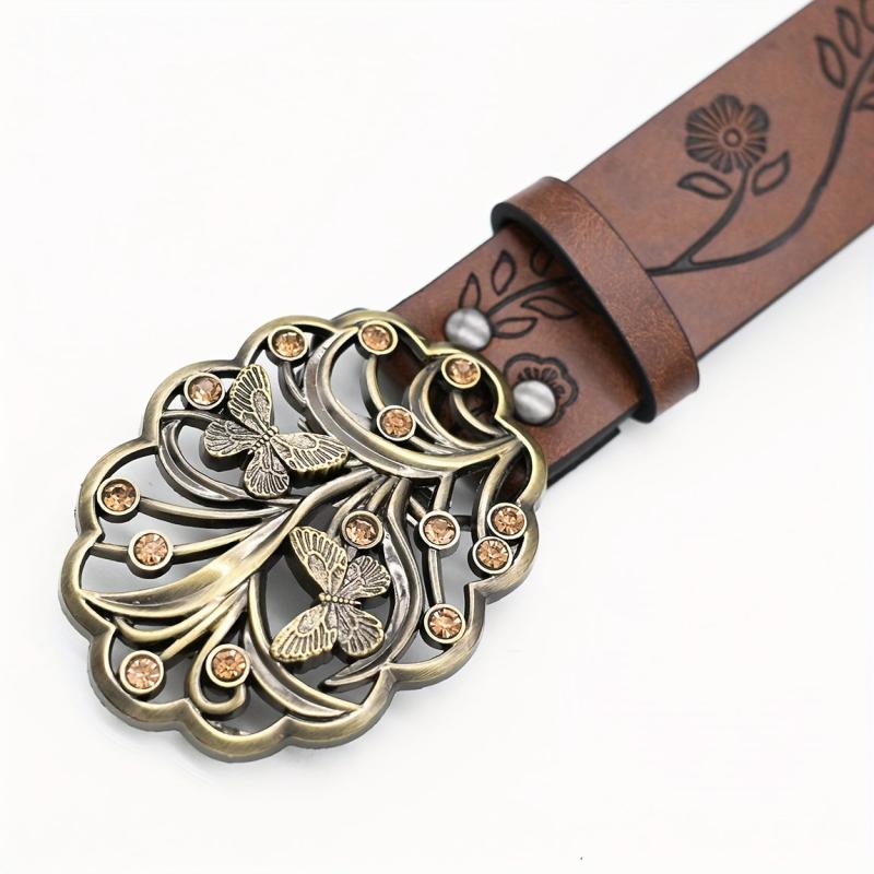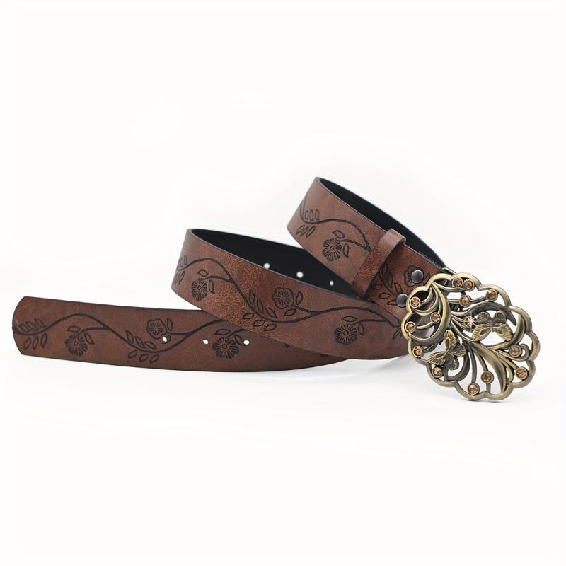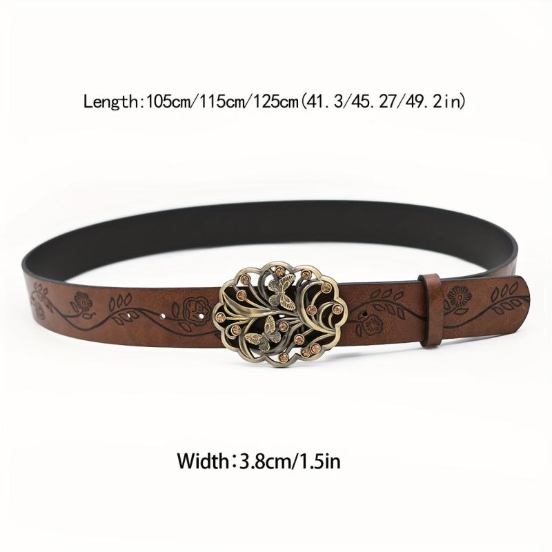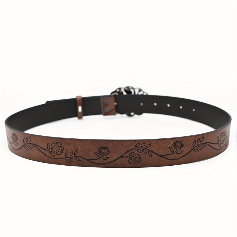 Elevate your style with this western retro denim belt featuring a large plate buckle and cow head embossed design. The flower pattern carved on the belt adds a unique touch to your street wear look.