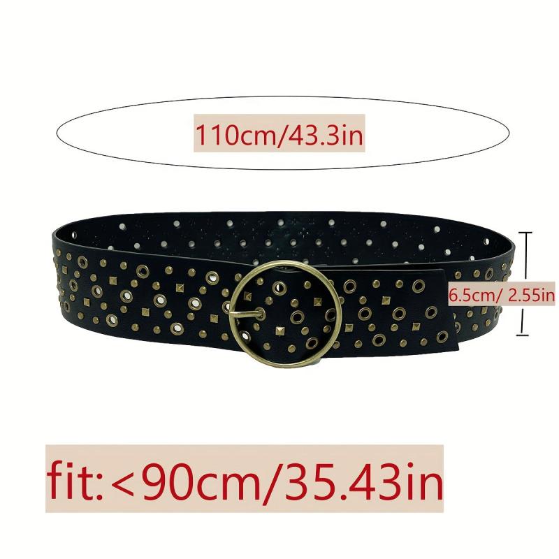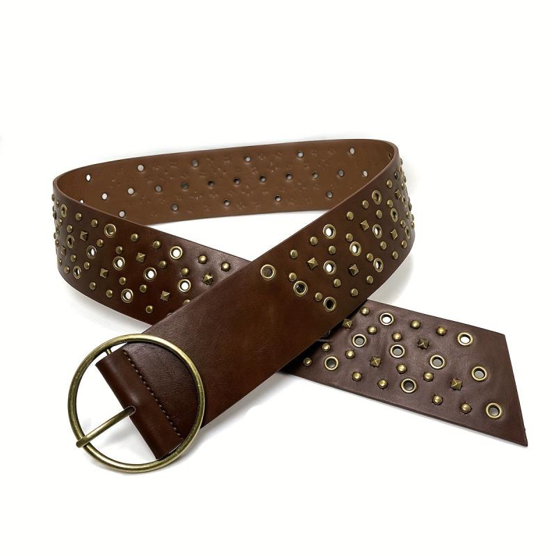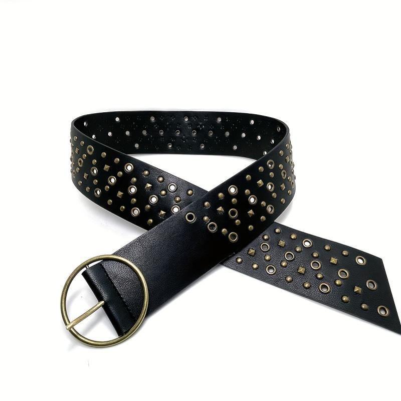 Add a touch of edgy style with this wide belt featuring studs and a metallic ring buckle. Perfect for casual or party outfits, especially with jeans.