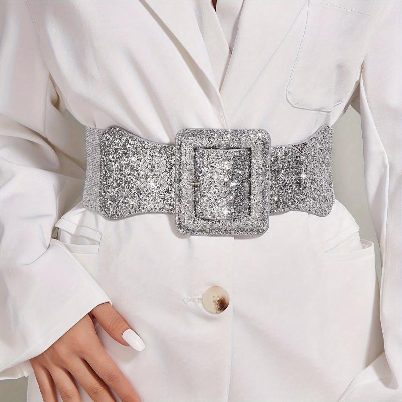 Add a touch of glamour to your outfits with this sparkly sequin waist cincher belt featuring a large buckle. Perfect for casual, business attire, daily wear, parties, and special occasions.