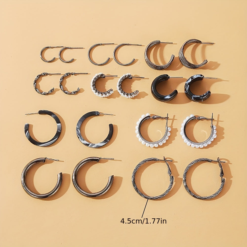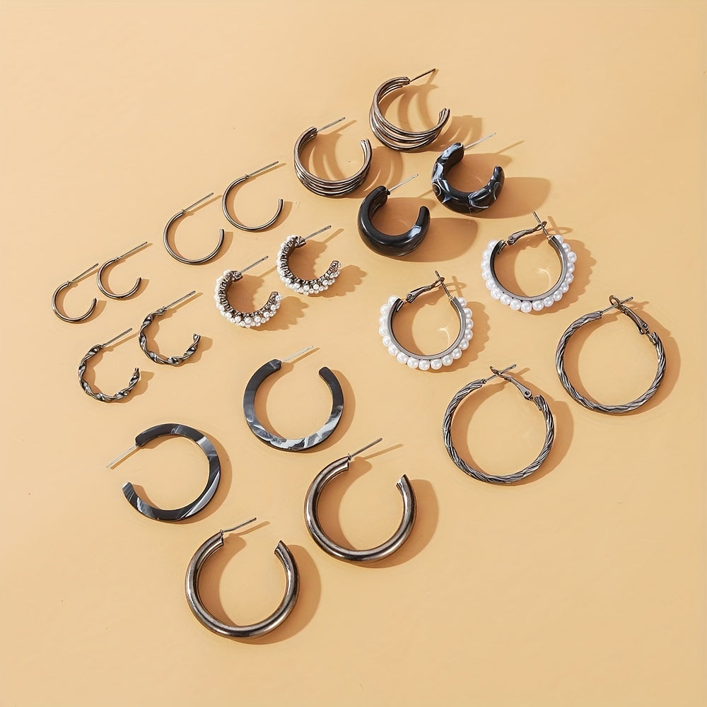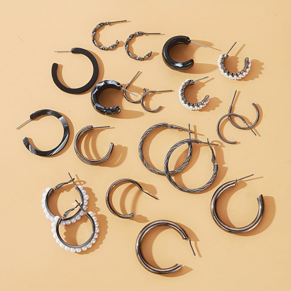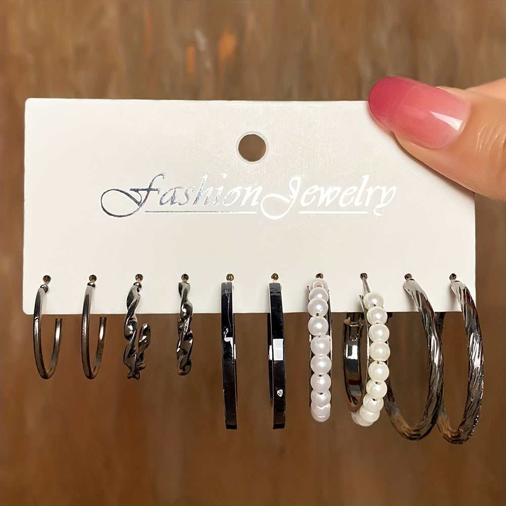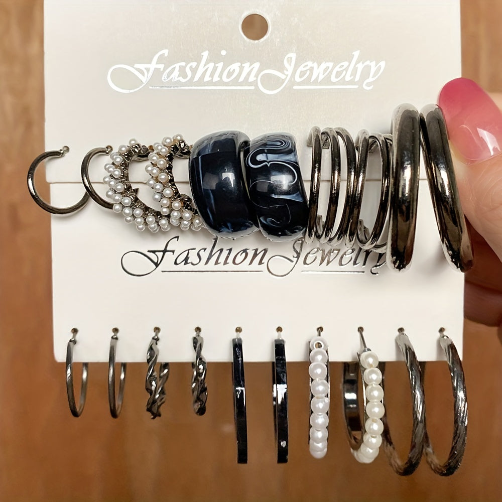 This set includes 10 pairs of hoop earrings with faux pearl decoration. Perfect goth style accessory for women and girls. Great gift idea.