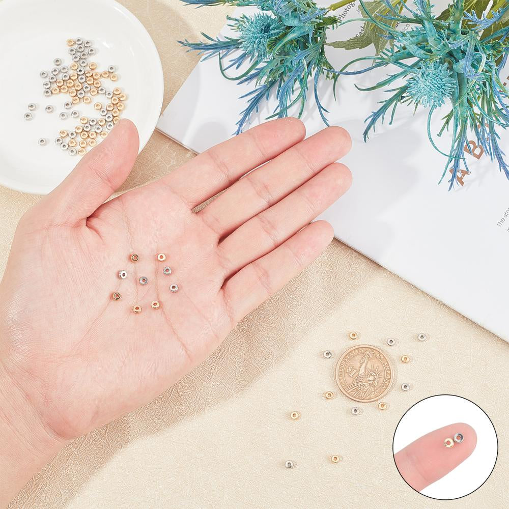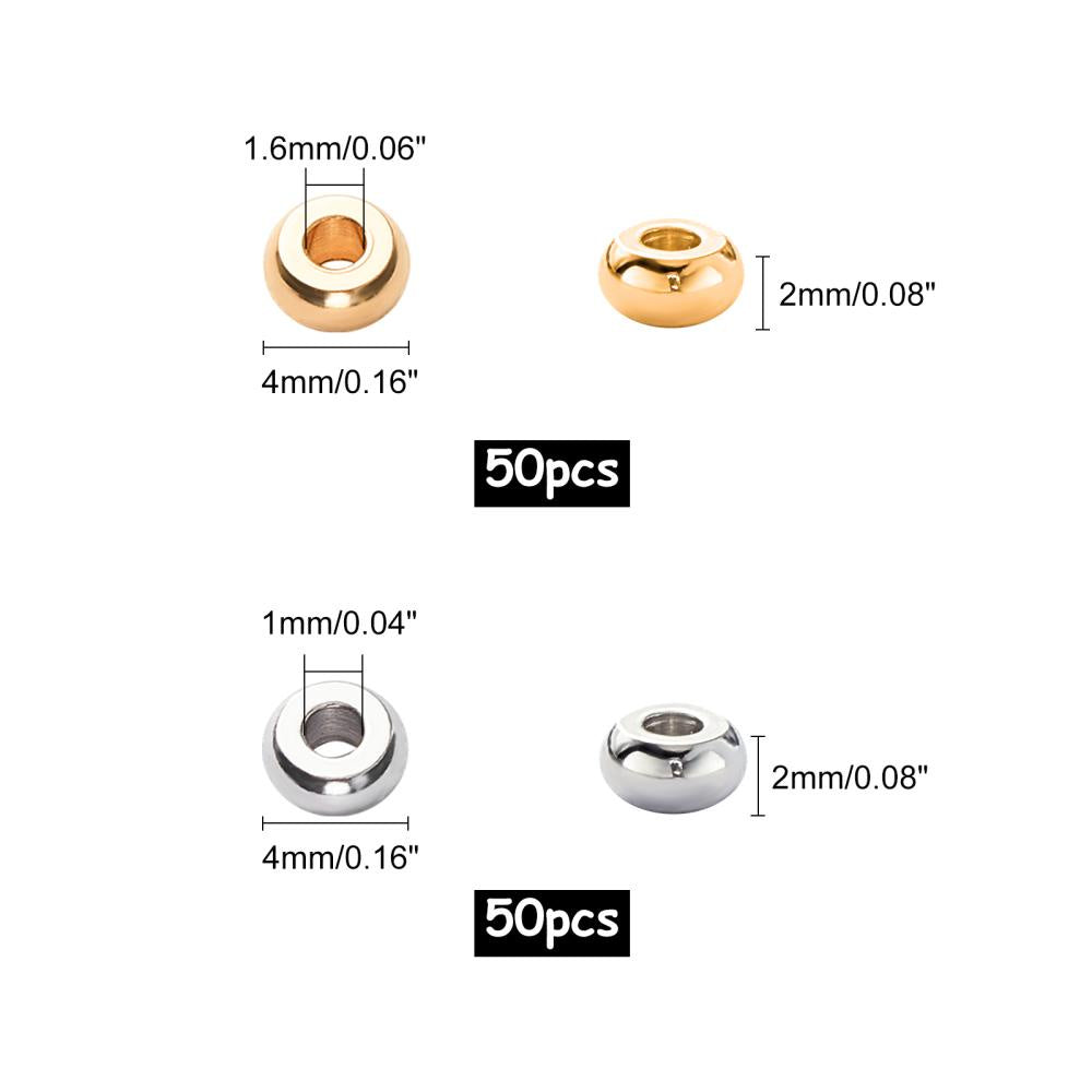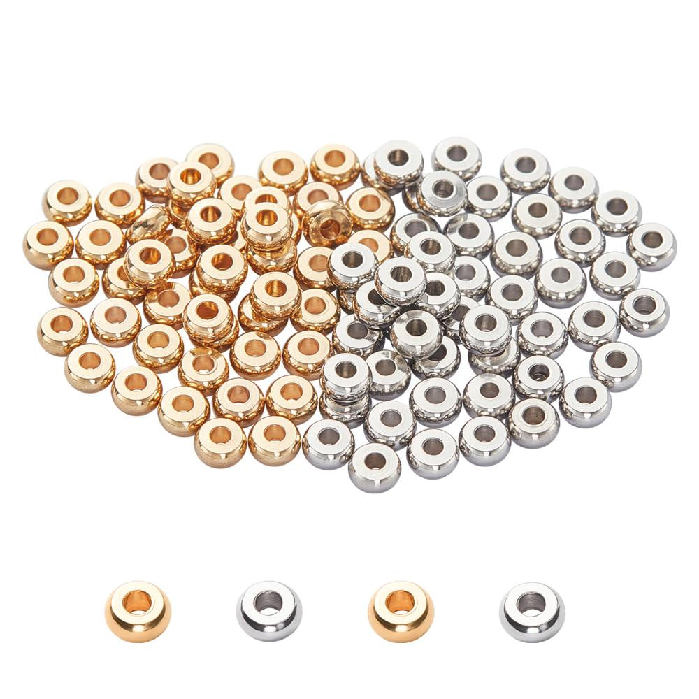 This pack includes 100 tiny flat round spacer beads made of high-quality stainless steel. They are golden and stainless steel in color, measuring 4mm in diameter. Perfect for jewelry making and crafting projects.