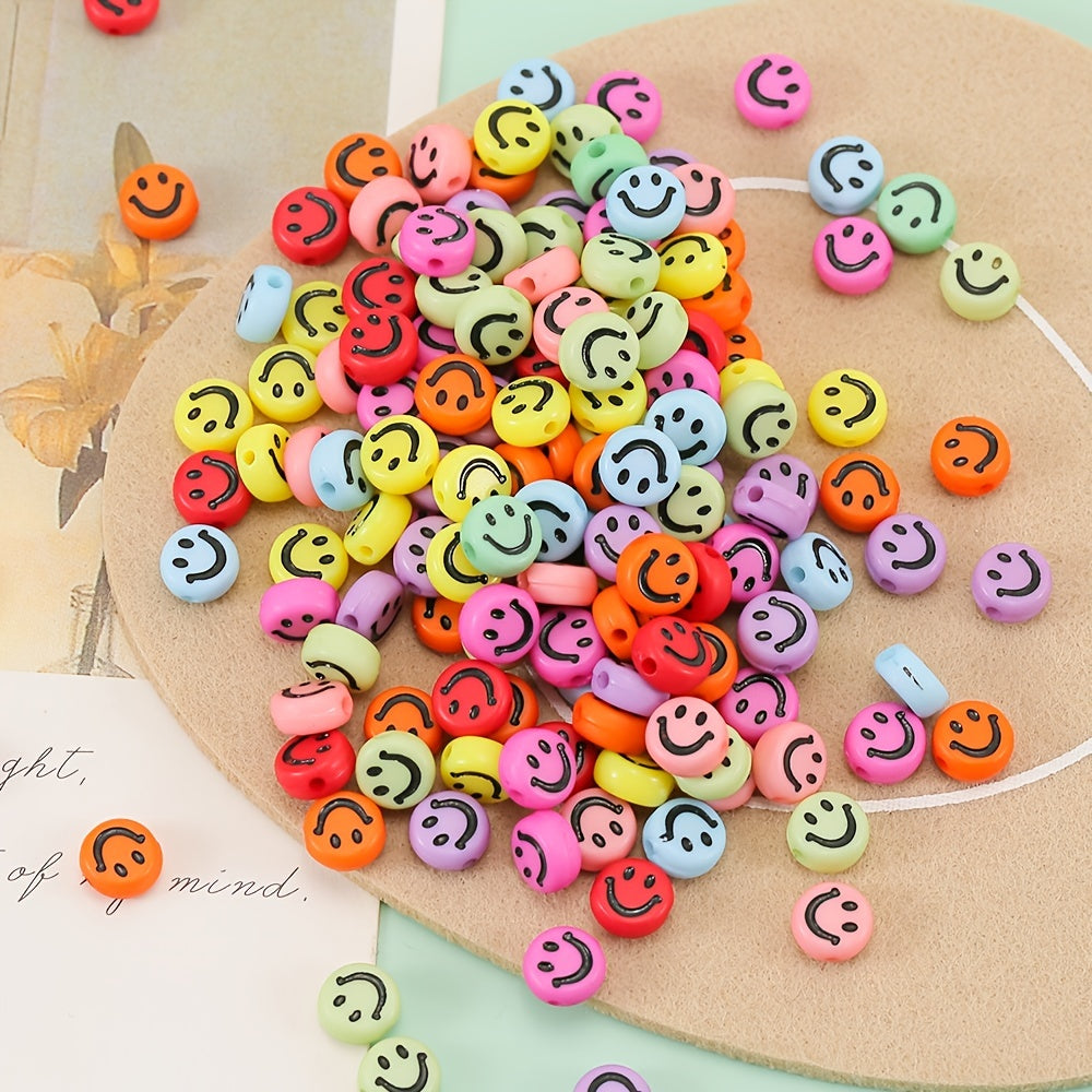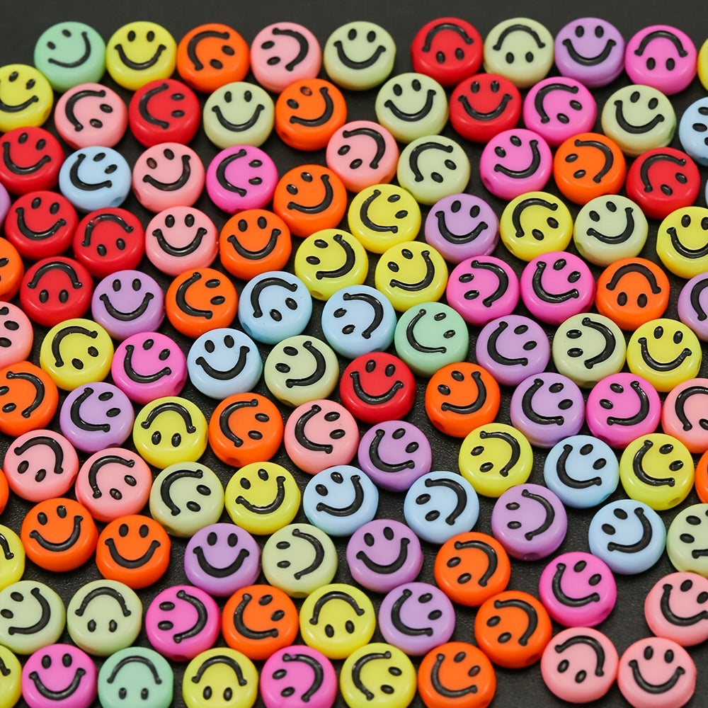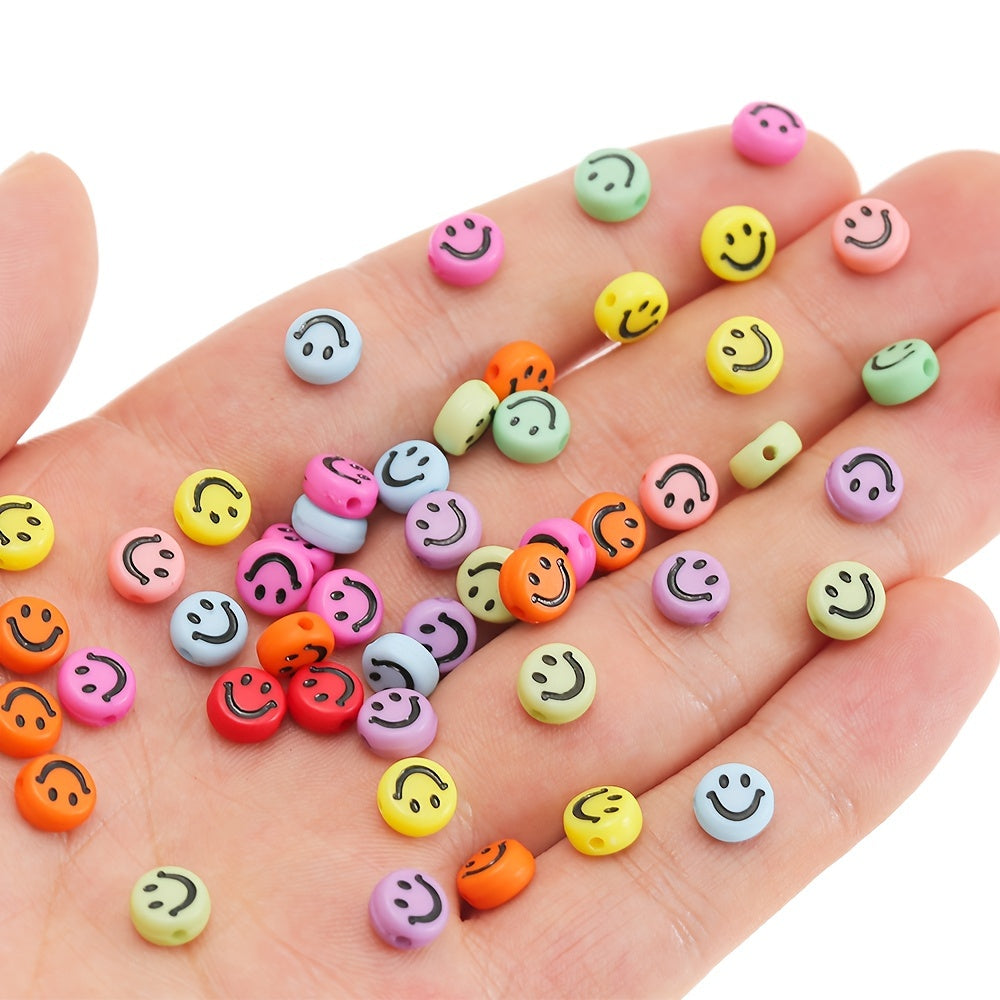 Add a touch of cheer to your DIY jewelry projects with these 6mm multicolor acrylic happy face beads. These plastic flat round smiling beads are perfect for creating fun and vibrant bracelets and other accessories.