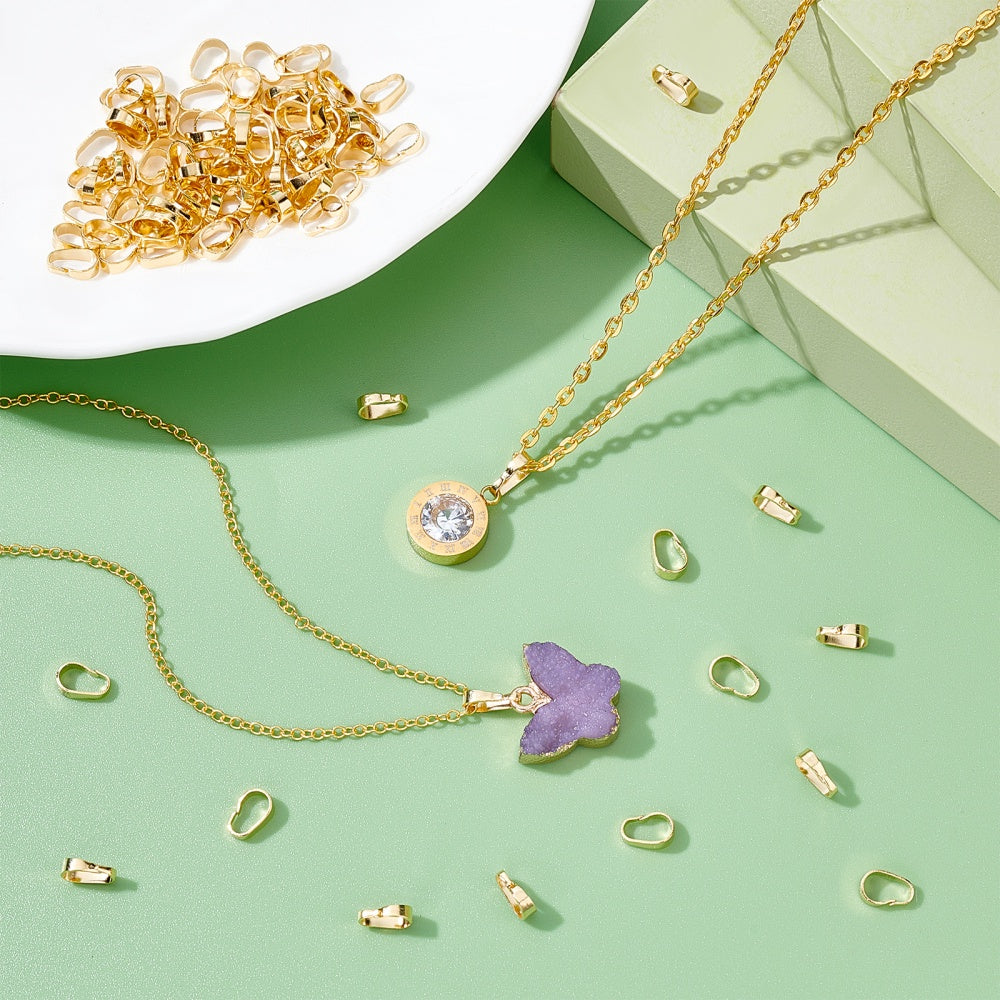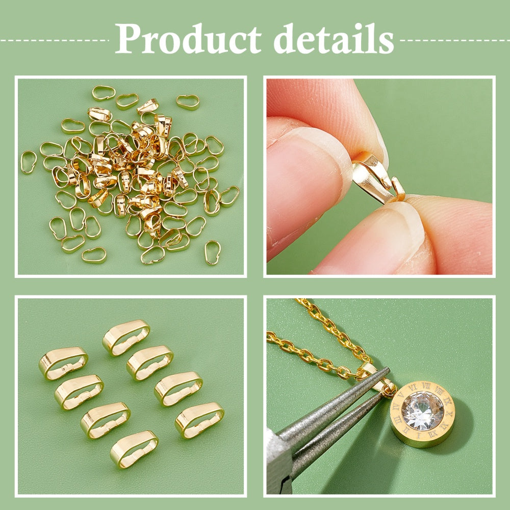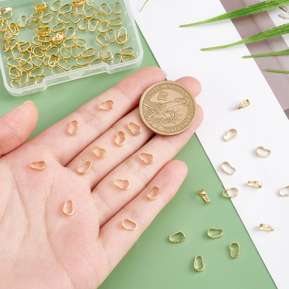 Get 100pcs of brass snap on bails for easy chain connector DIY projects. Perfect for pendant necklaces and jewelry making.