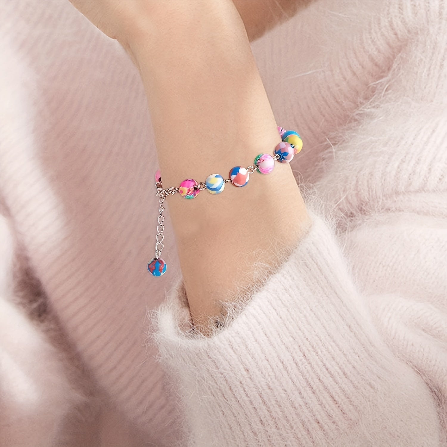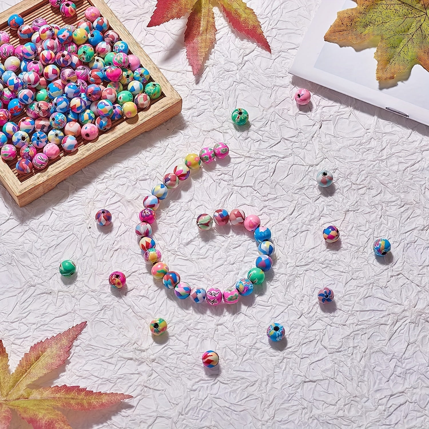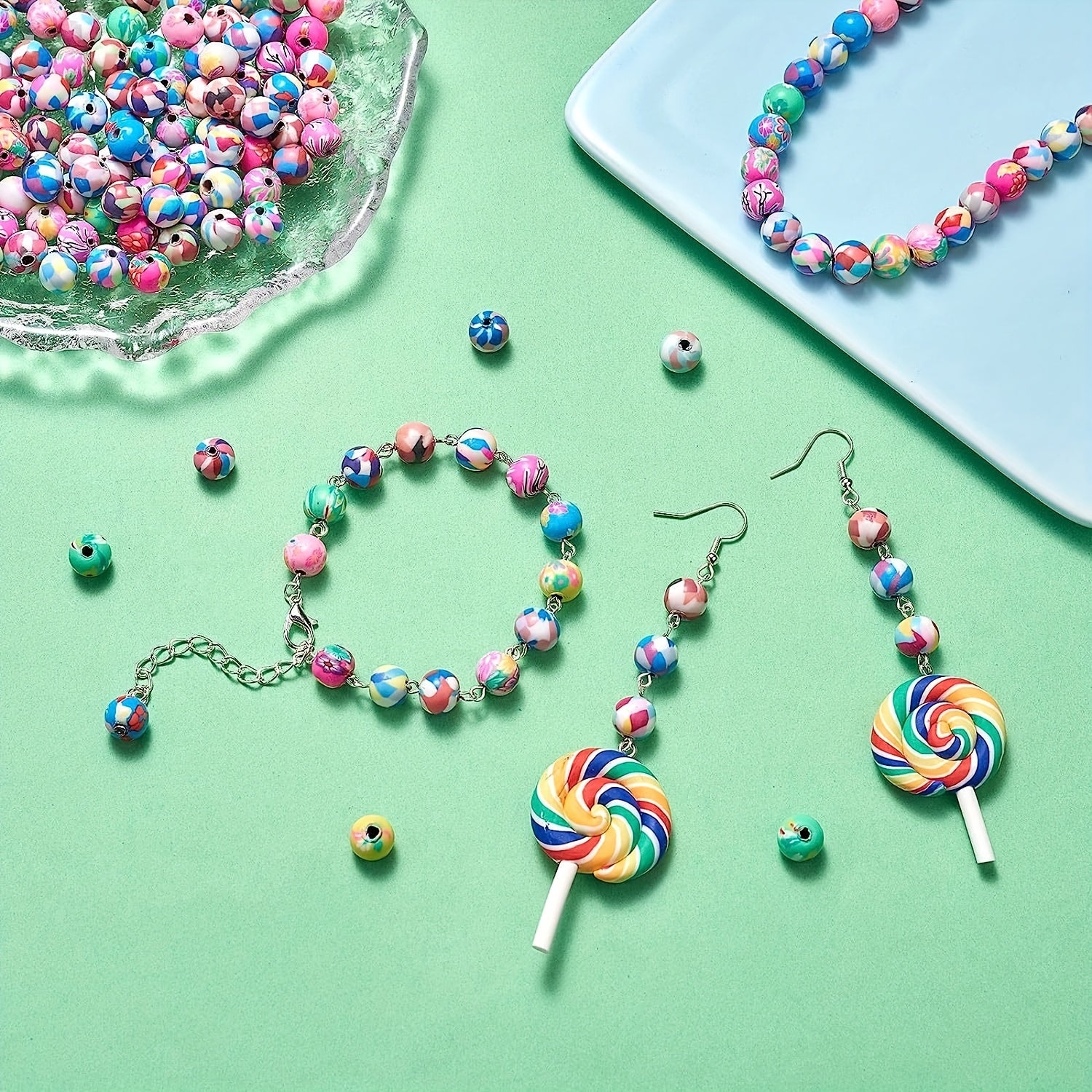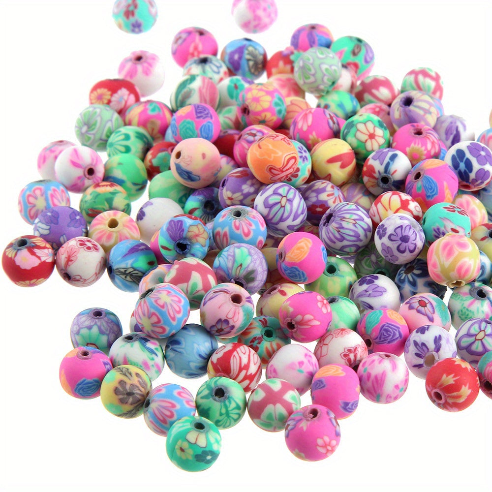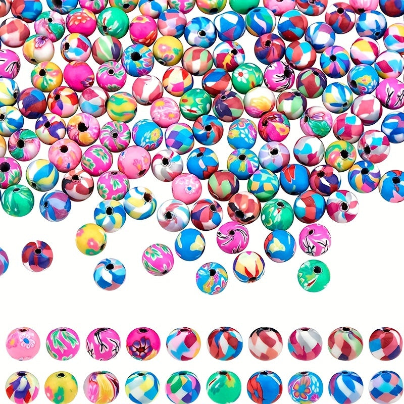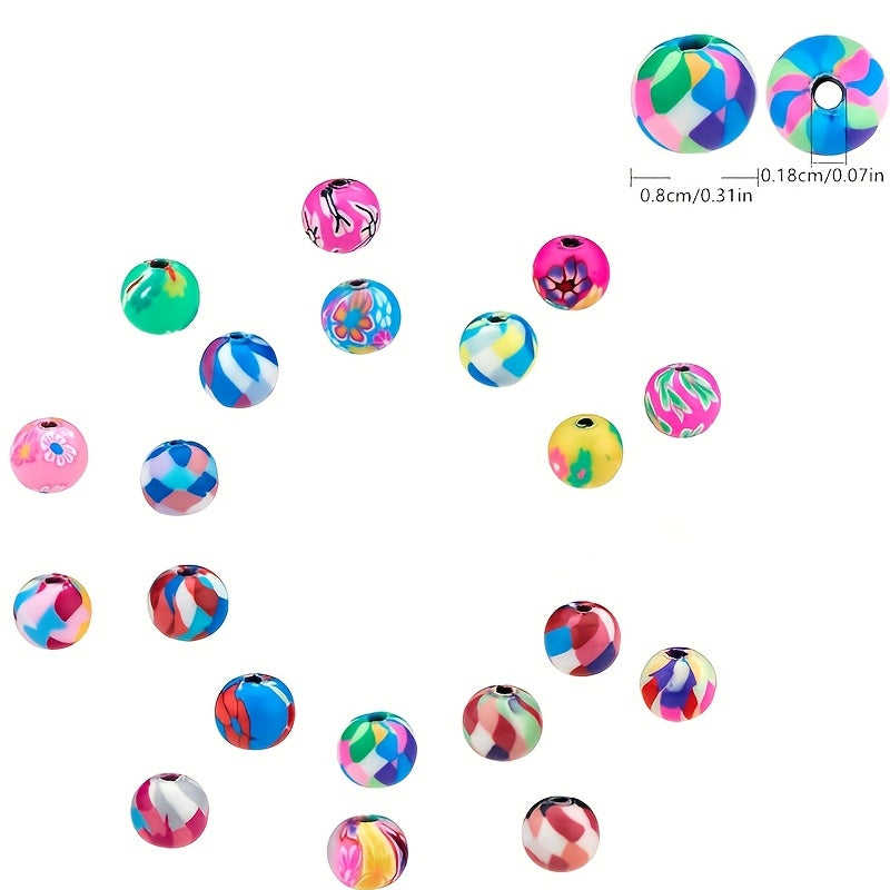 This set includes 100 round spacer polymer clay beads with various patterns, ideal for creating earrings, bracelets, necklaces, and other accessories.