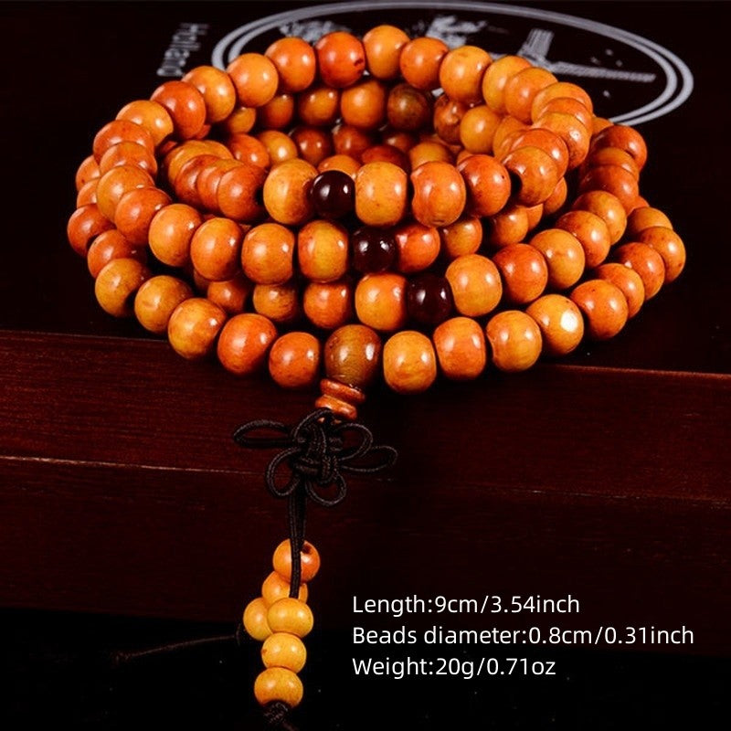 This wooden bracelet features 108 beads made of 8mm natural sandalwood, perfect for meditation and prayer. The beads are strung together with a knot design and made of ebony wood, providing a unique and elegant look.
