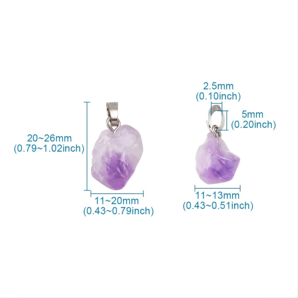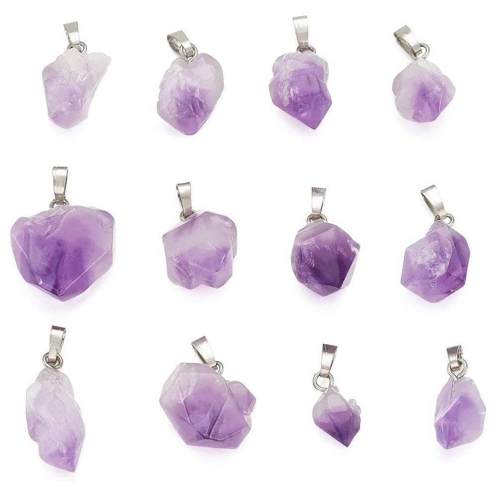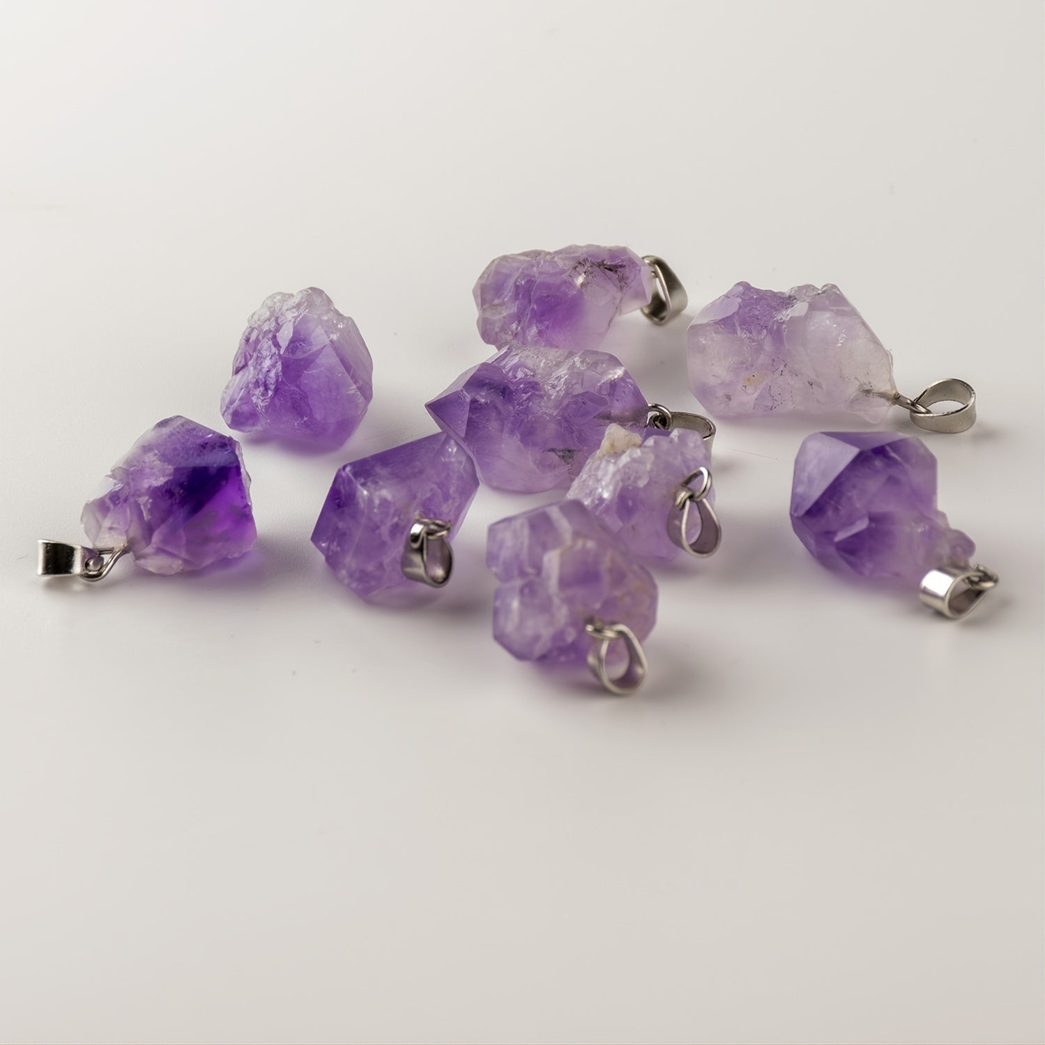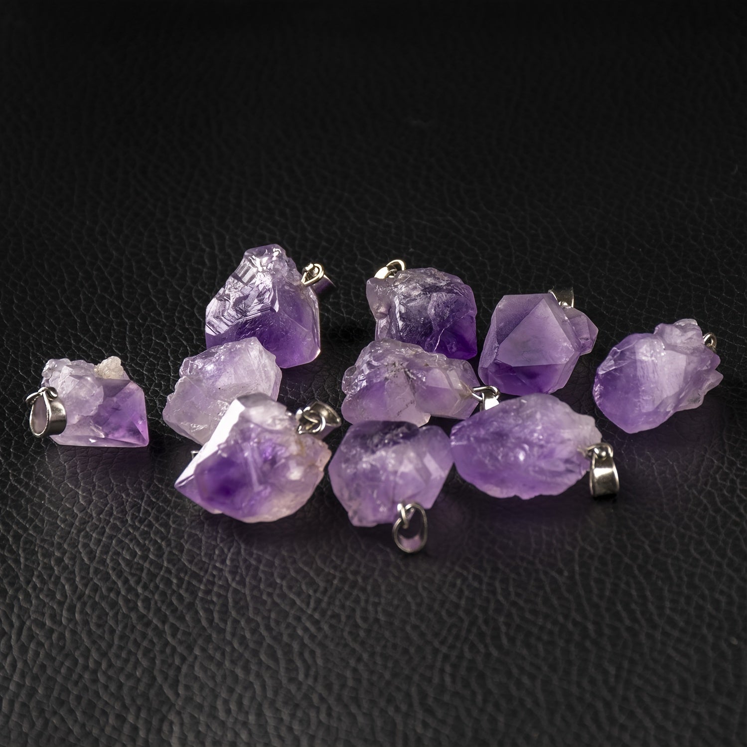 Create stunning jewelry pieces with this set of 10 natural irregular amethyst rock stone pendants. Each pendant features a unique shape and color, adding a touch of elegance to your designs.