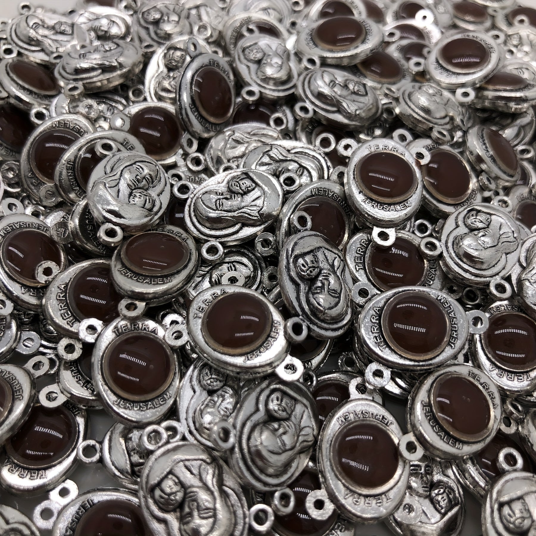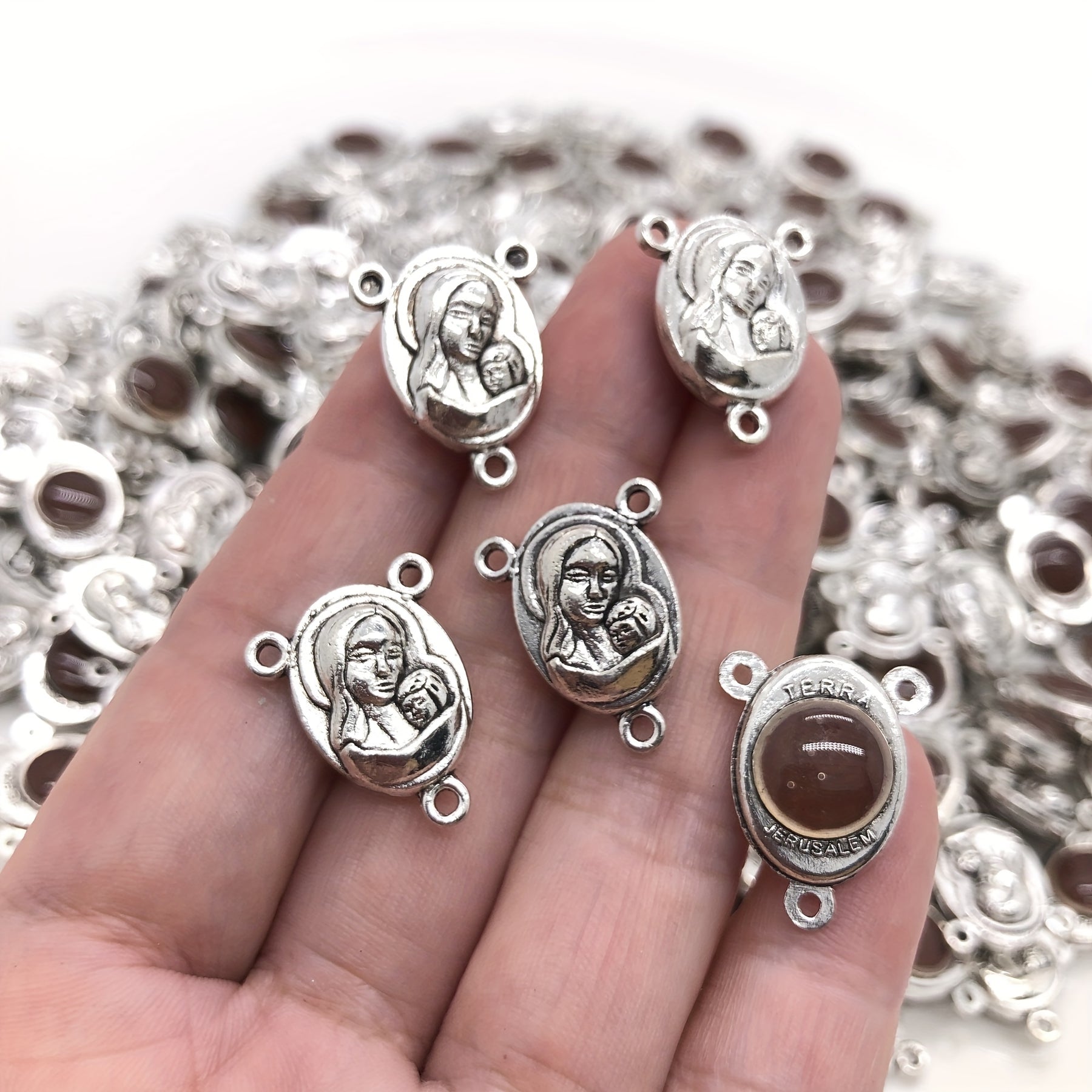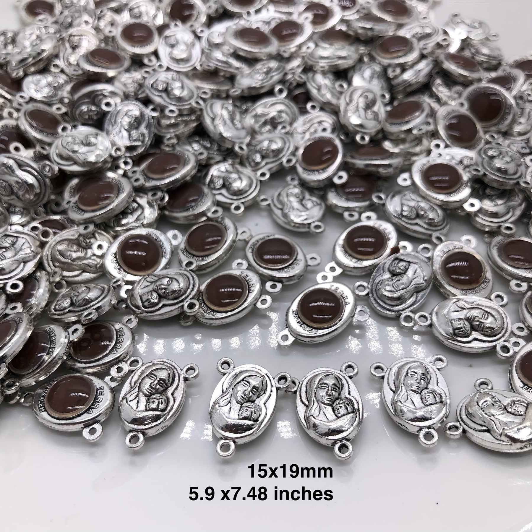 Get creative with these 10 antique silver religious rosary alloy charms pendants featuring 3 loops. Perfect for DIY earrings, bracelets, necklaces, and other jewelry making projects.