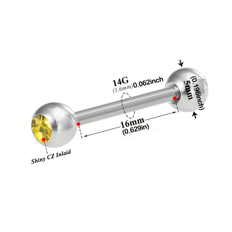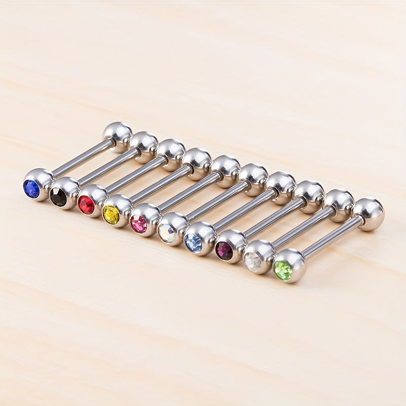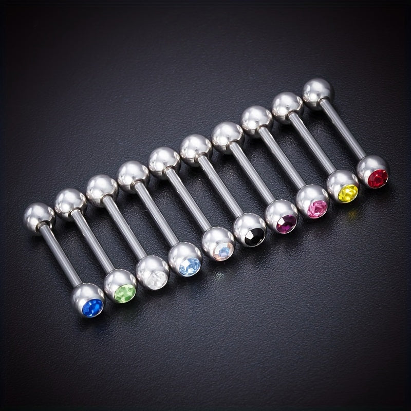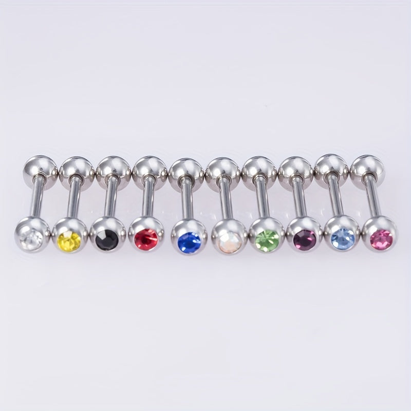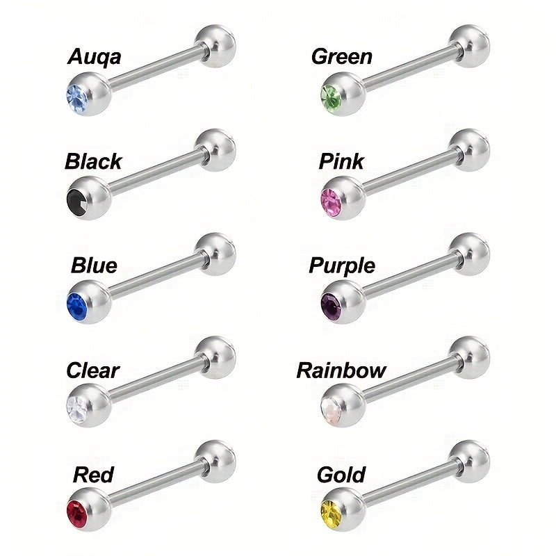 Enhance your style with these 10pcs CZ crystal gem stainless steel tongue rings for men. Each barbell measures 16mm and is perfect for tongue piercings.