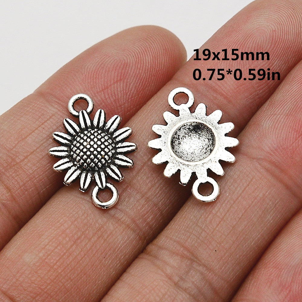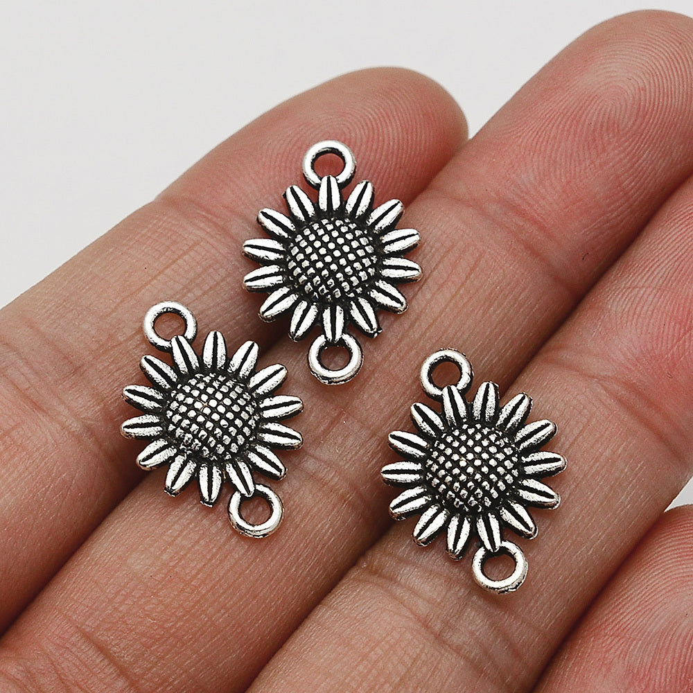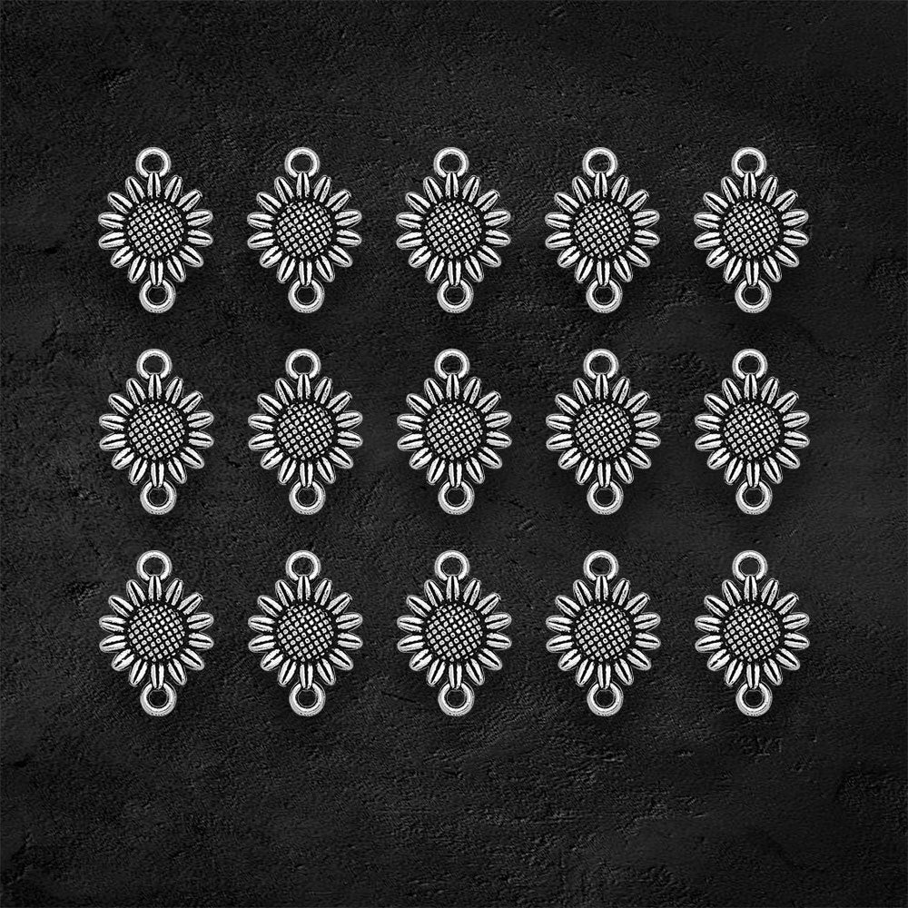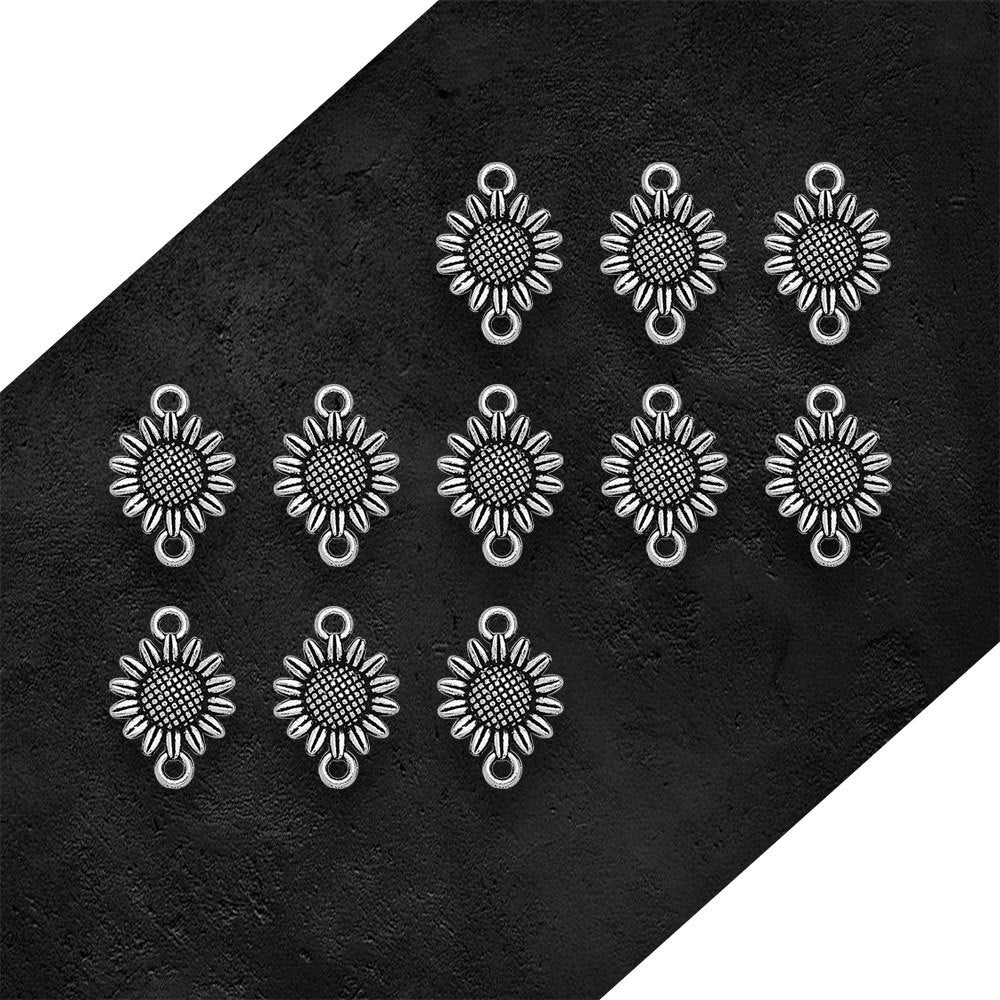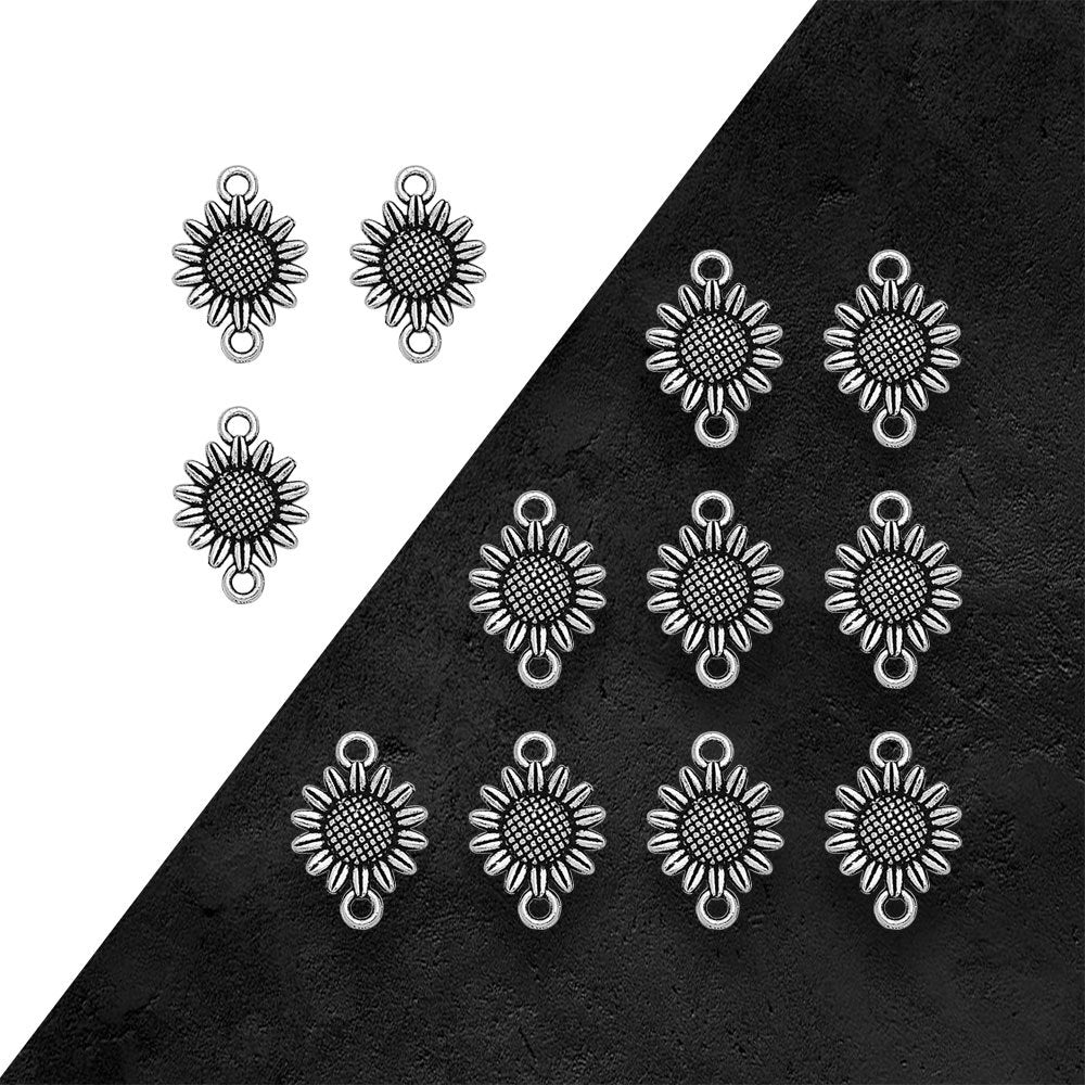 This set includes 10 antique silver plated sunflower connector charms pendants, perfect for creating unique jewelry pieces. Ideal for DIY projects and crafting.
