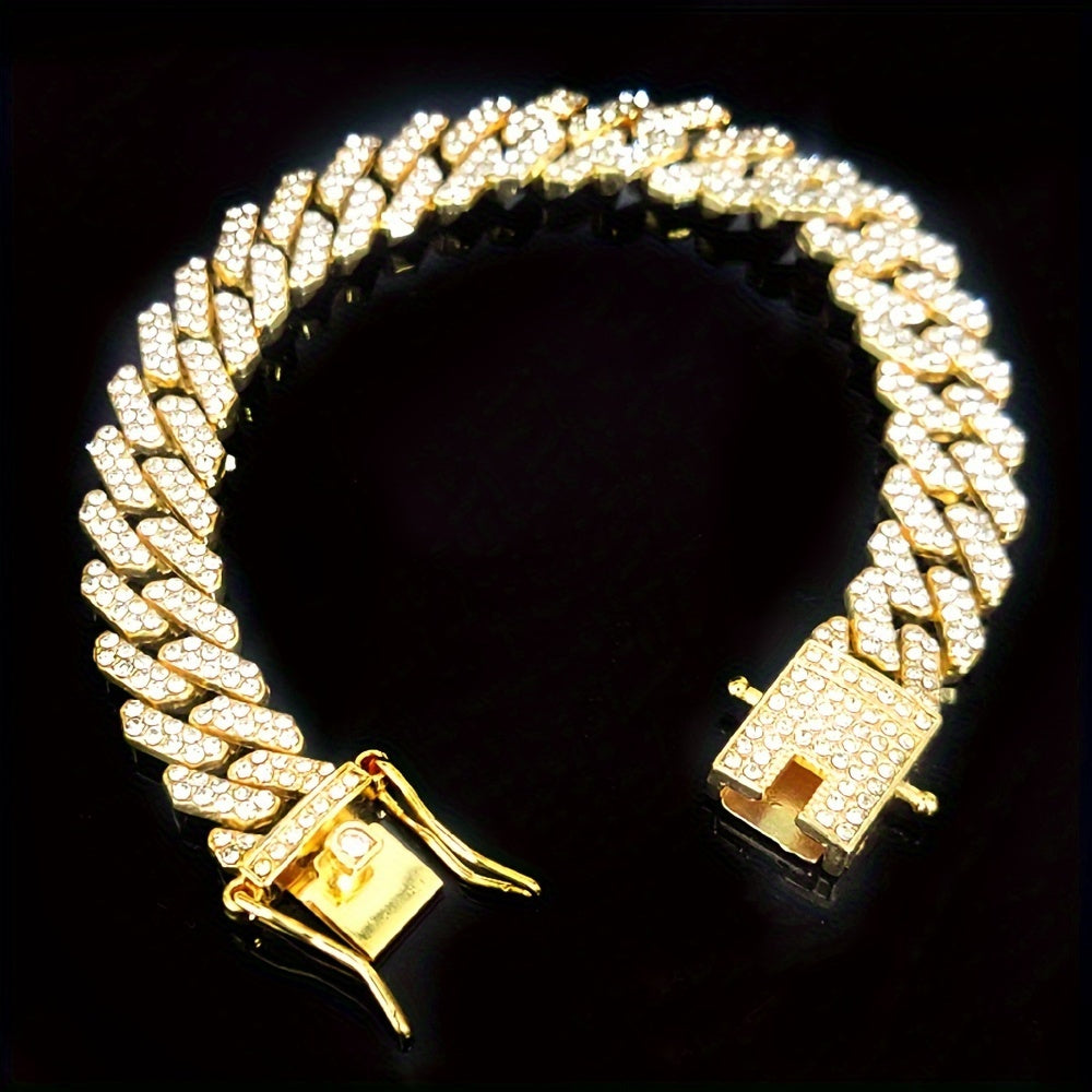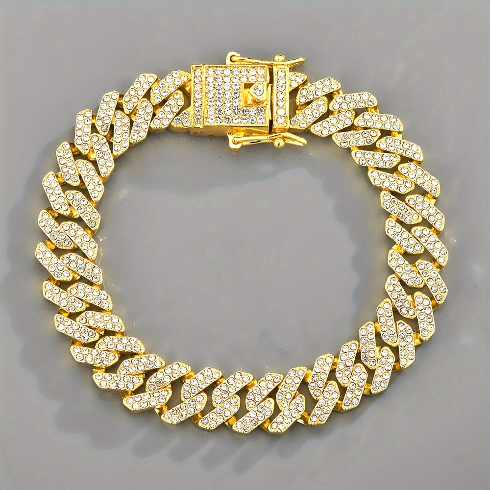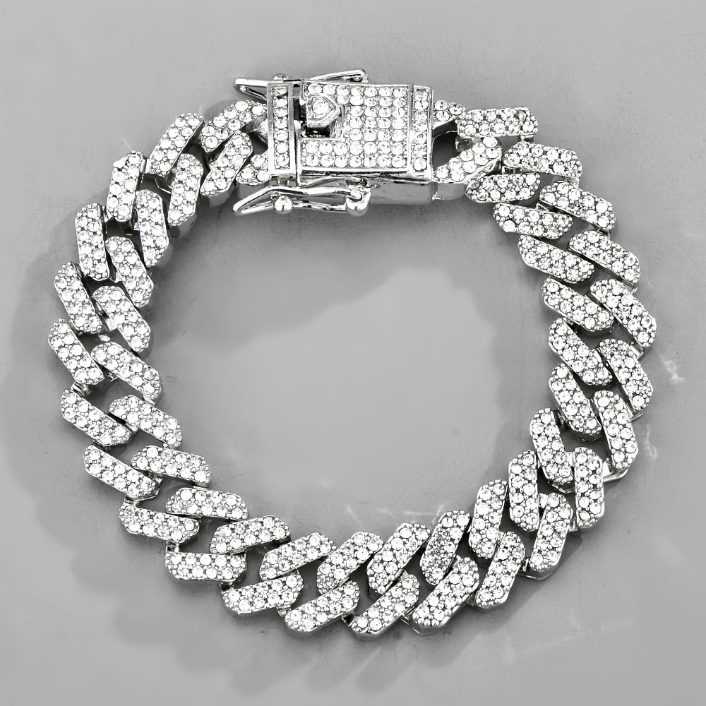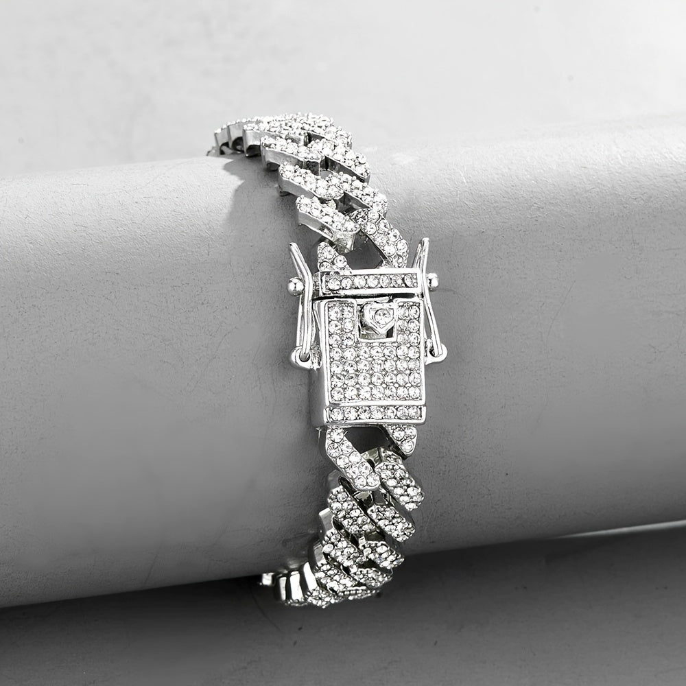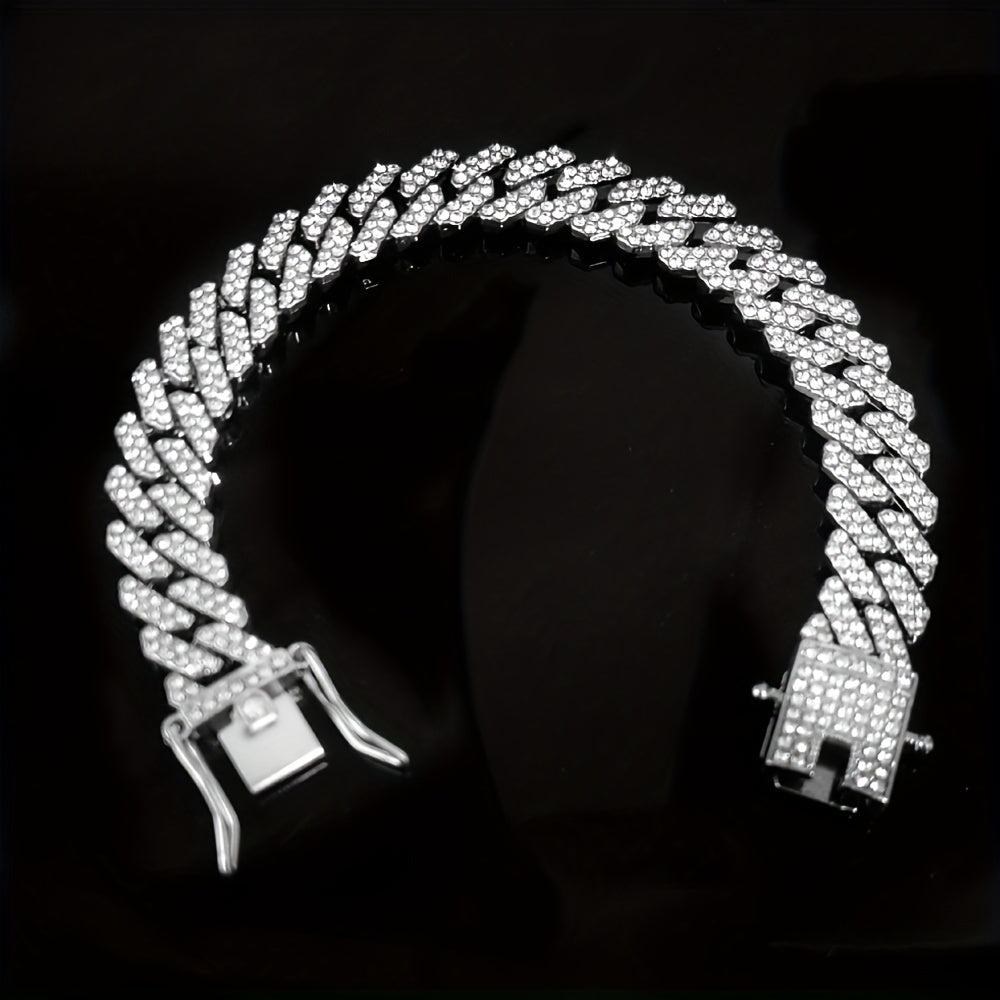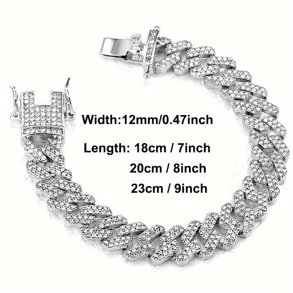 Upgrade your style with this 12mm iced out Cuban link chain bracelet featuring dazzling rhinestones. Perfect for hip hop and punk fashion enthusiasts.