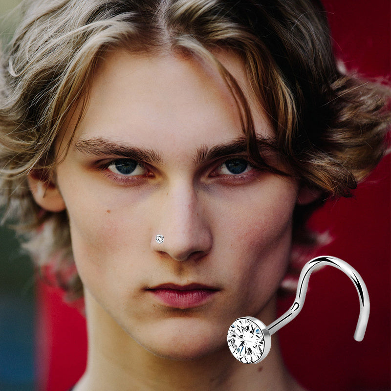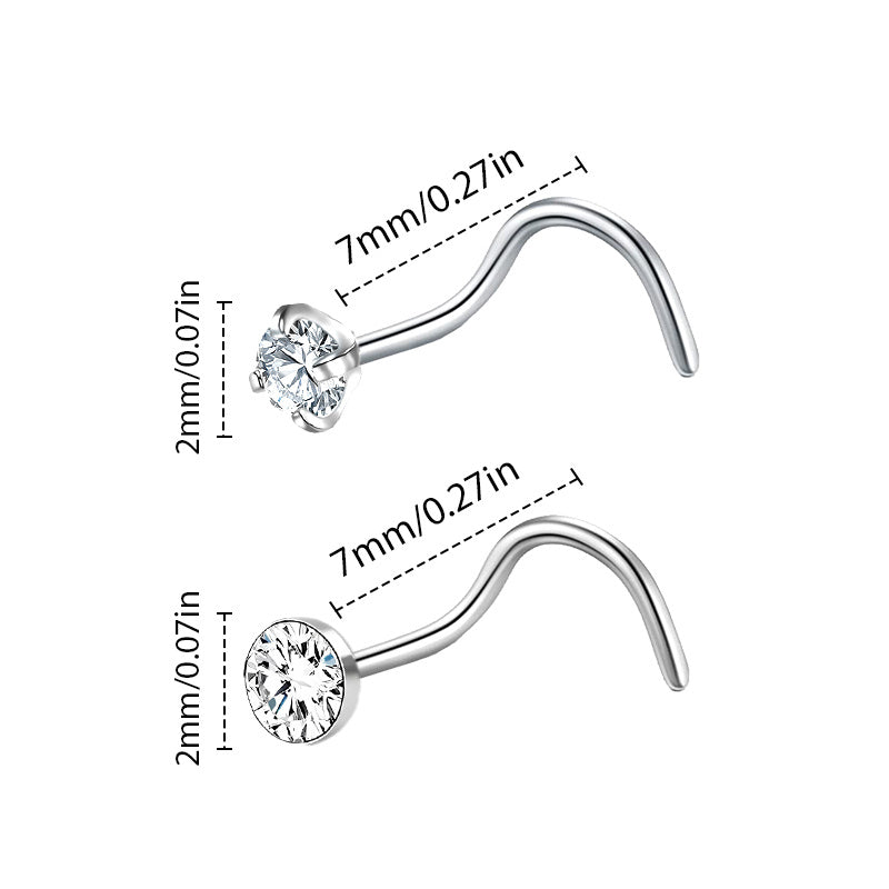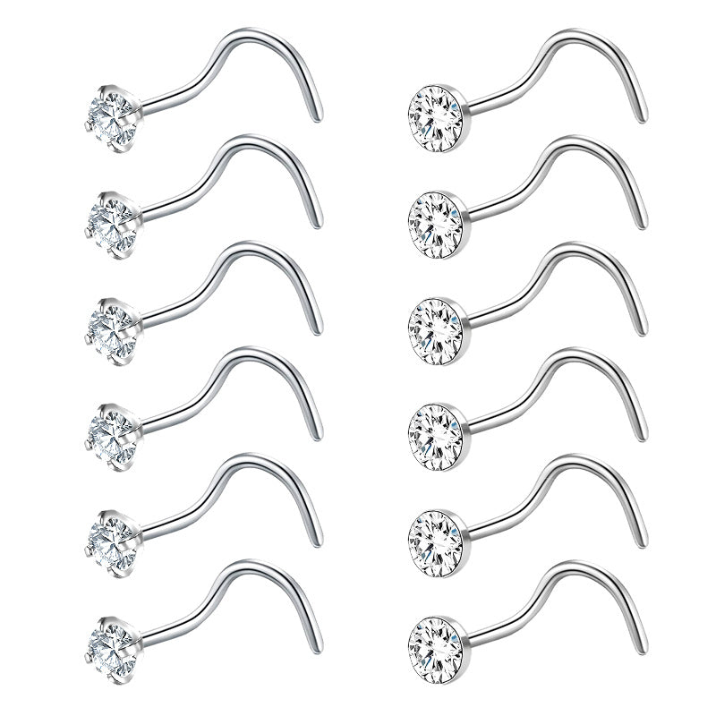 Set of 12 steel nose rings for men with 2mm CZ nose screw studs. Perfect for nostril piercings and body jewelry. Each ring is in an S shape design.