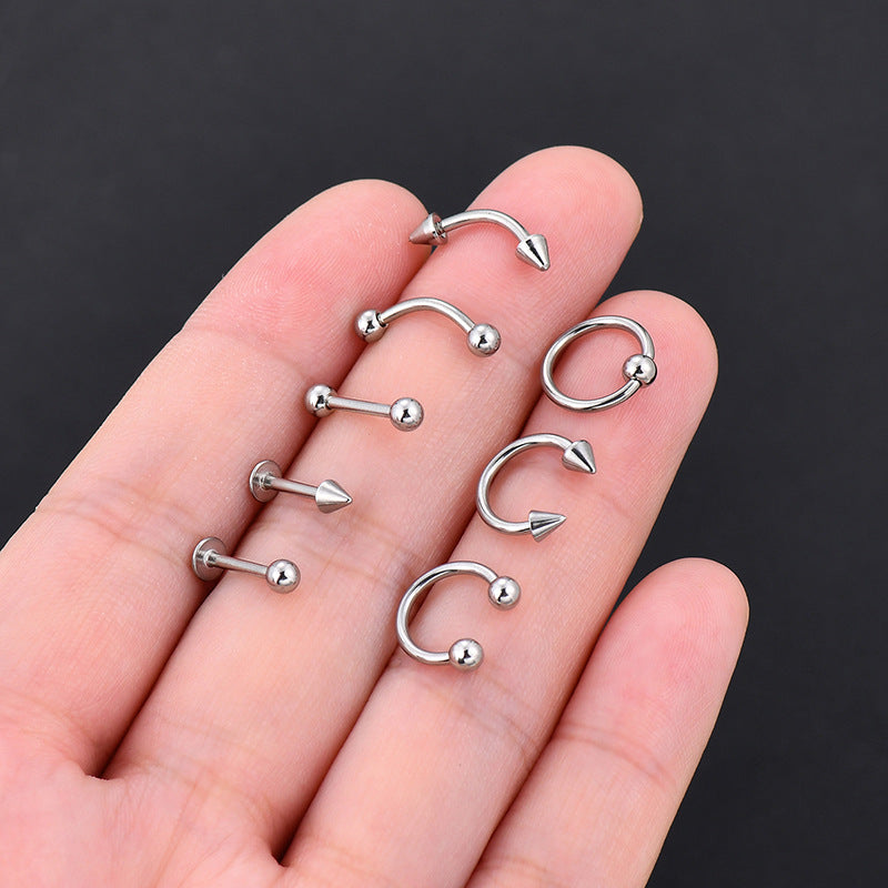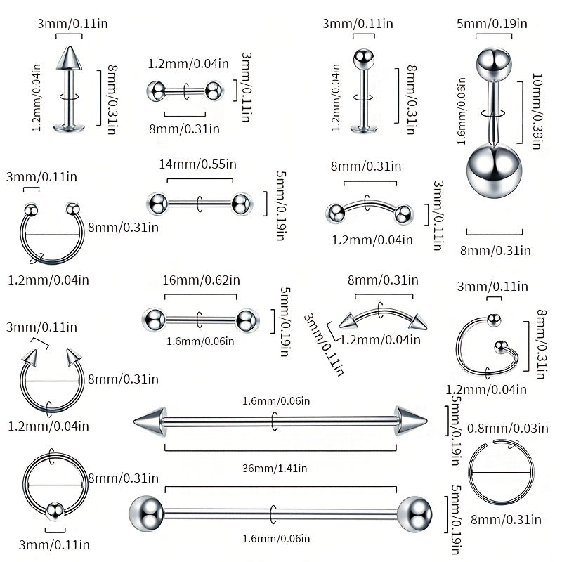 This set includes various sizes of piercing jewelry for nose, septum, ear cartilage, tragus, and more. Ideal for both personal and professional use.