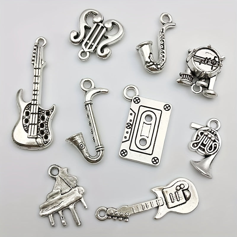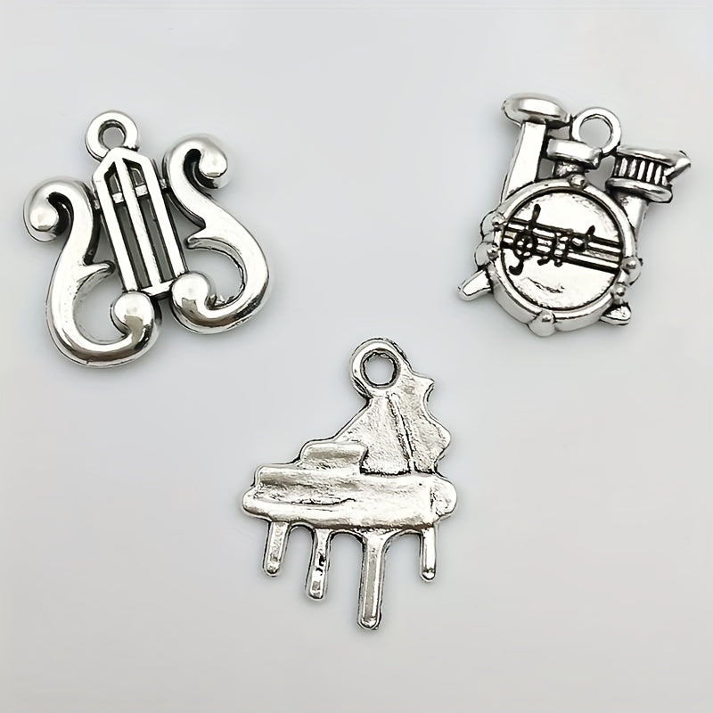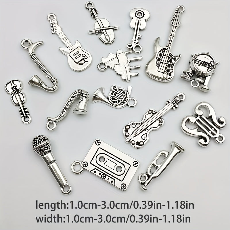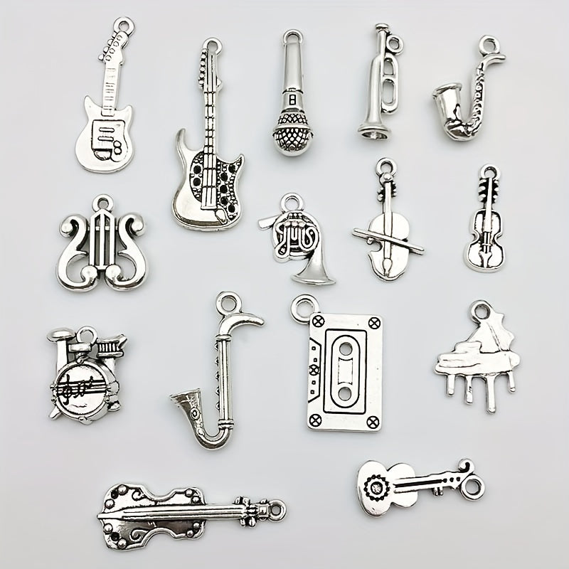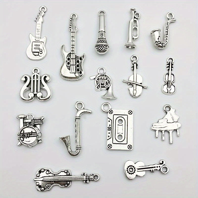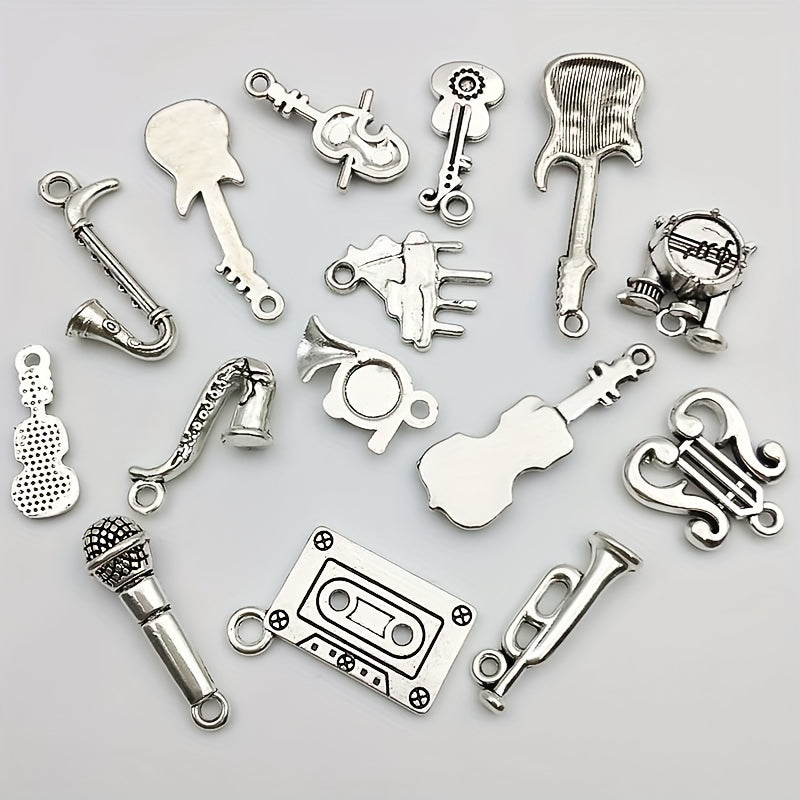 Create stunning jewelry pieces with this 15-piece set of zinc alloy pendants in antique silver finish. Featuring musical instrument and symbol shapes, perfect for necklaces, bracelets, and earrings.
