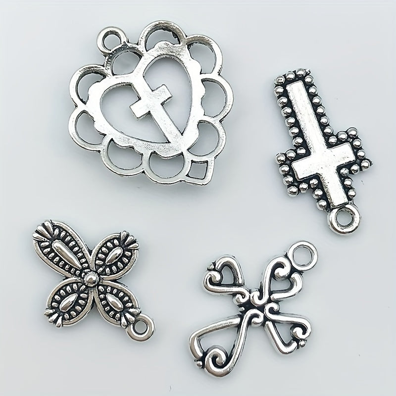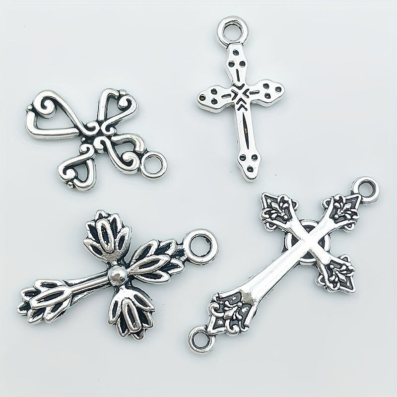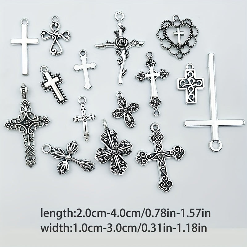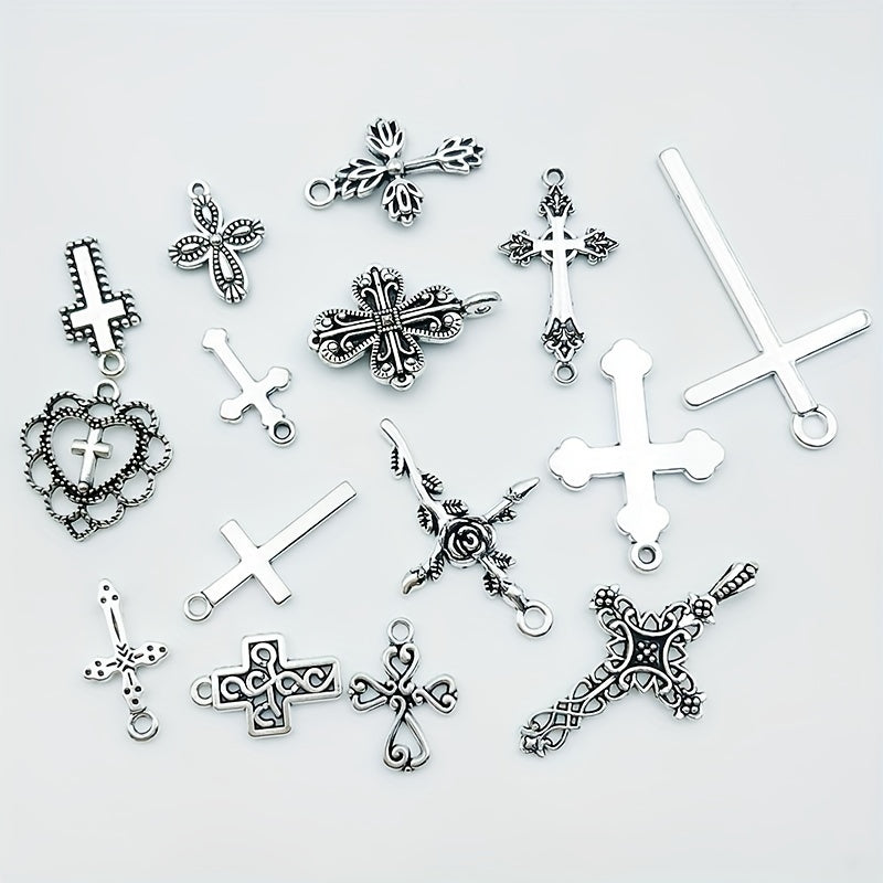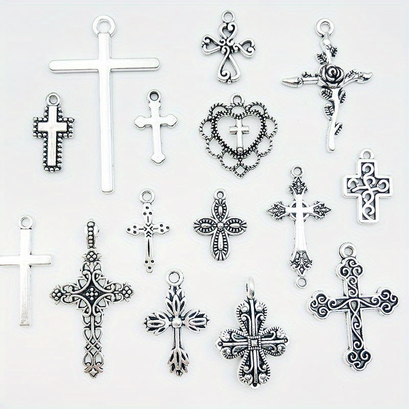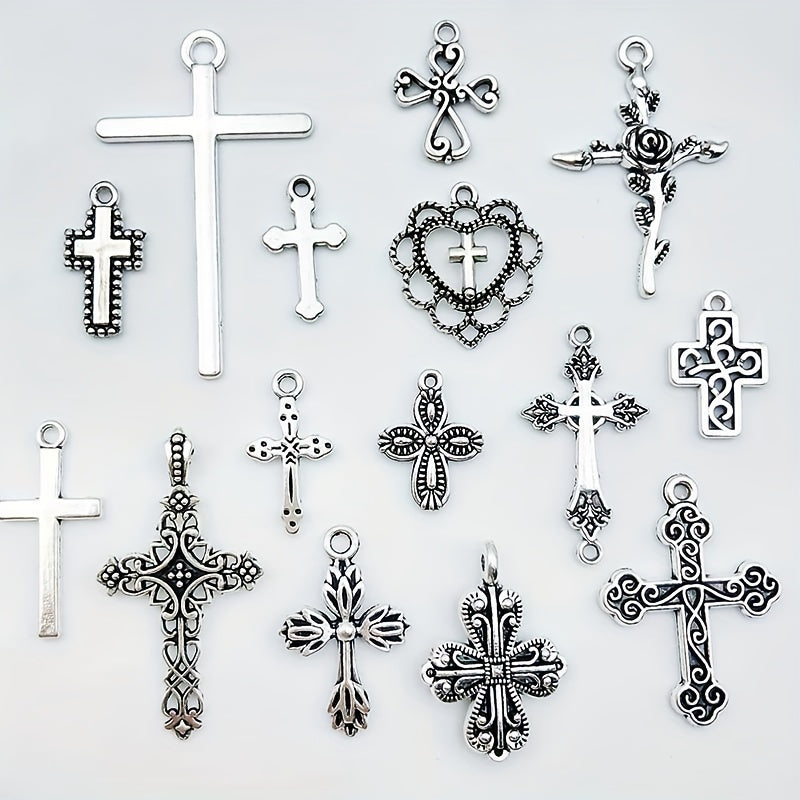 This set includes 15 mixed styles of antique silvery cross alloy pendants that can be used for making earrings, bracelets, necklaces, and other accessories.